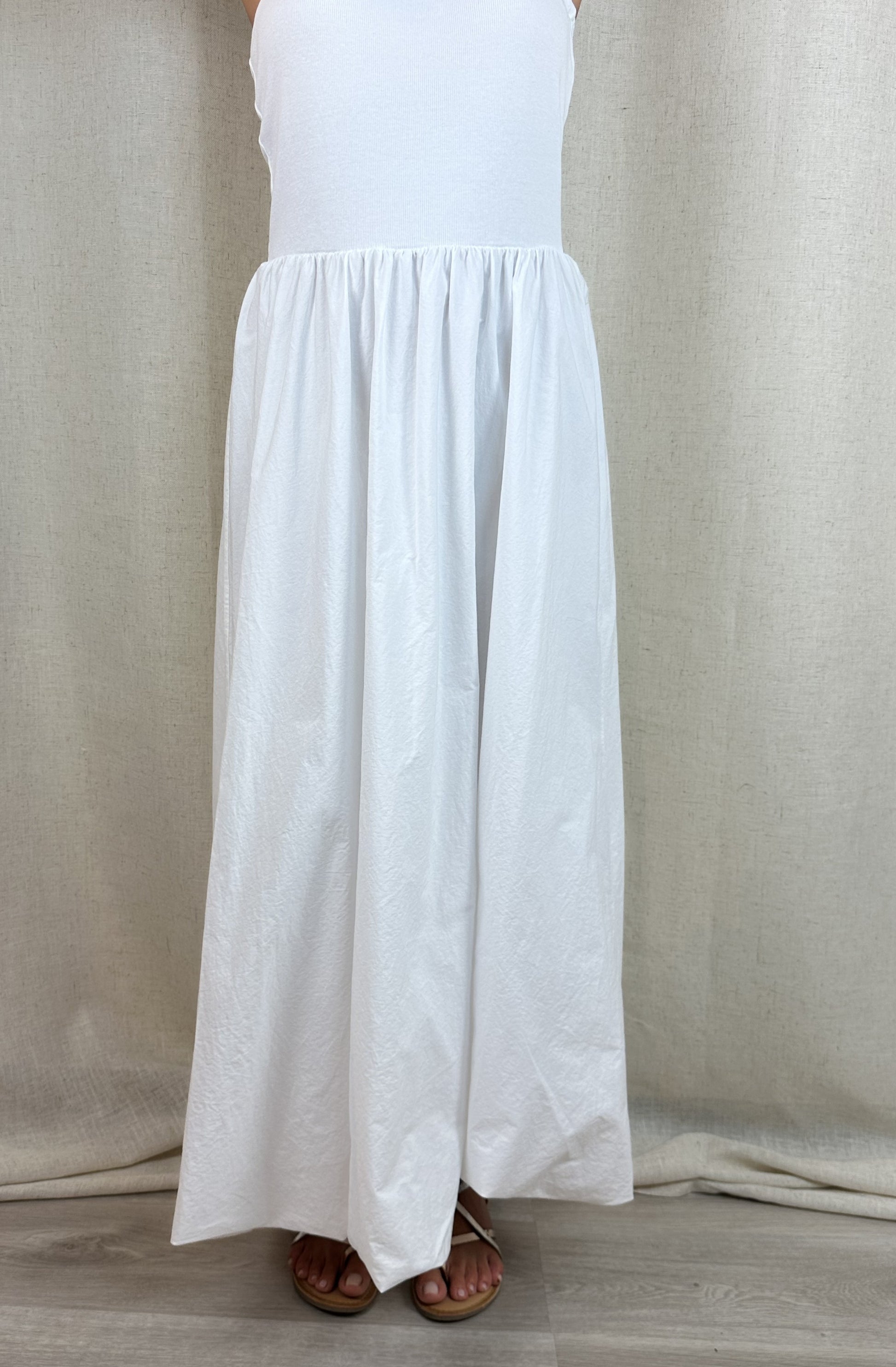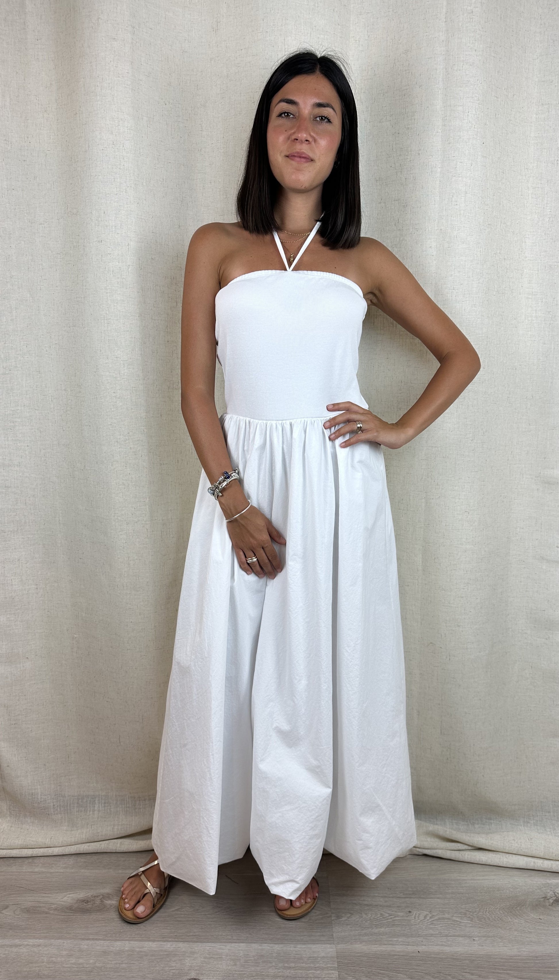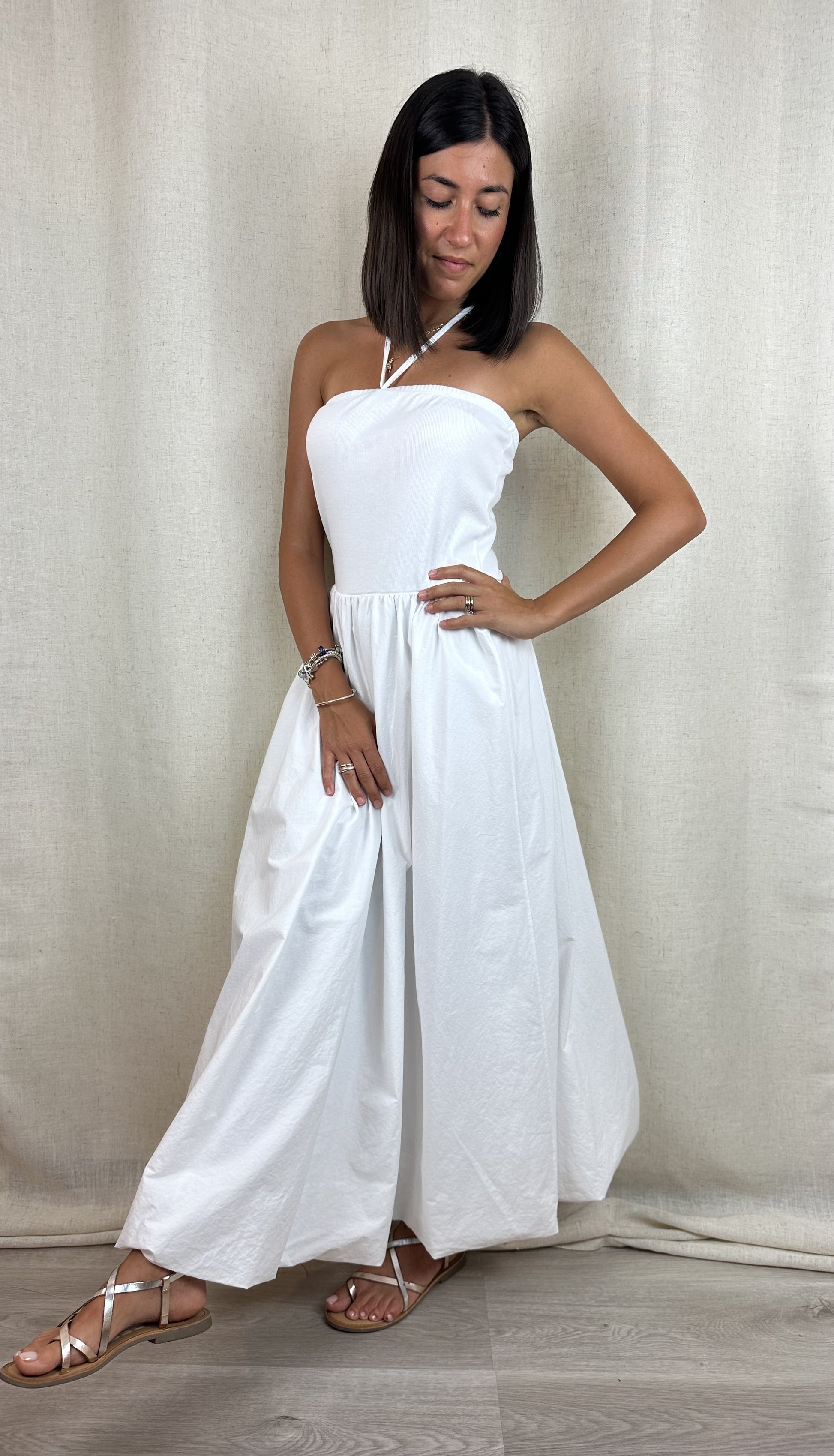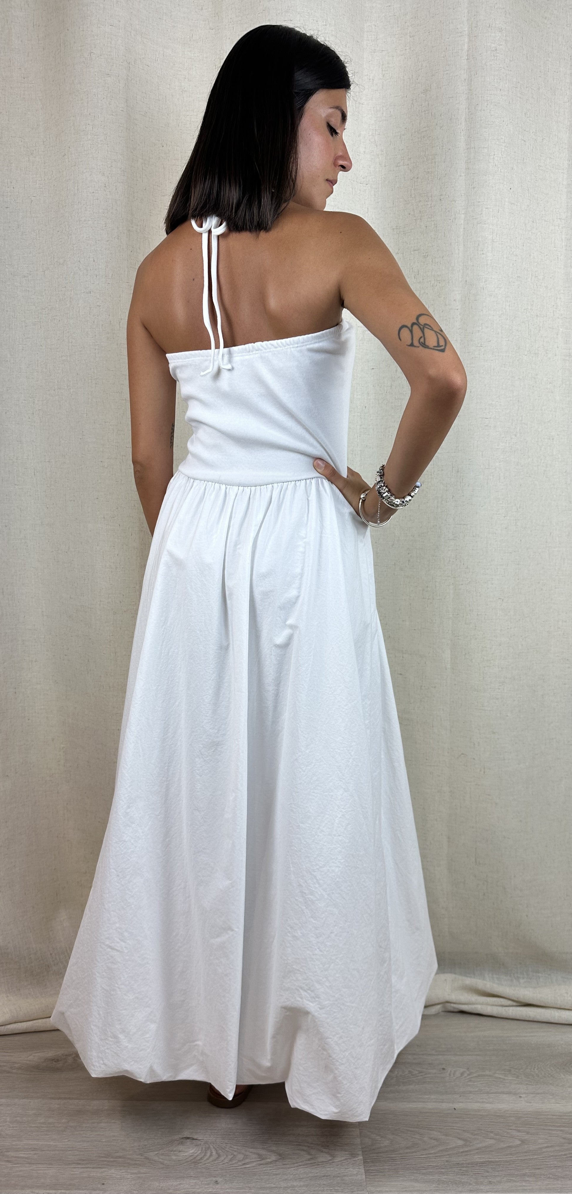 Abito bianco forma leggermente a palloncino sulla parte finale, 95% cotone 5% elastan.