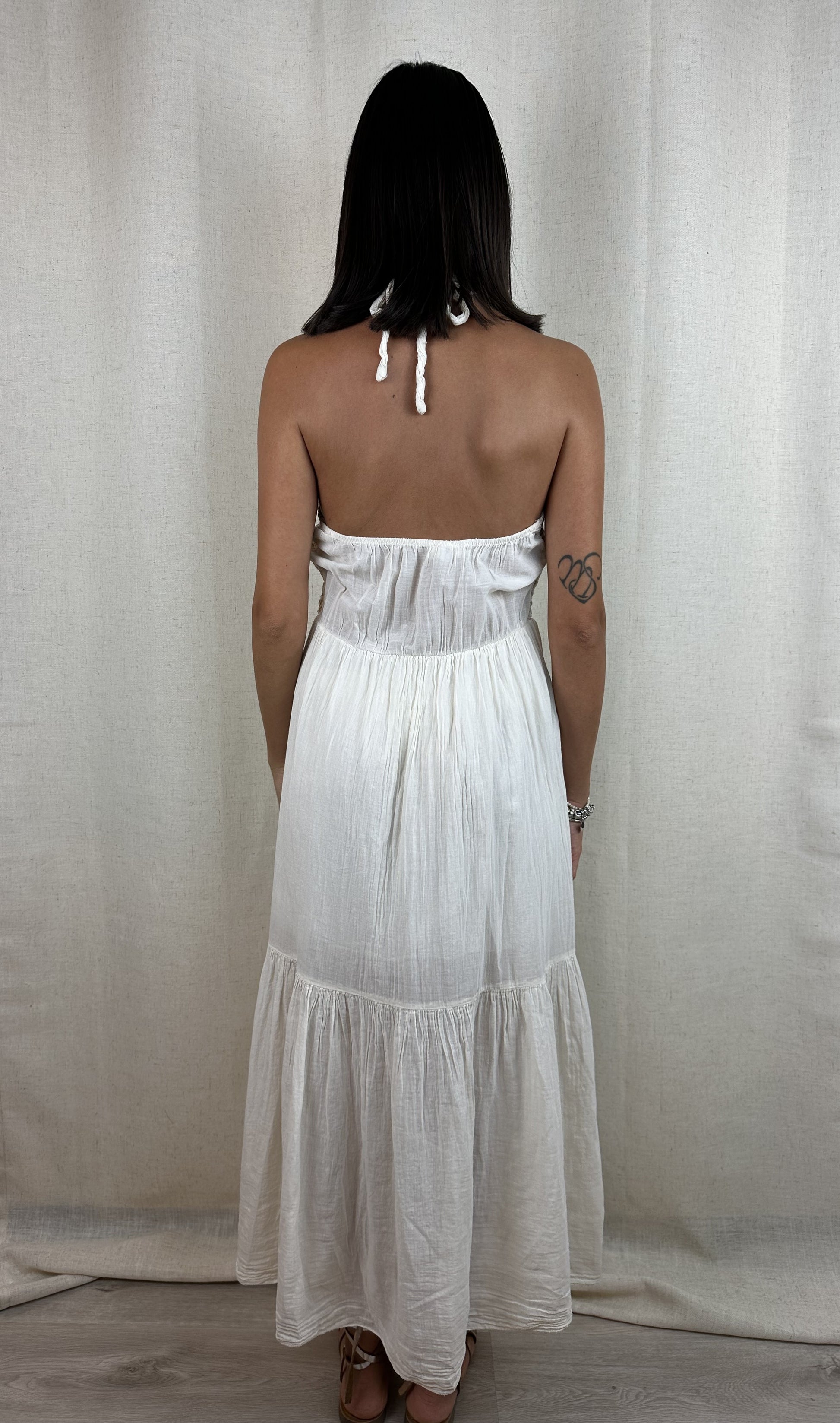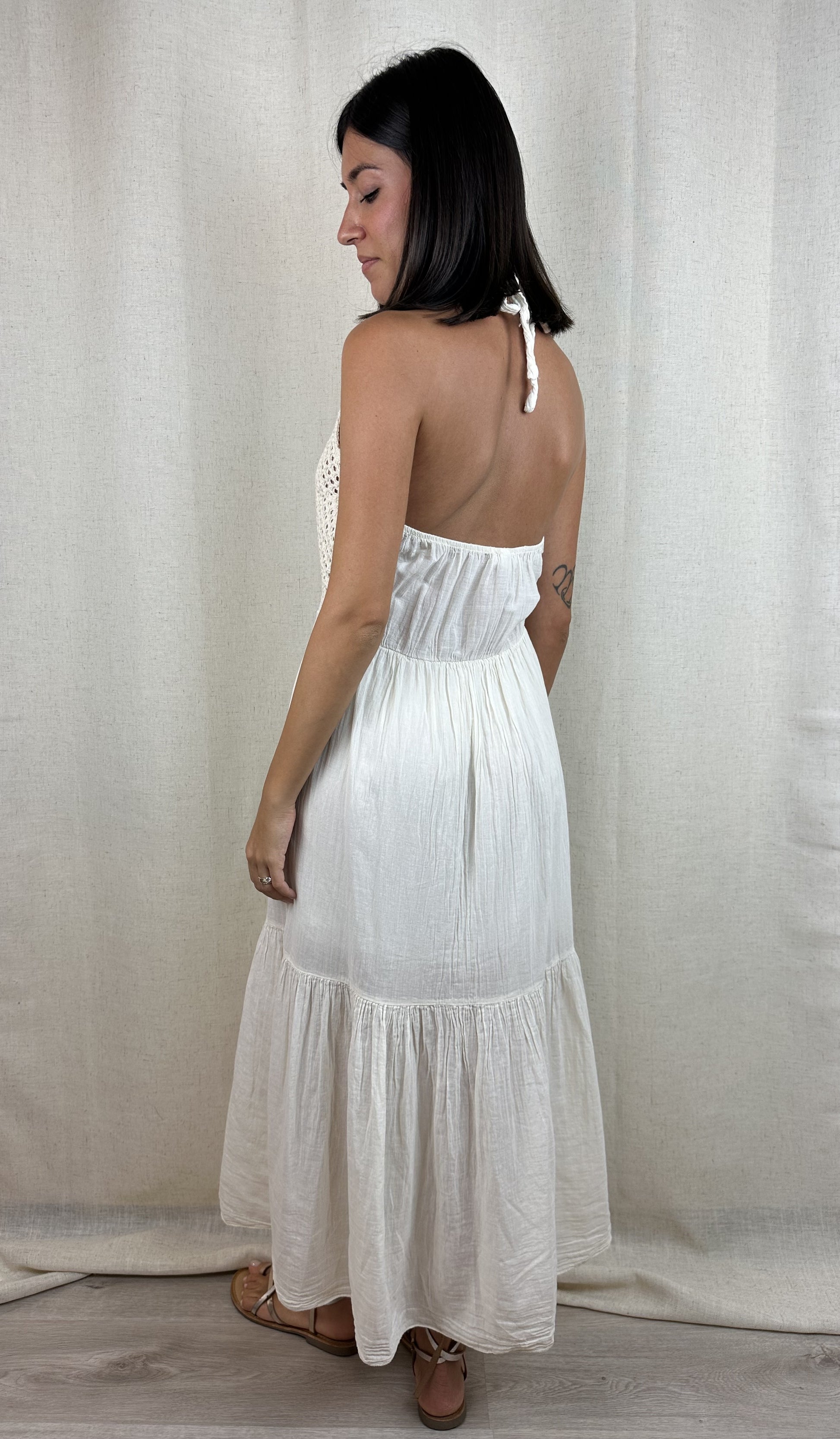 Abito in 100% cotone color burro, parte superiore fatta a triangolo con chiusura dietro al collo in lavorazione crochet, fodera interna a metà gamba che lo rende coprente, anche sulla parte del seno. Elastico sottile nella parte dietro del busto che lo rende elasticizzato e adattabile a molte taglie e circonferenze del busto.