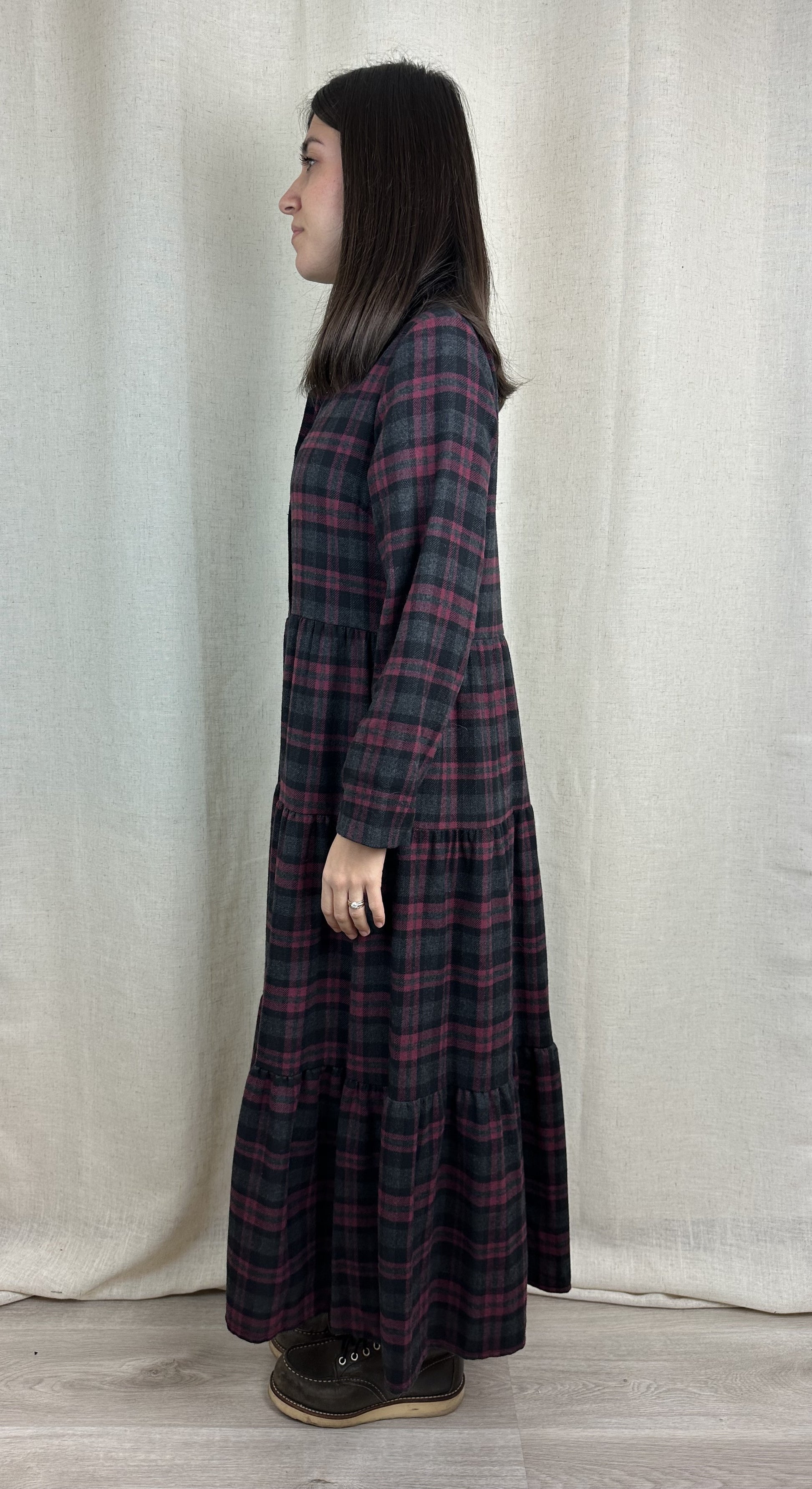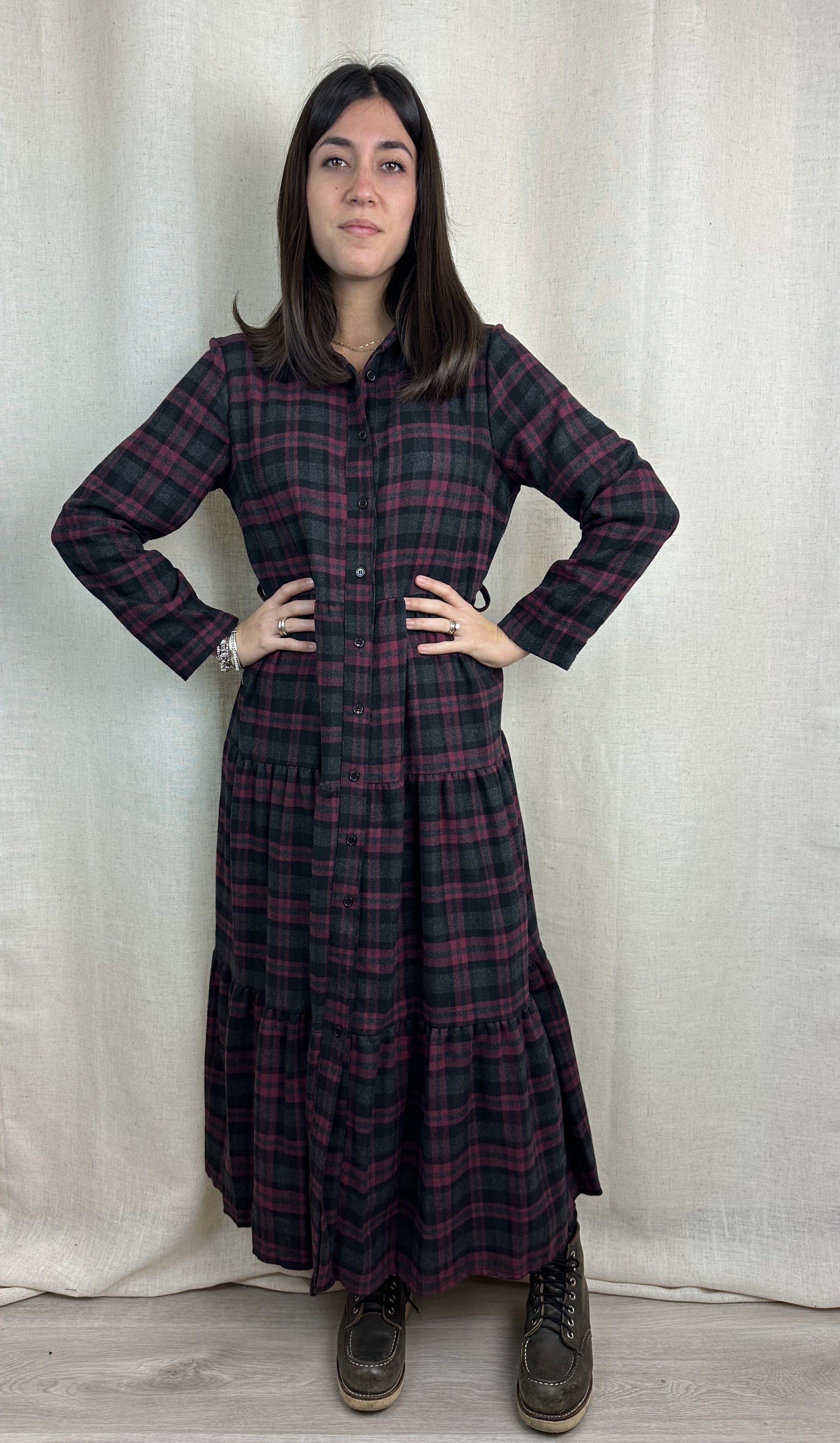Abito lungo 3/4 forma chemisier con balza finale, bottoncini su tutta la lunghezza. 80% cotone 20% poliestere.