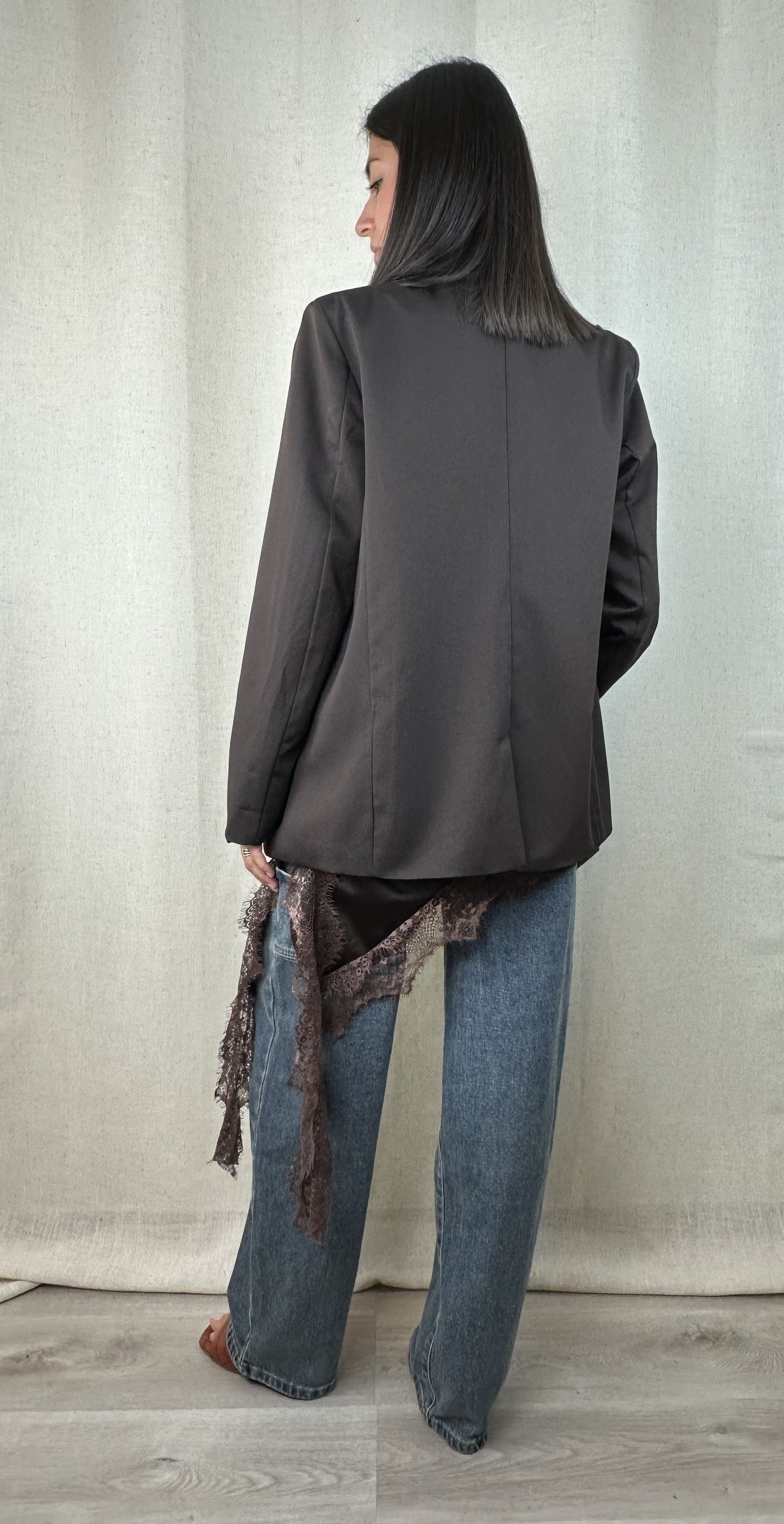 Abito satin con pizzo color marrone, forma asimmetrica e spalline sottili.