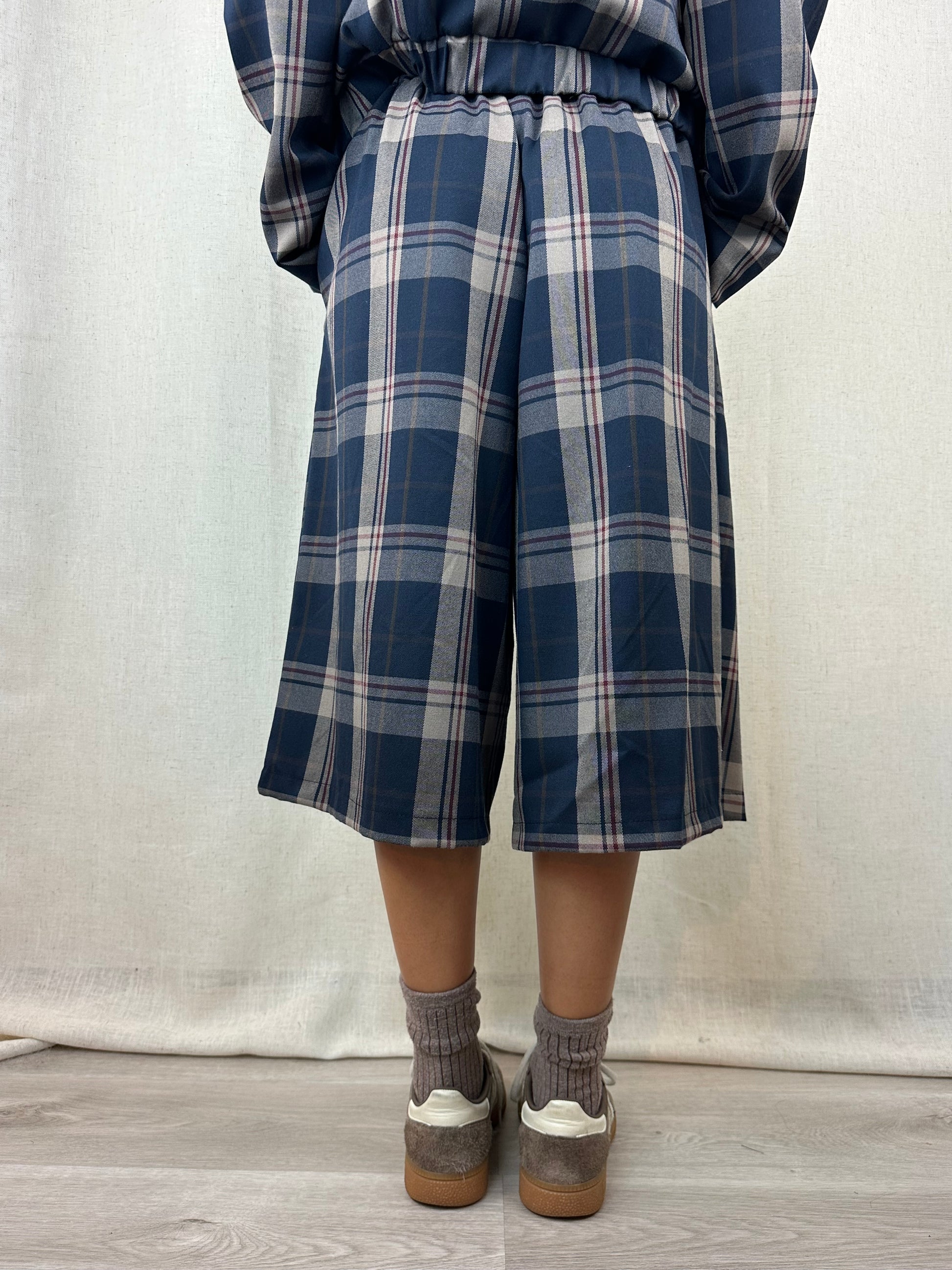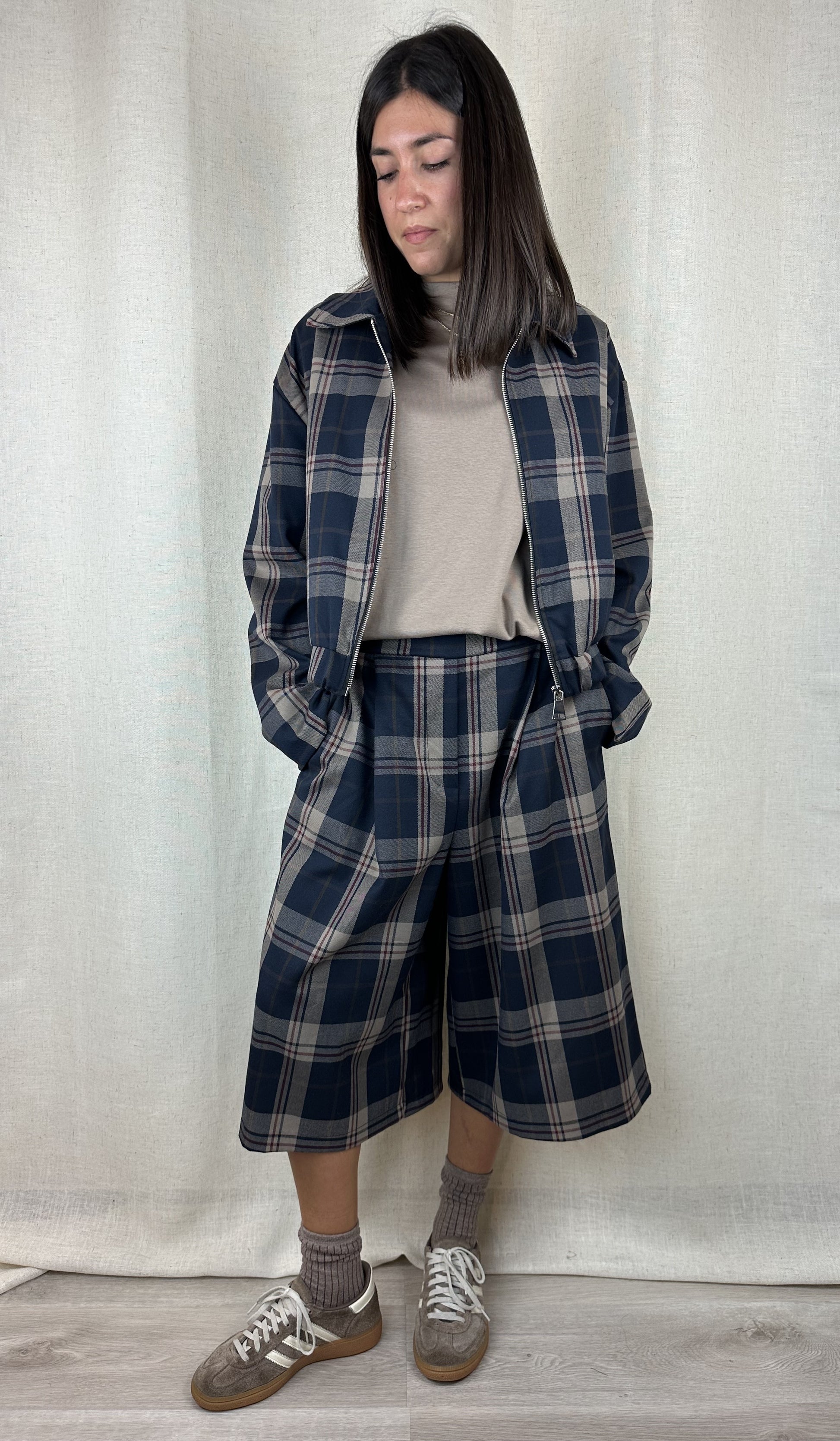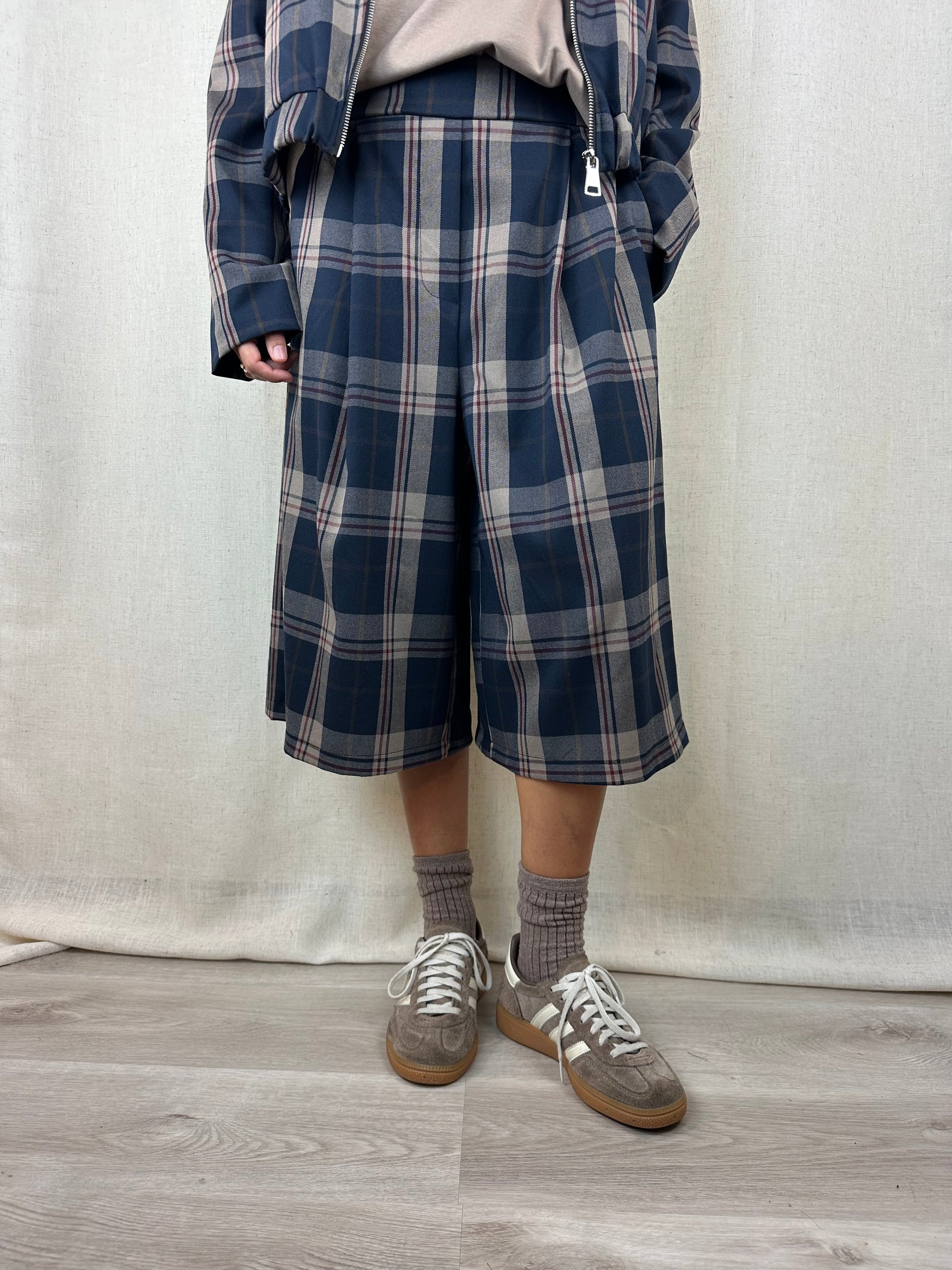 Bermuda a quadri con elastico in vita (solo nella parte dietro), pense e tasche e cintura in ecopelle in dotazione.