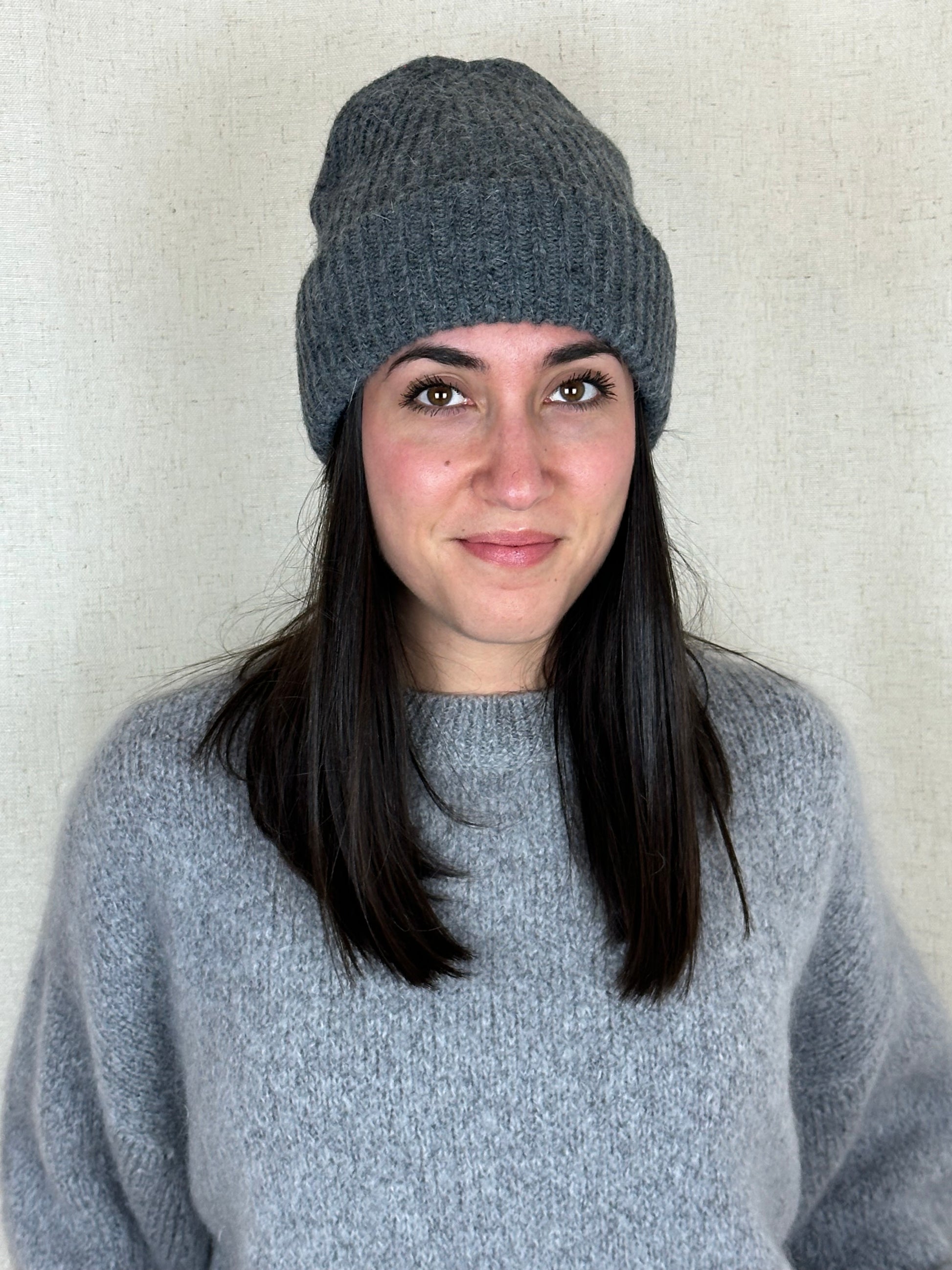 berretto tinta unita, taglia unica, 50% viscosa 40% angora 10% cashmere, colore antracite.