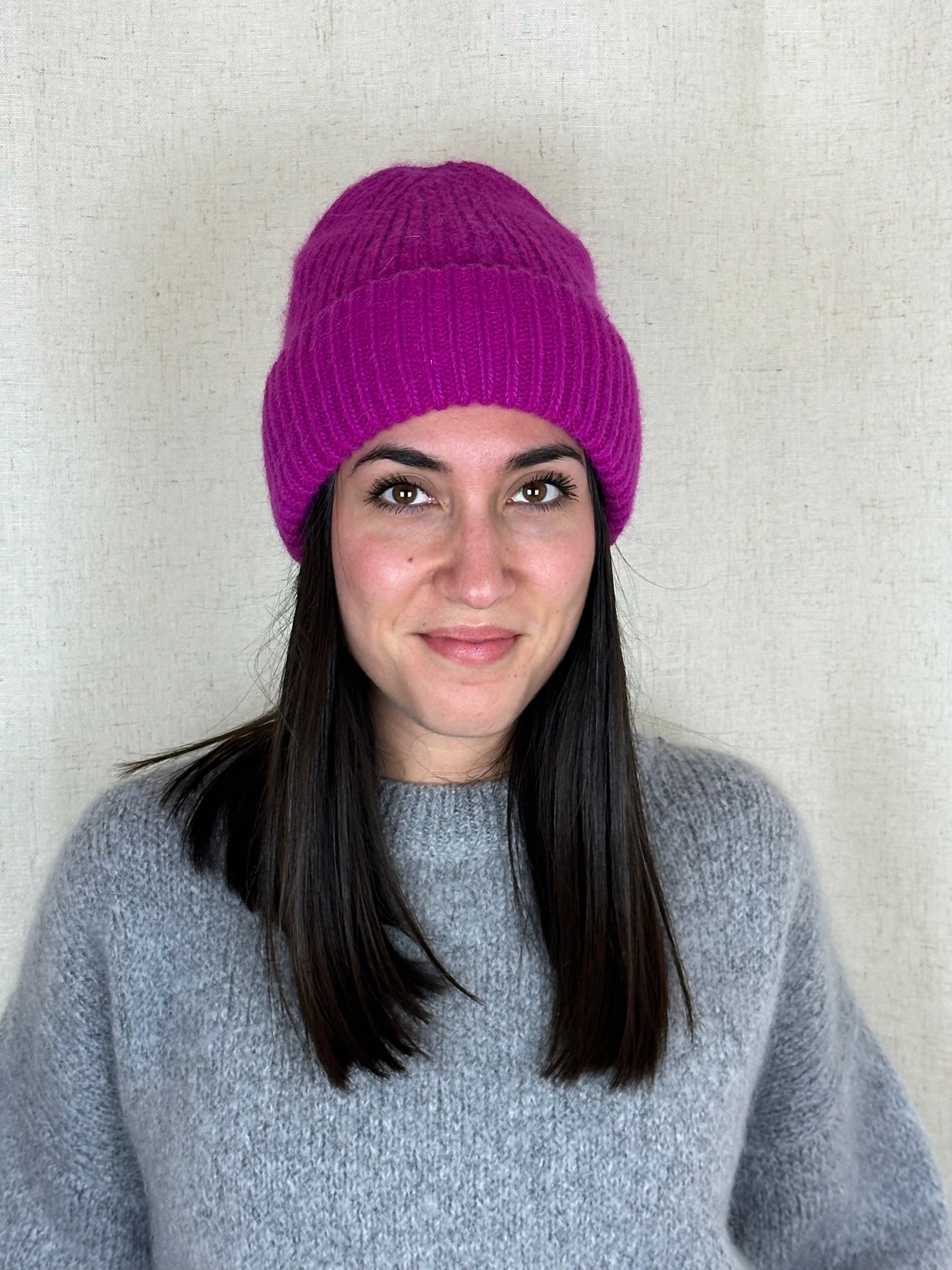 berretto tinta unita, taglia unica, 50% viscosa 40% angora 10% cashmere, colore ciclamino.