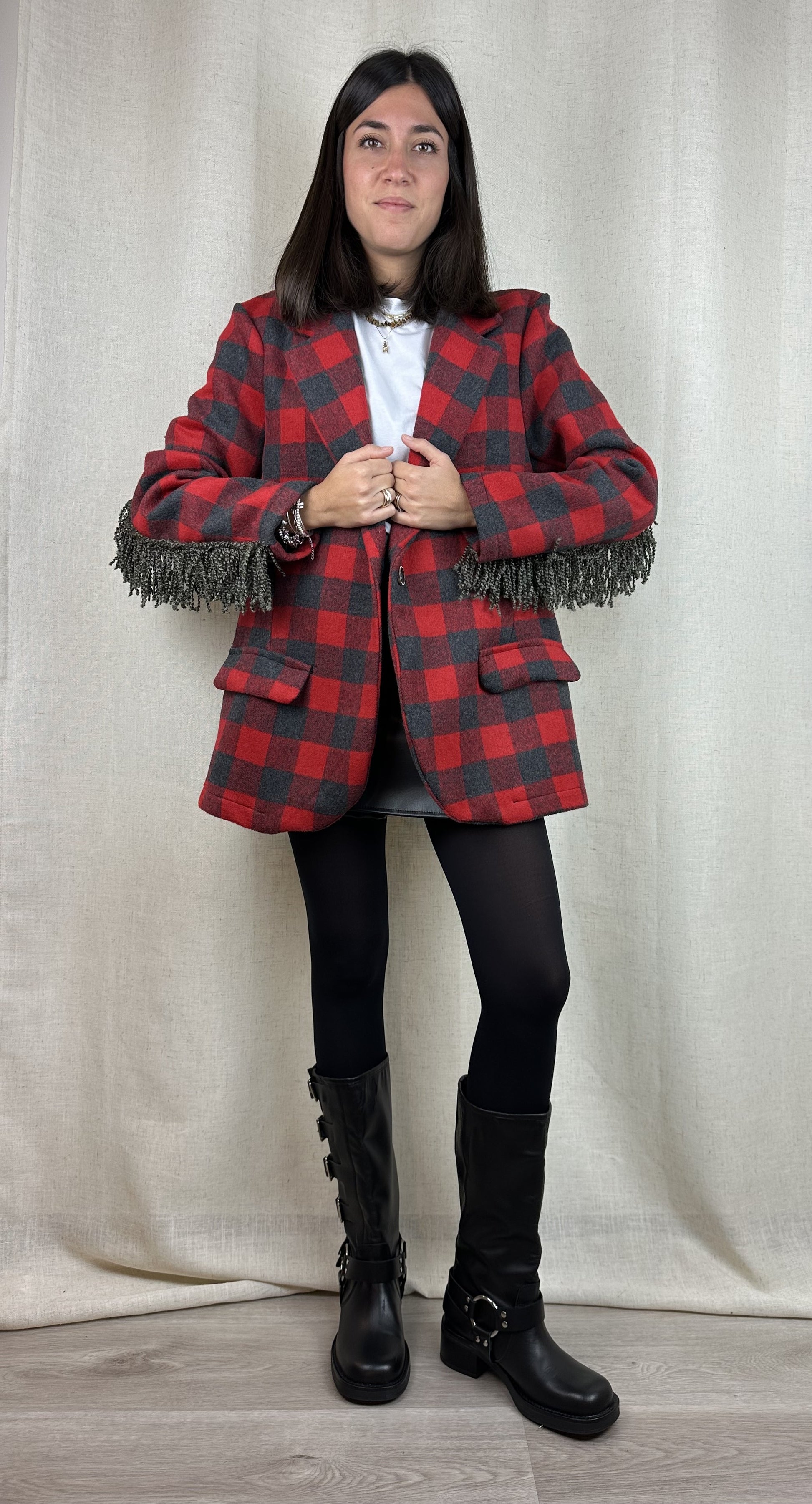 Fantasia a quadri in colore rosso e grigio, con inserto in frangia di lana realizzato e cucito a mano.