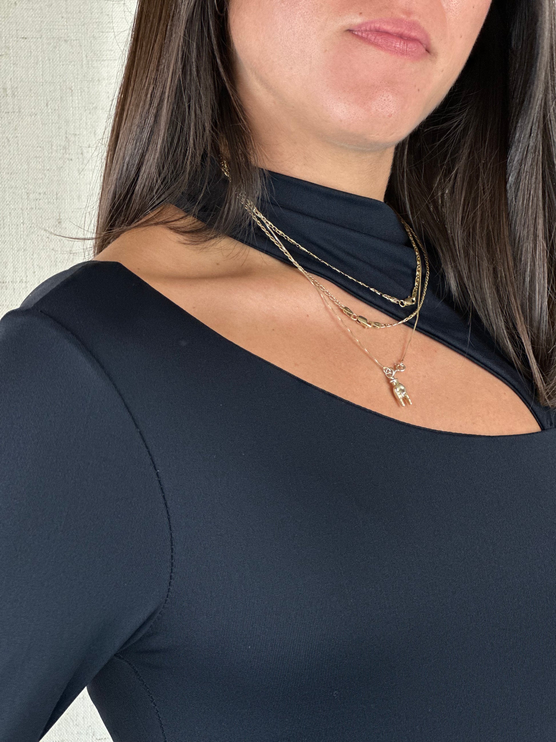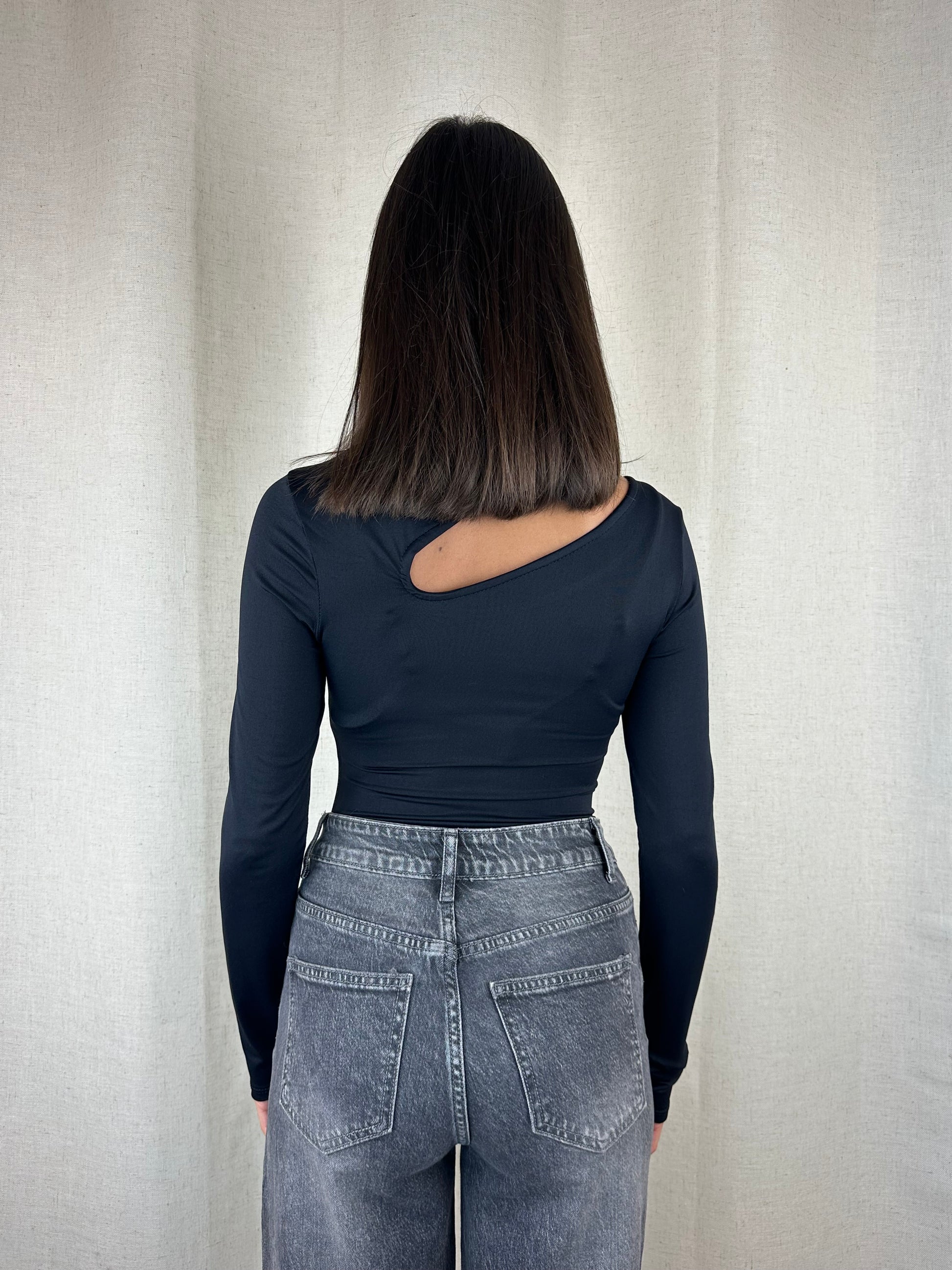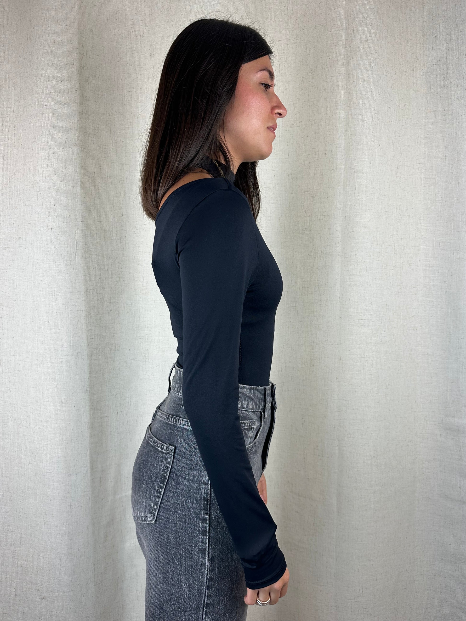 Body nero in lycra con scollo asimmetrico. 90% nylon 10% elastan.