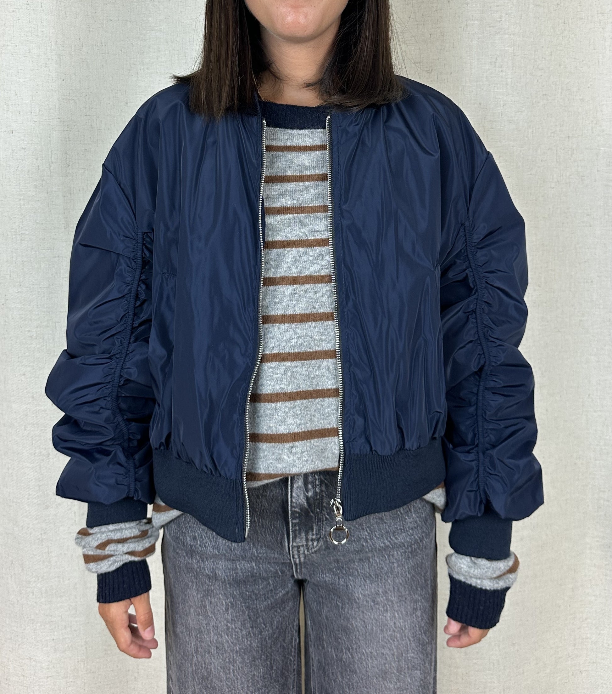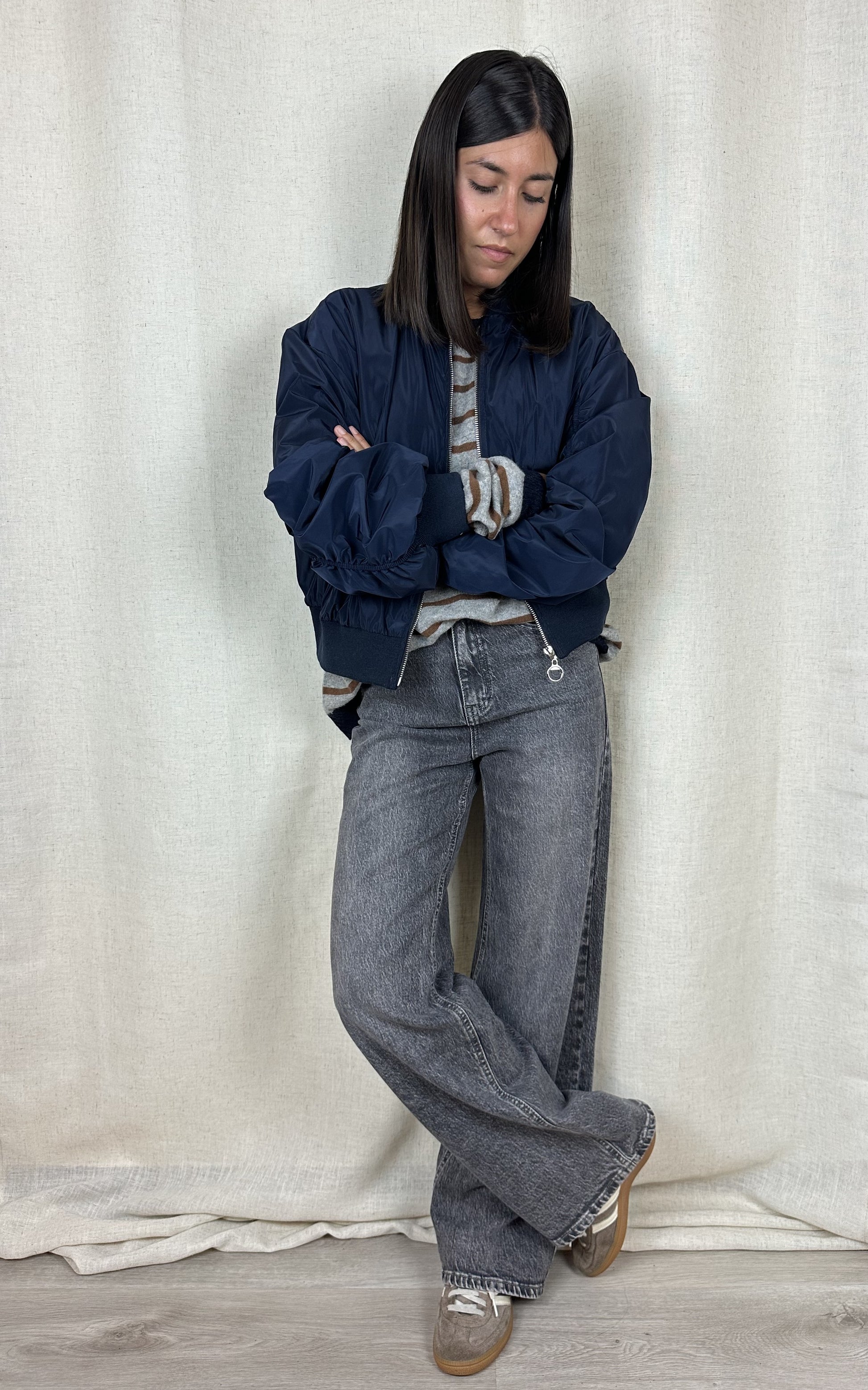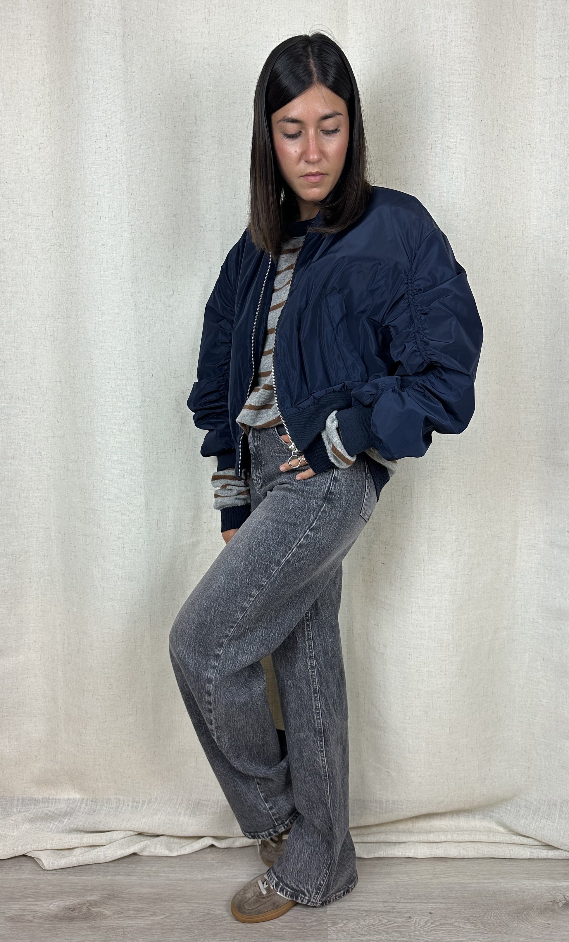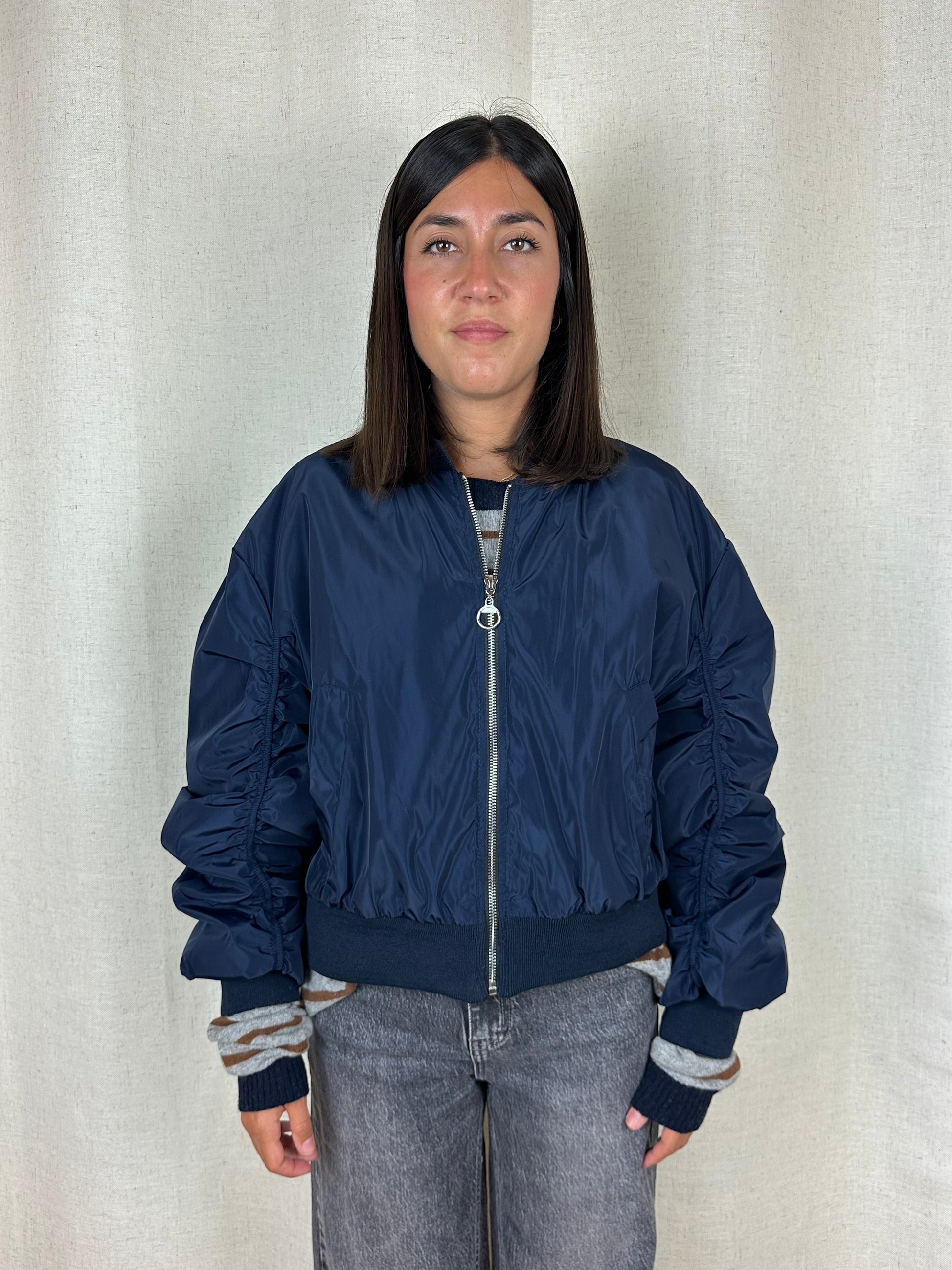 Giacca bomber blu, con fodera interna, 100% poliestere, arricciatura sulla manica, chiusura con cerniera.
