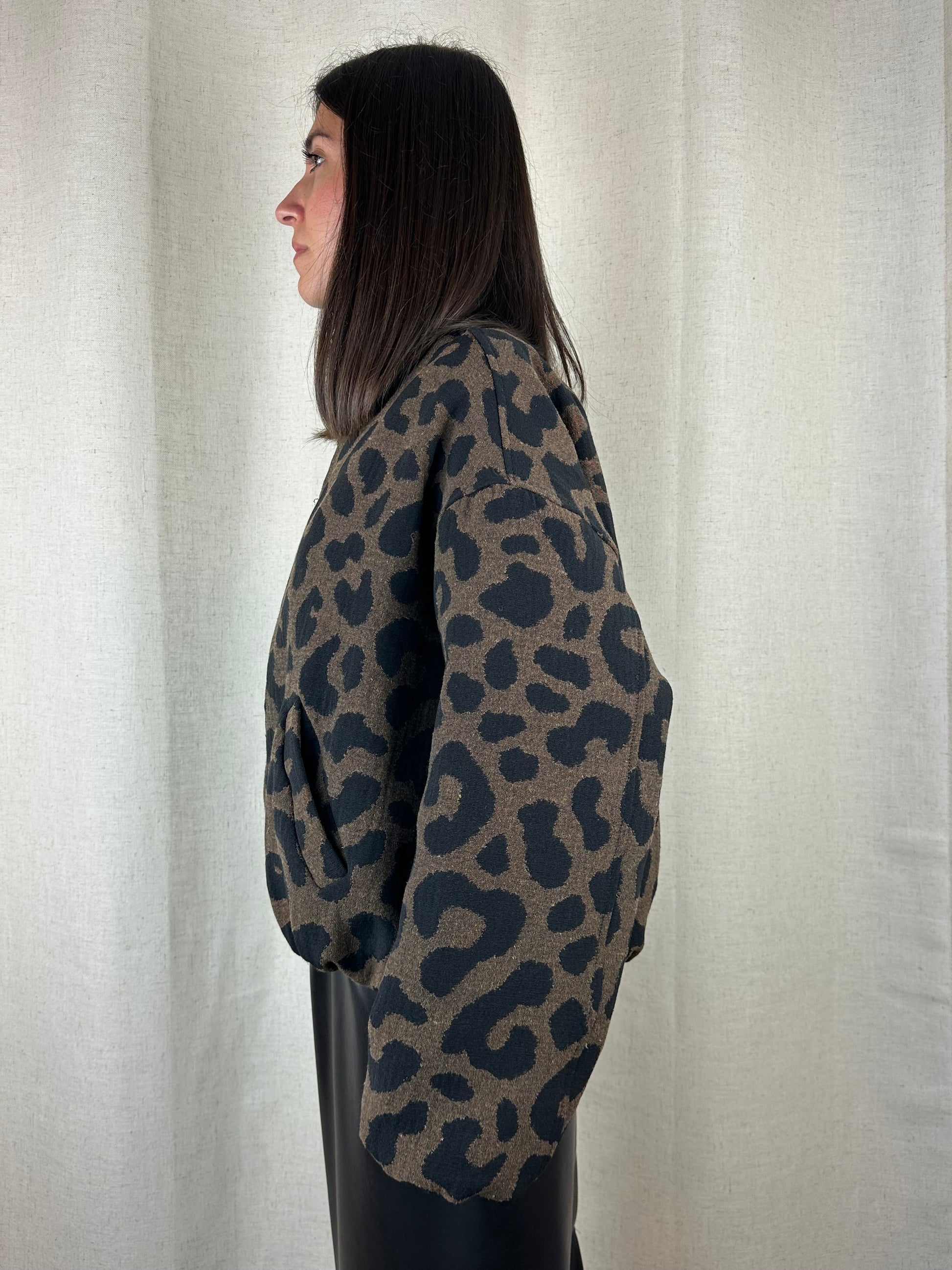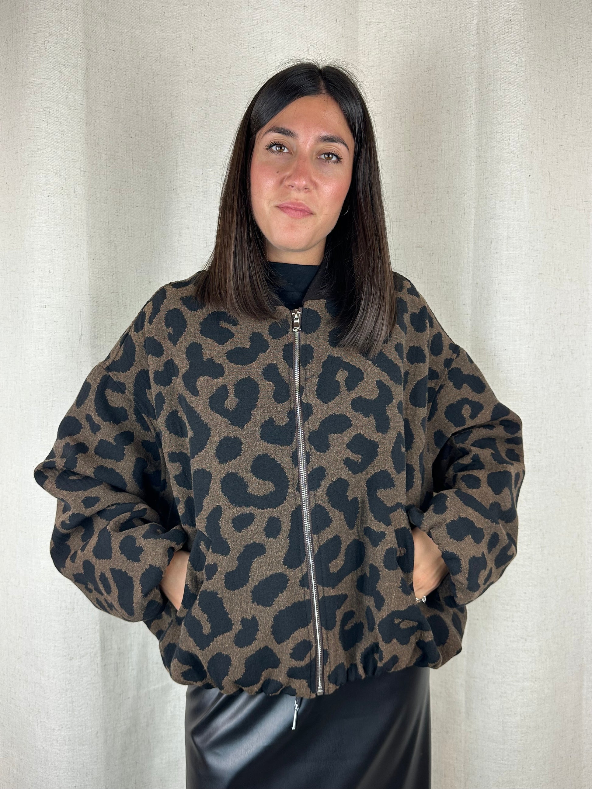 Giacca a bomber in tessuto fantasia leopardata color beige, nero e marrone.