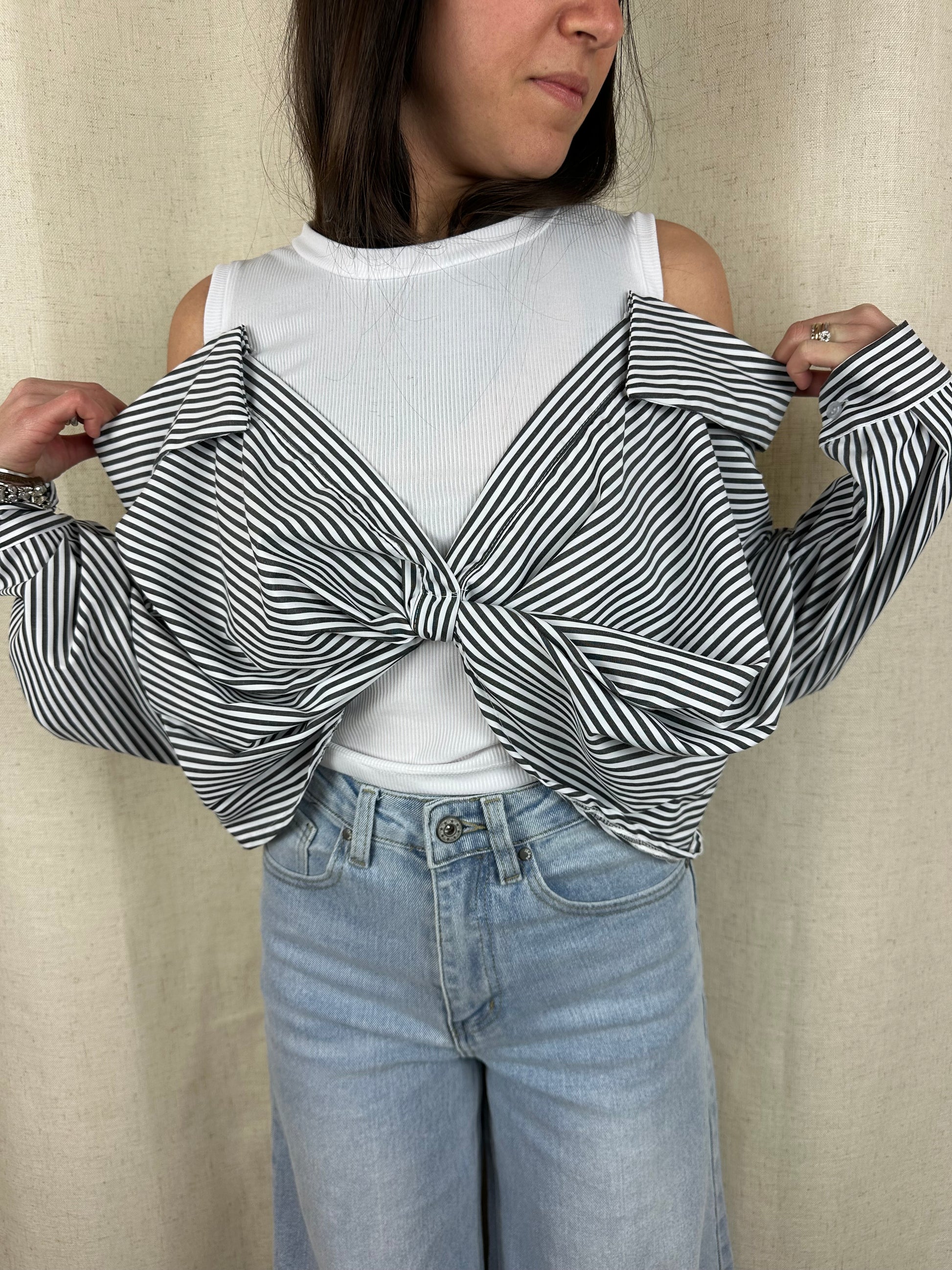 Camicia a barchetta a righe bianca e grigio scuro quasi nero con canotta bianca assemblate insieme (no separabili).