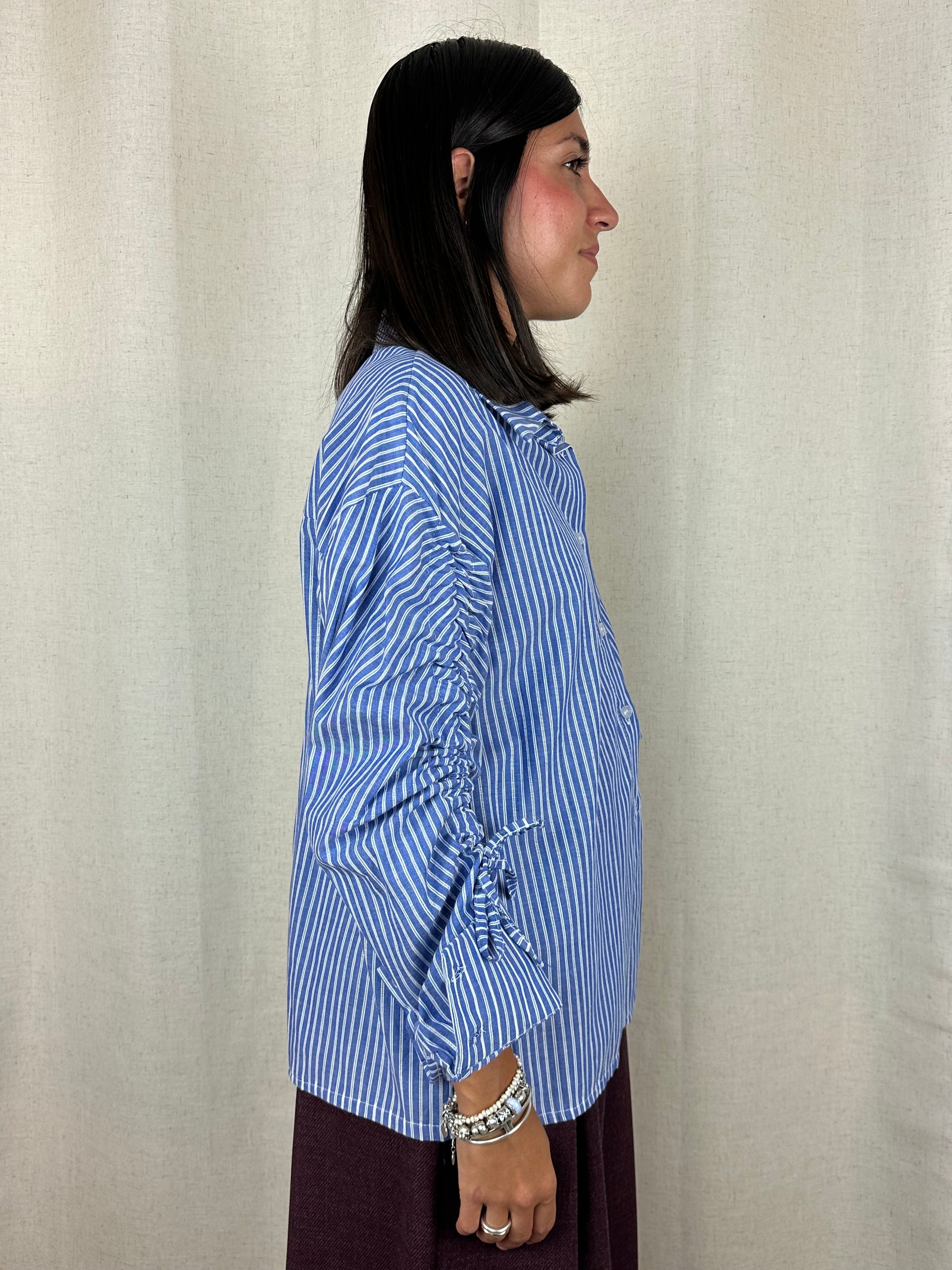 Camicia in 100% cotone, a righe bianca e azzurra con manica arricciata.
