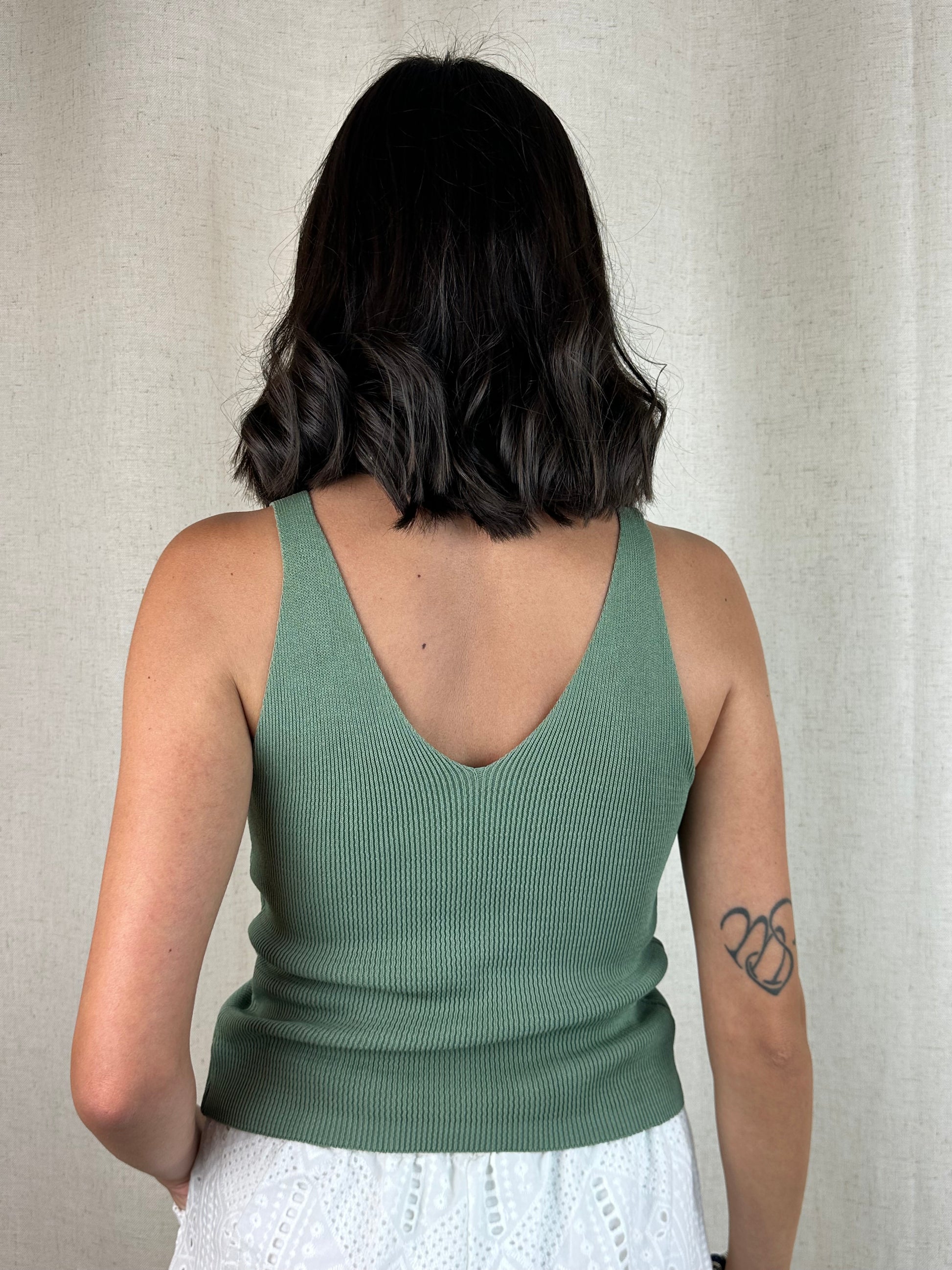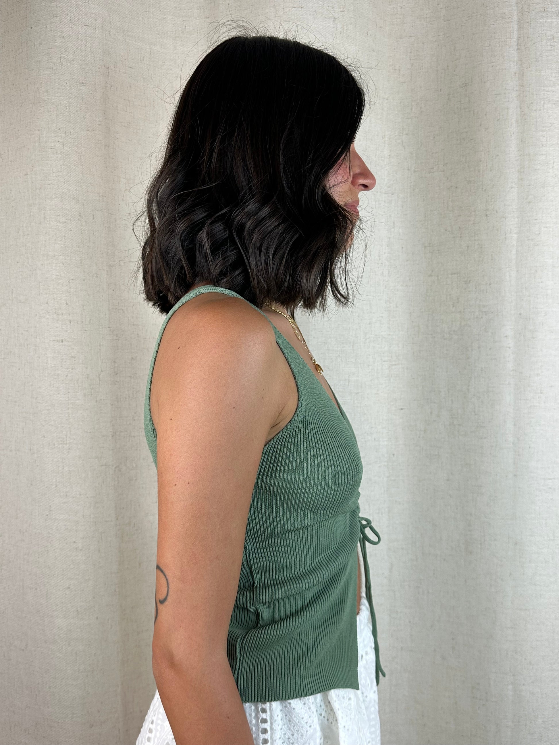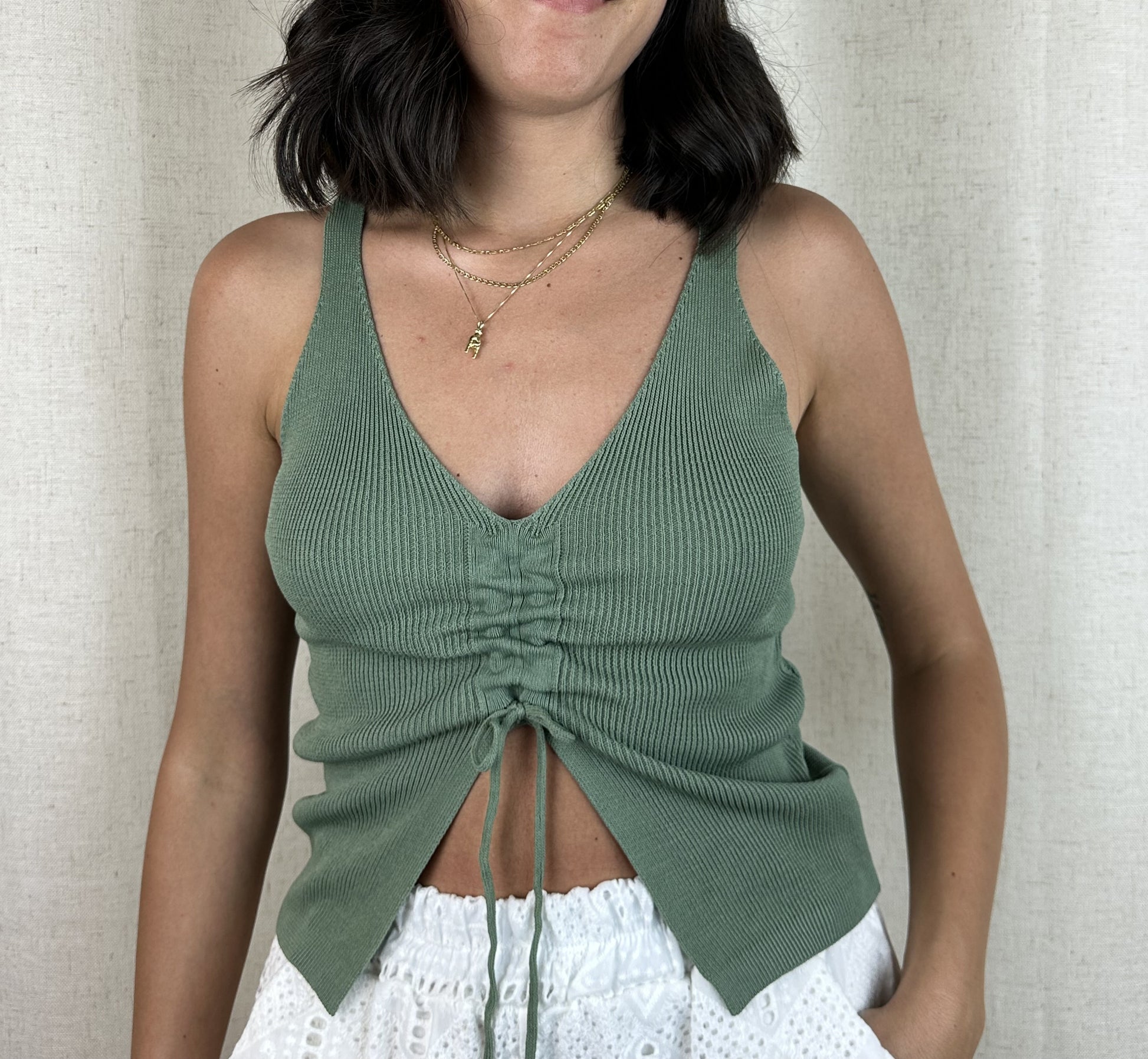Canotta color verde salvia con arricciatura regolabile sulla parte davanti. 37% elastico viscosa 63% viscosa.