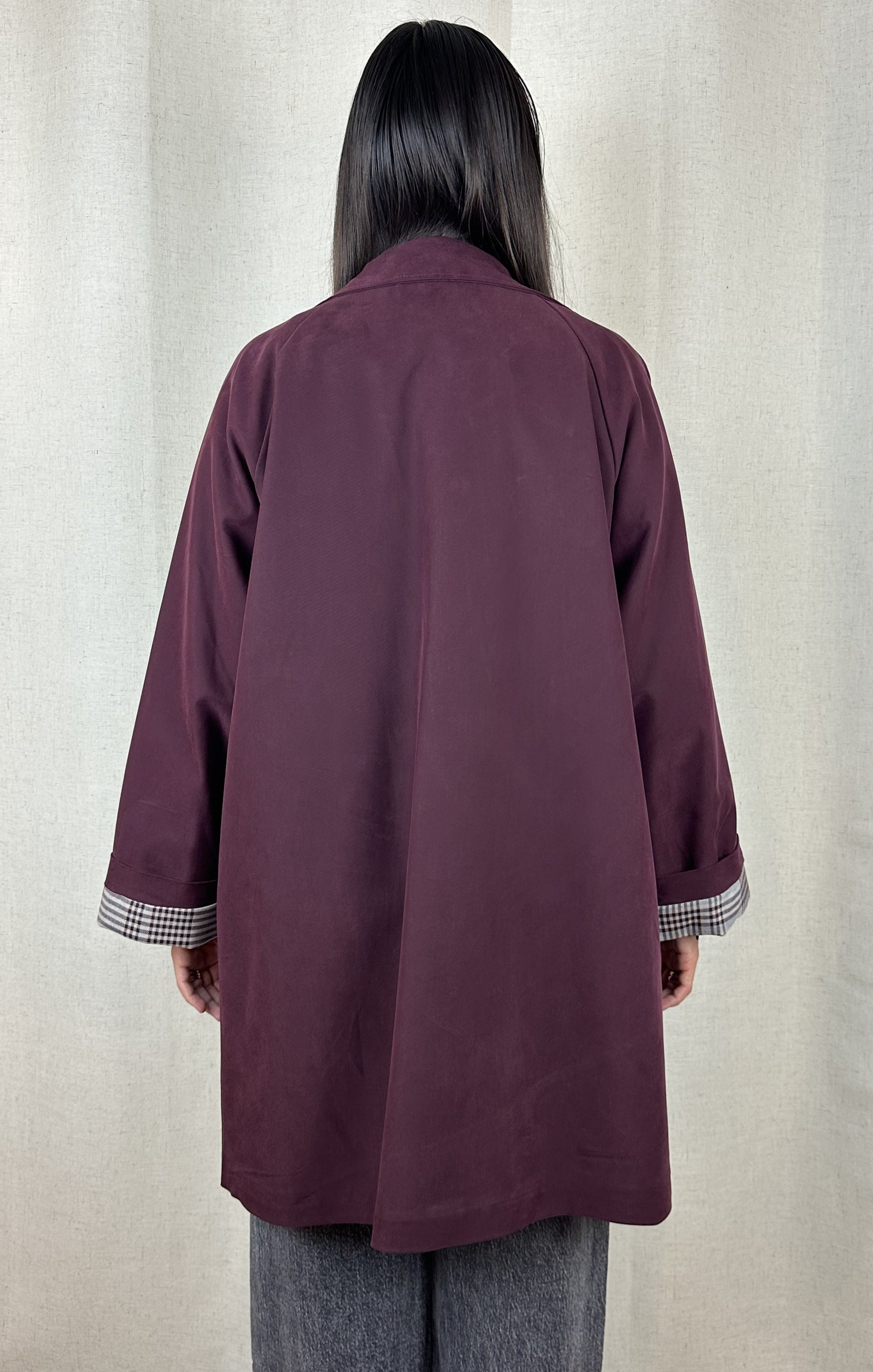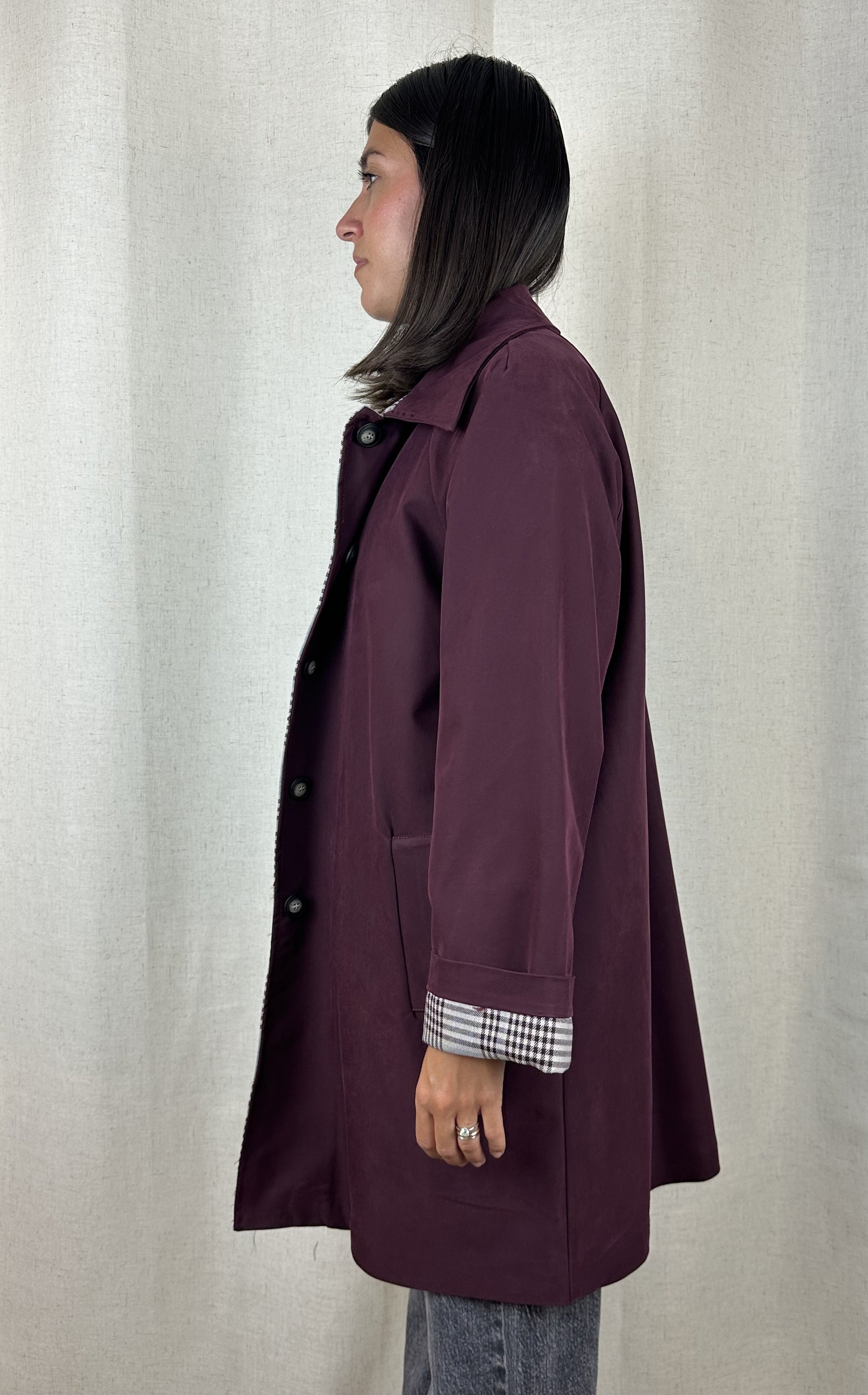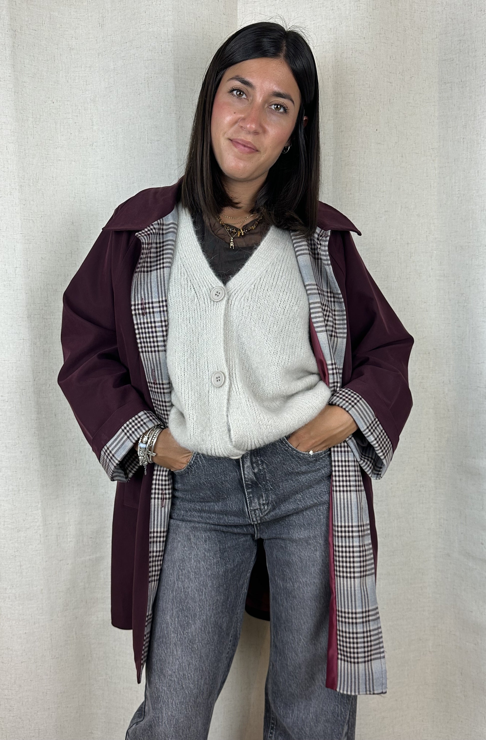 Cappotto color burgundy lunghezza ginocchio, profilo lunghezza e risvolto maniche con tessuto fantasia principe di galles.