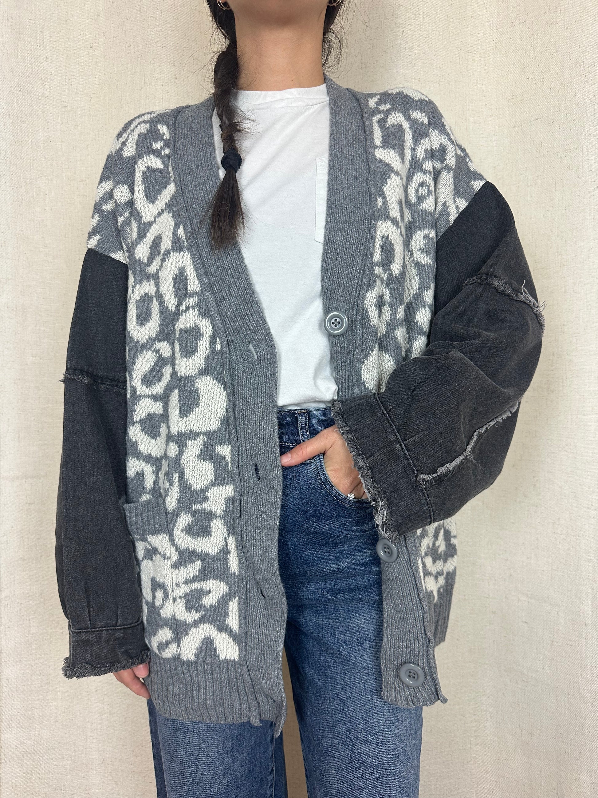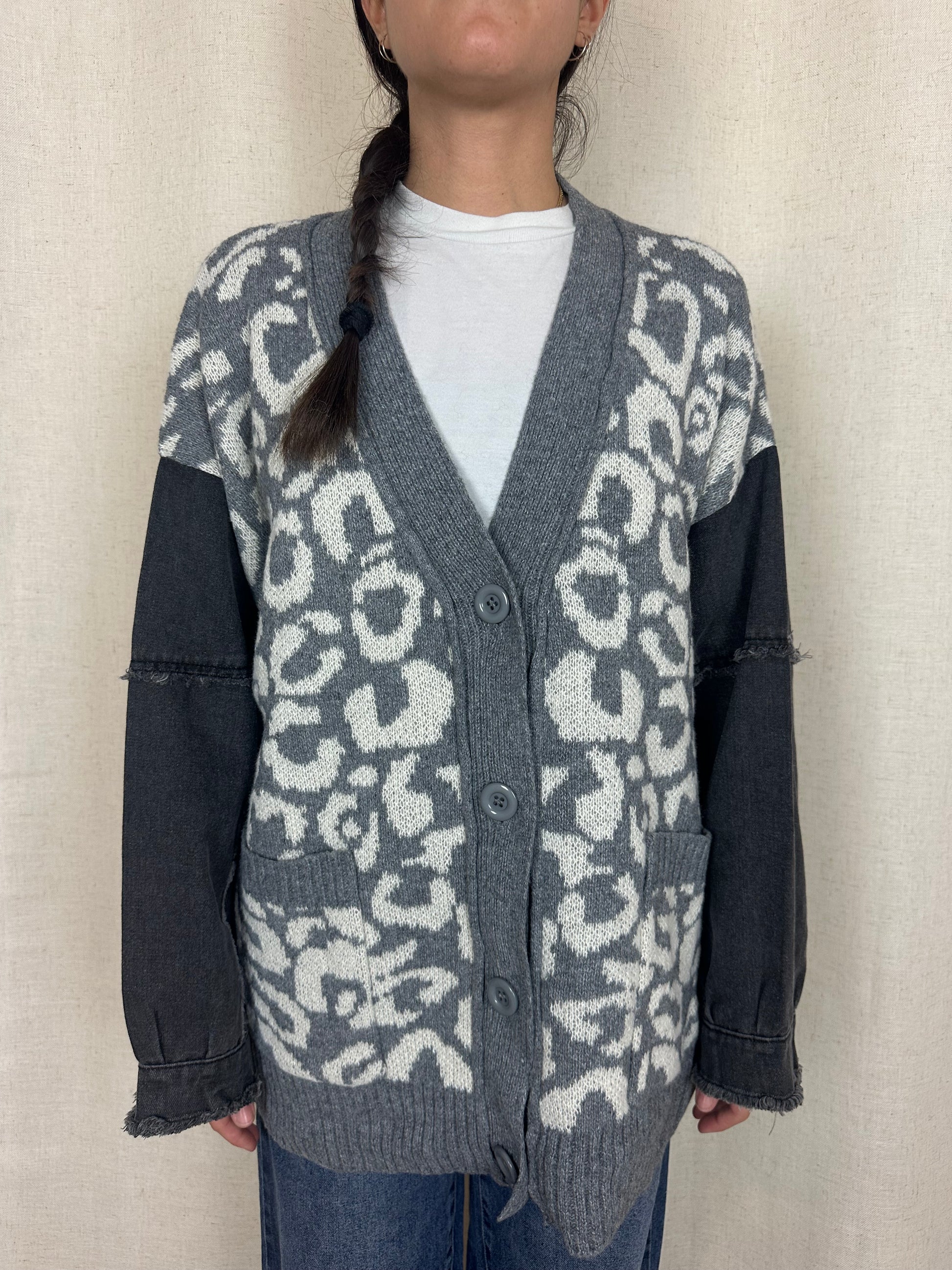 cardigan animalier con maniche in denim, chiusura con bottoni, taglia unica, vestibilità over, 40% viscosa 32% poliestere 28% poliamide, colore bianco e grigio chiaro e maniche in denim grigio piu scuro.