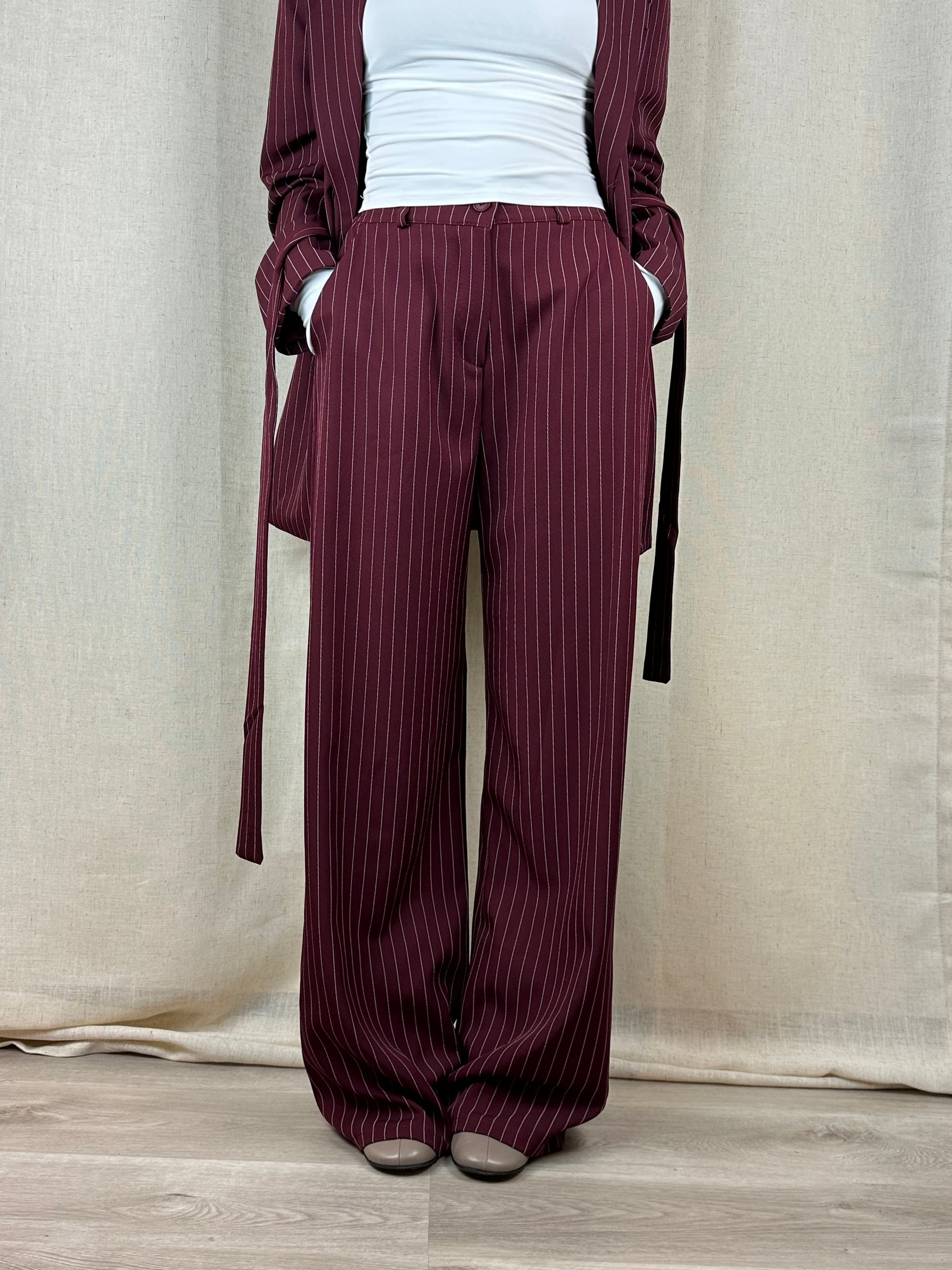 Completo color burgundy fantasia gessata, composto da giacca e pantalone, 77% poliestere 18% viscosa 5% elasta.