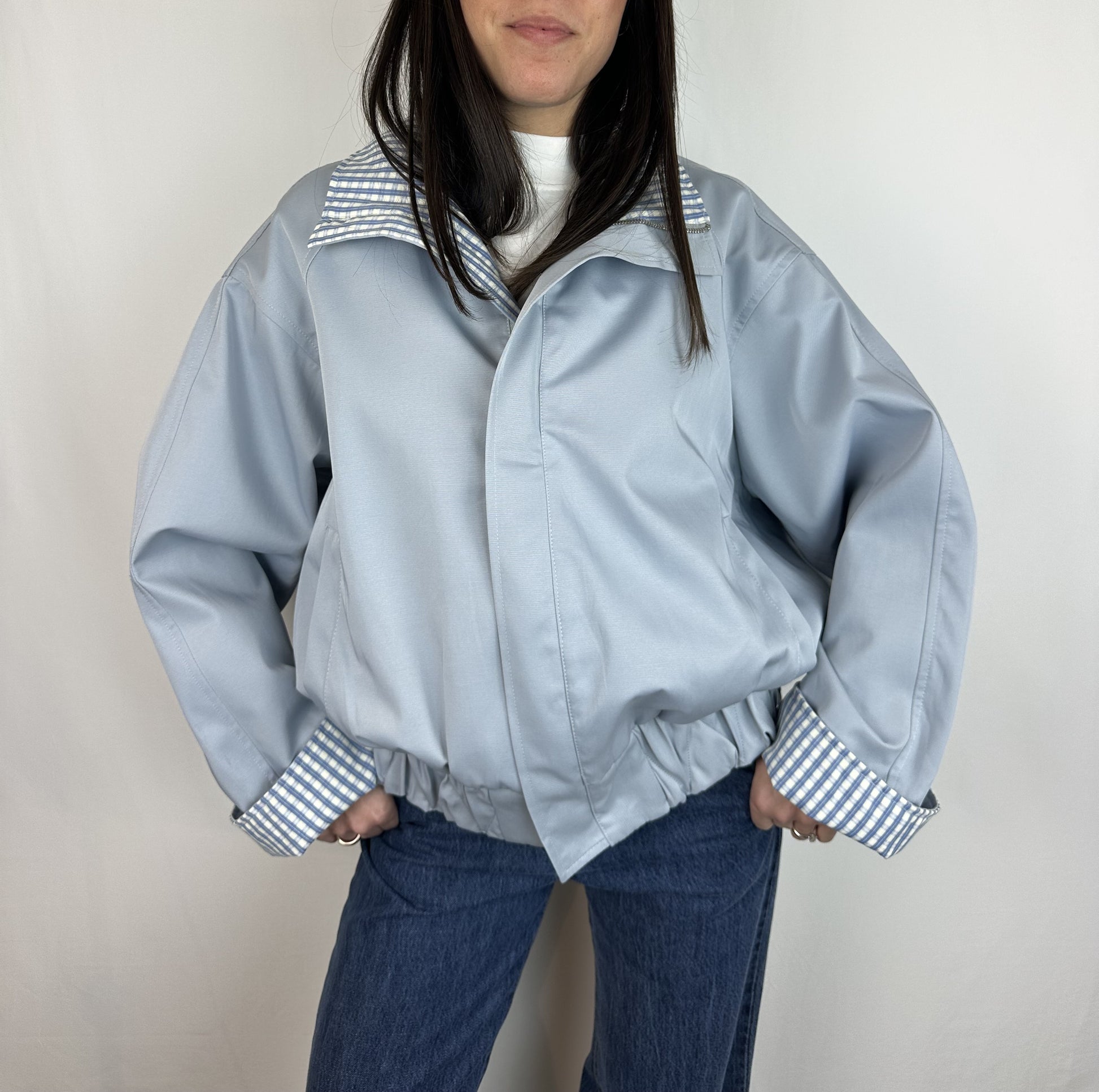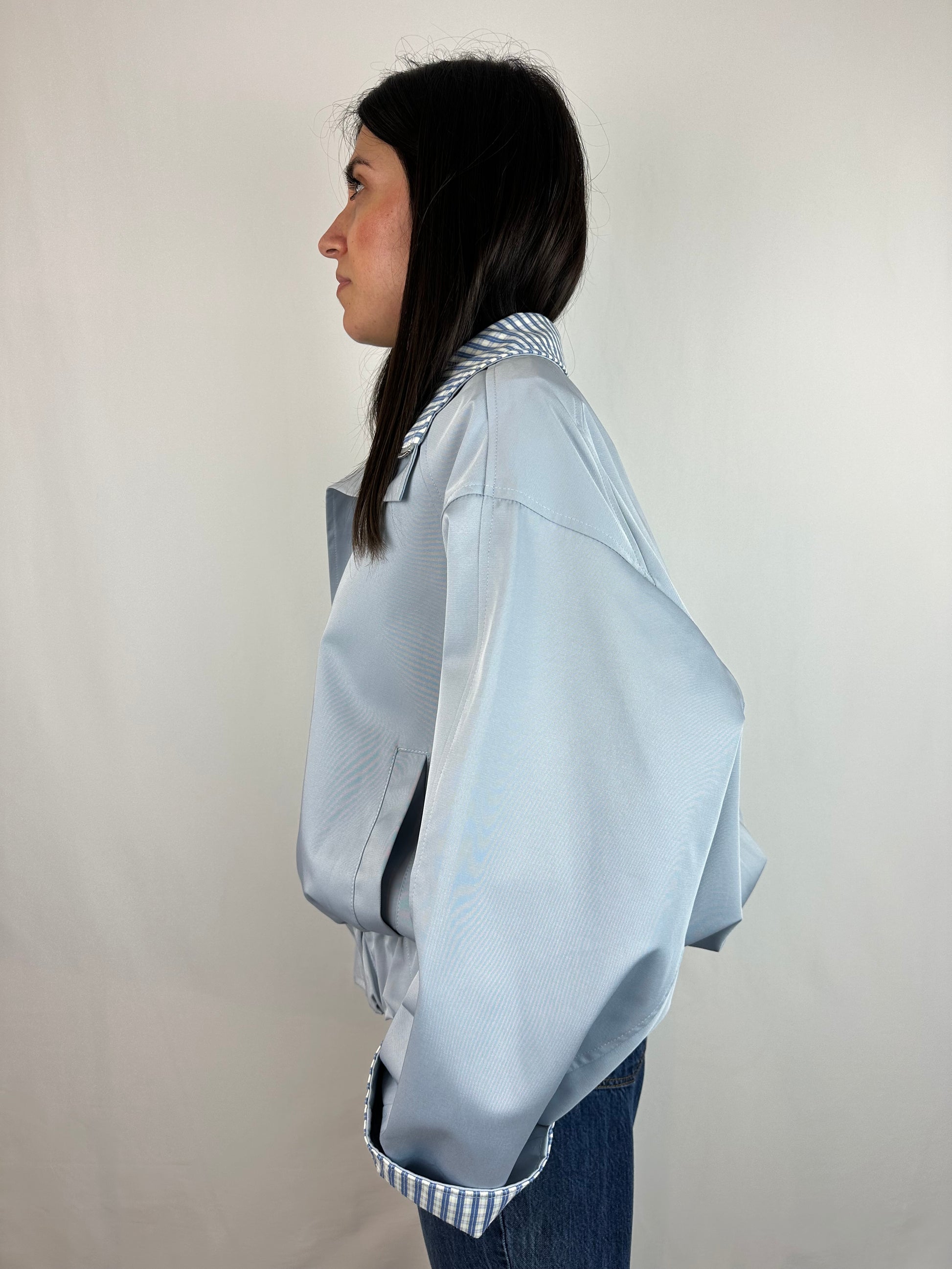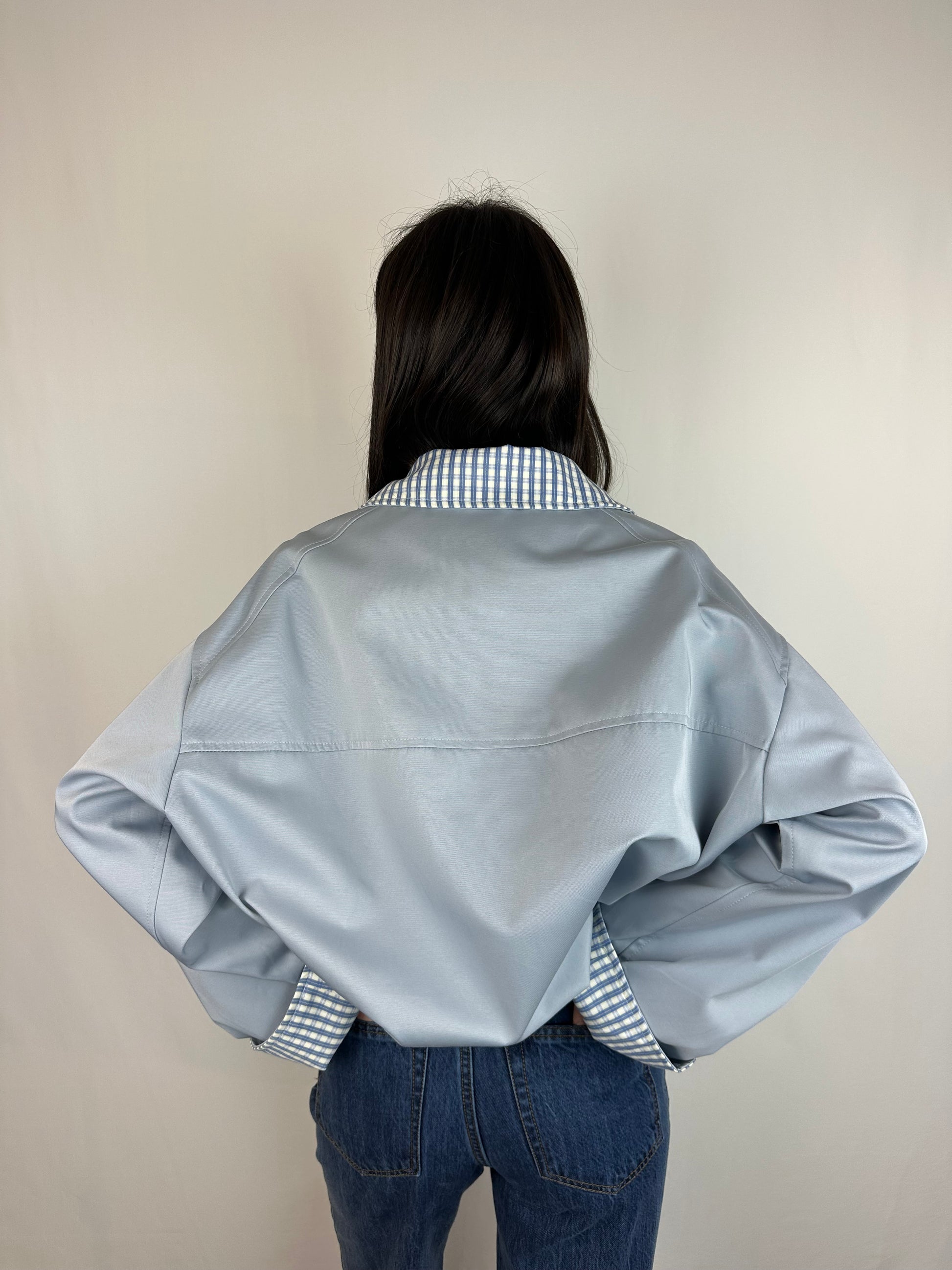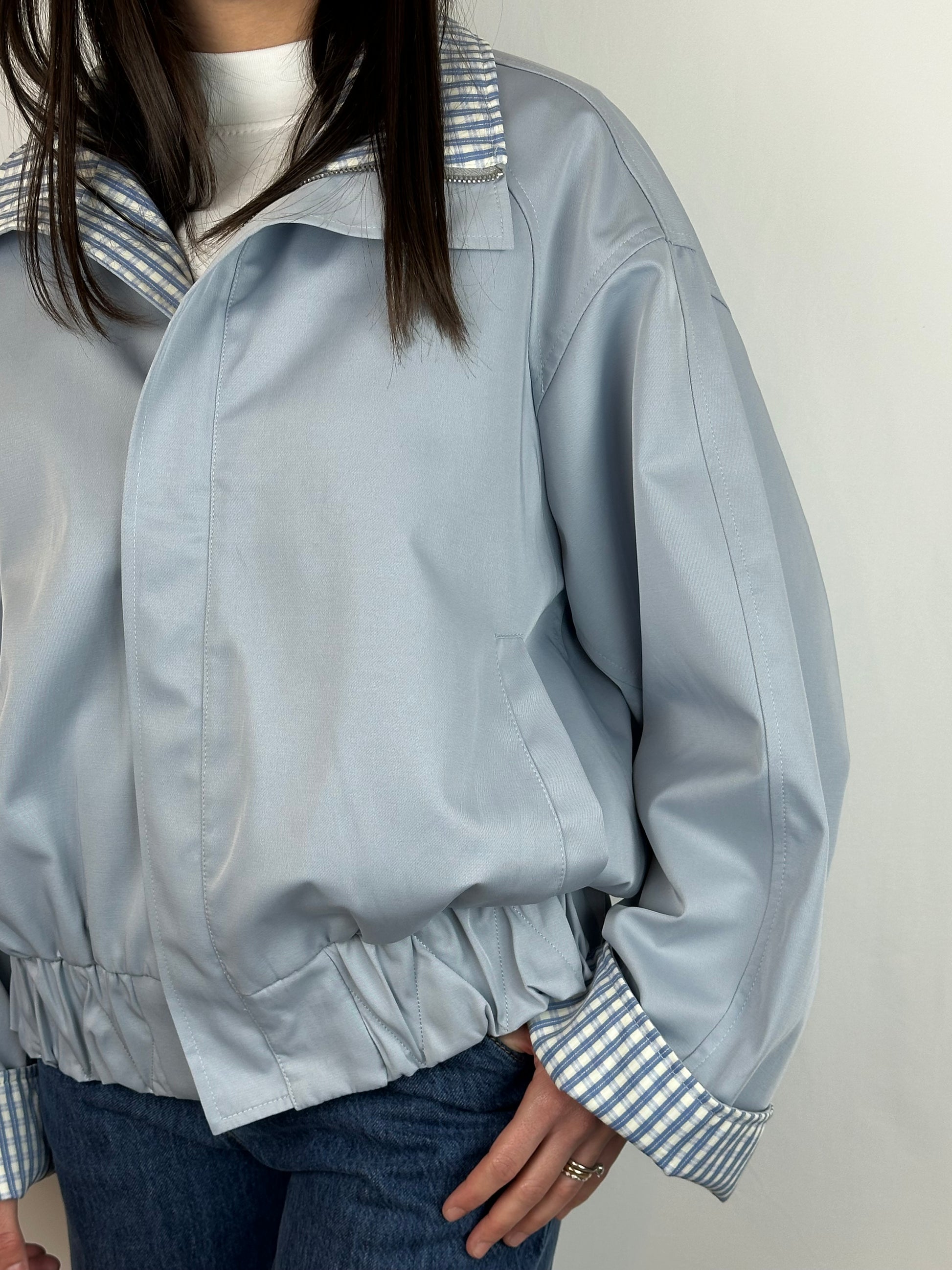 Colore azzurro chiaro, sul collo e polsini tessuto in fantasia quadretti color azzurro e bianco.