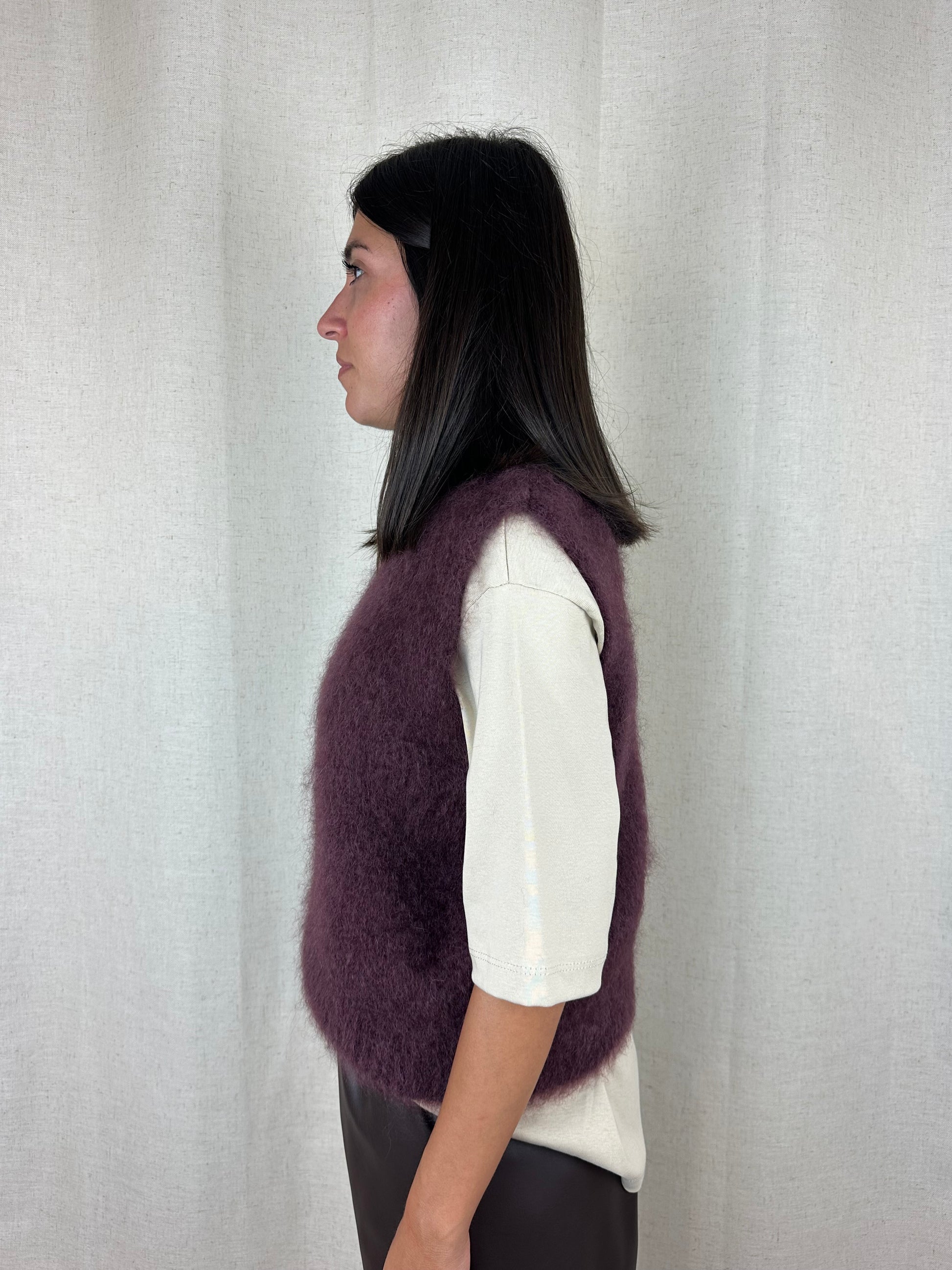 Gilet in lana color vinaccia, caldo e morbido grazie alla sua composizione di tessuti 81% kid mohair 17% poliamide 2% elastan.