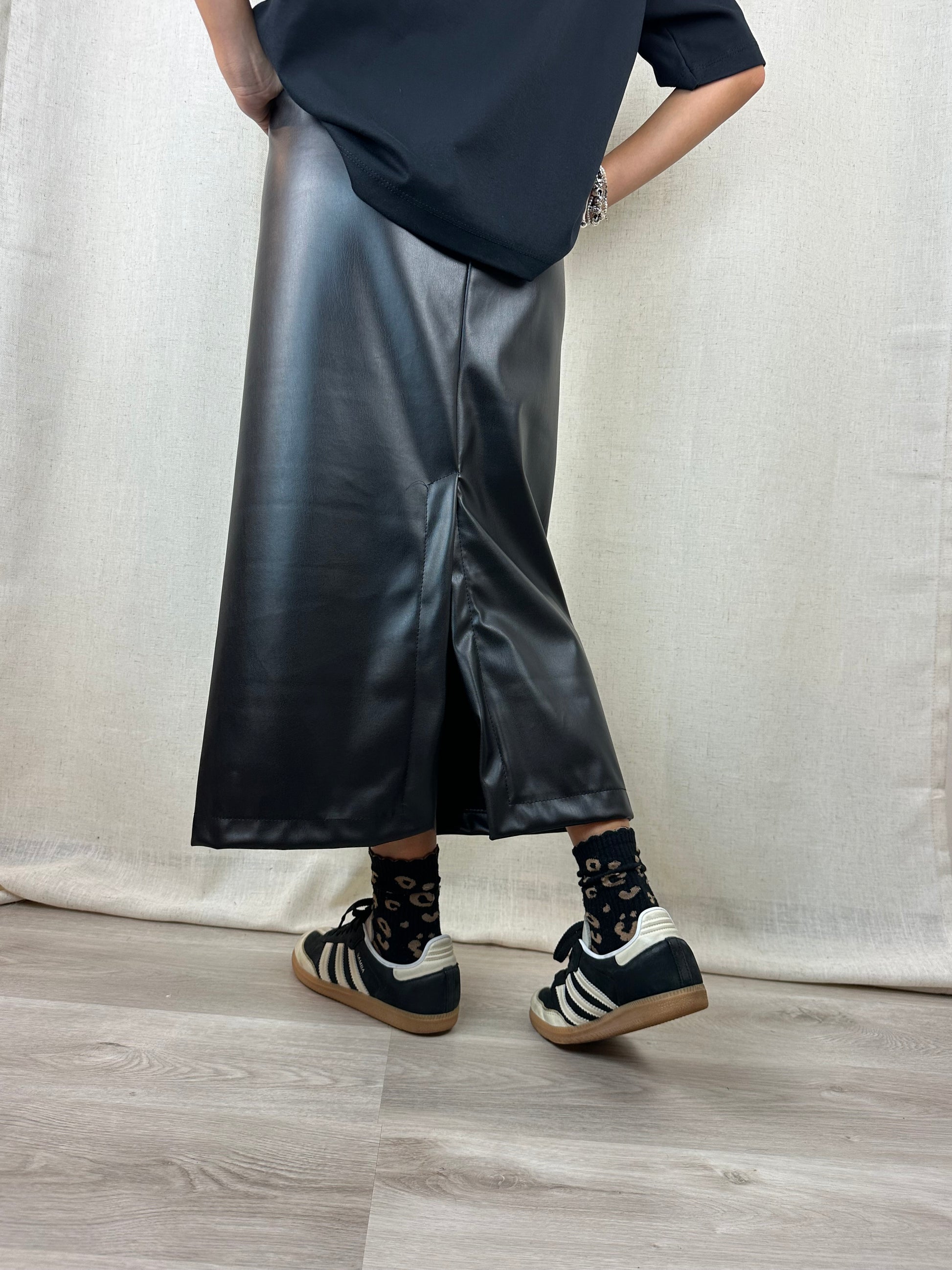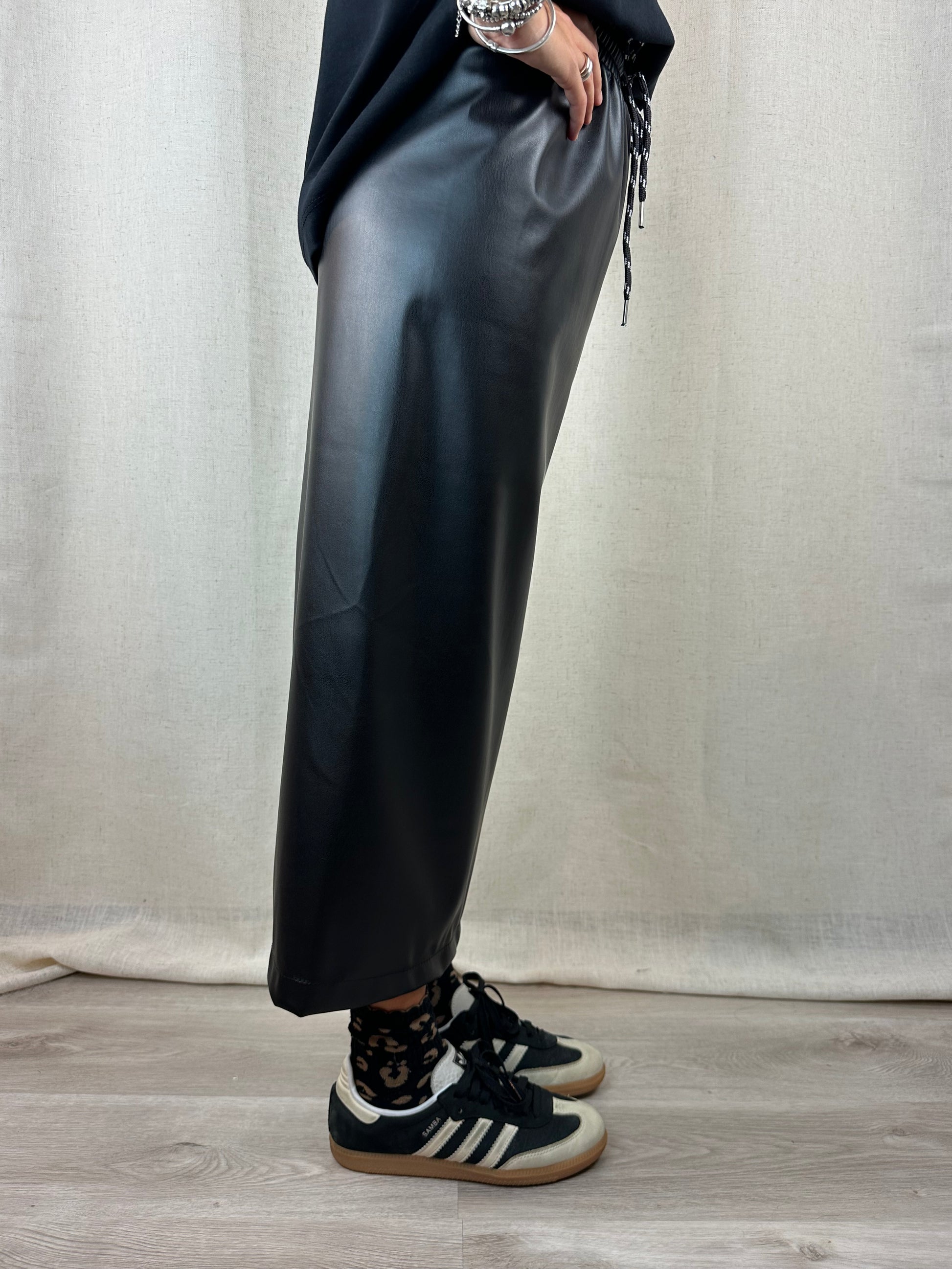 Longuette in ecopelle nera, con elastico in vita e coulisse con il cordino.
