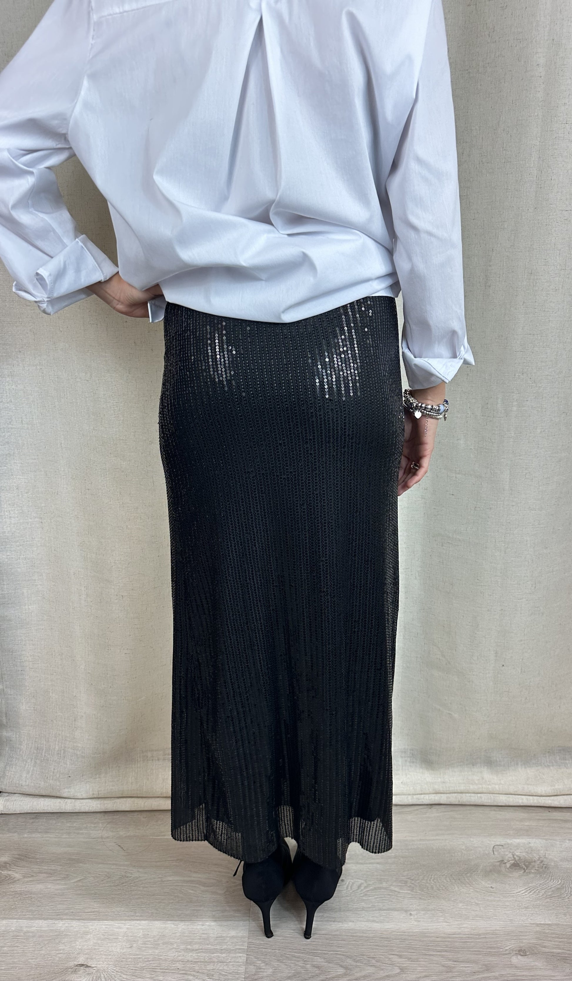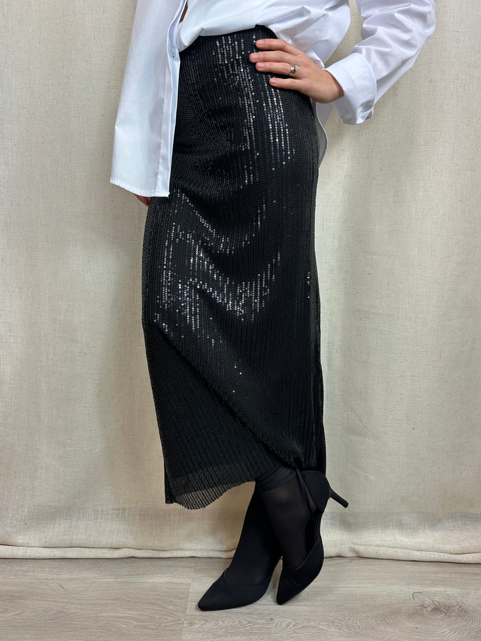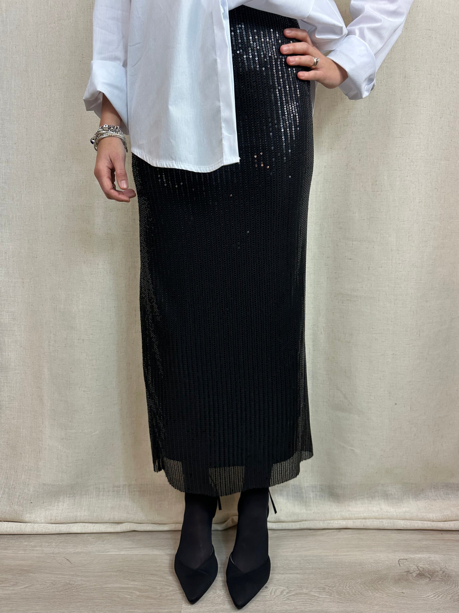 Gonna a tubino lunga fino alla caviglia color nero in paillettes. Elasticizzata e con elastico in vita. E' presente una fodera che accompagna tutta la lunghezza della gonna. 95% poliestere 5%elastan.