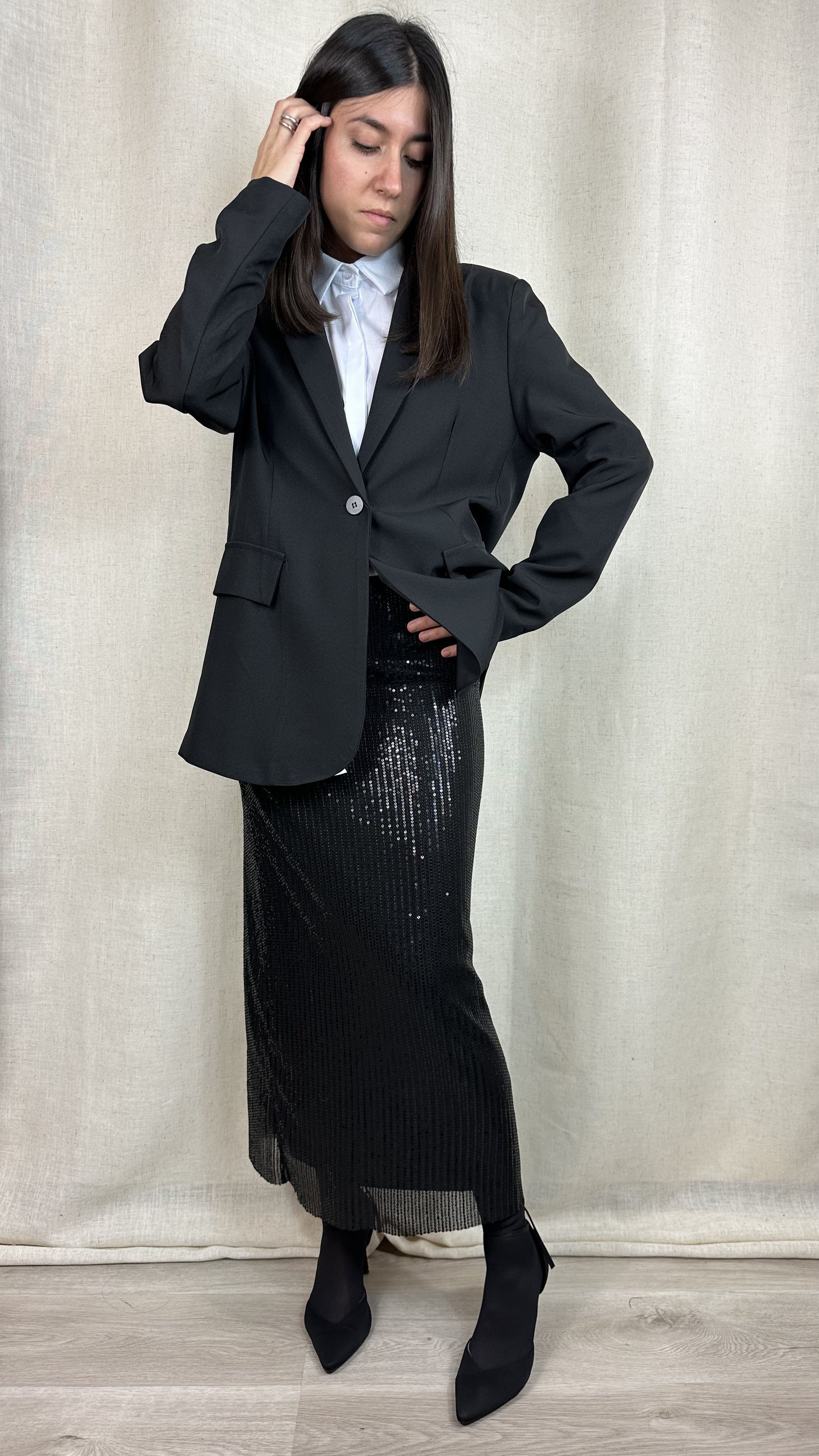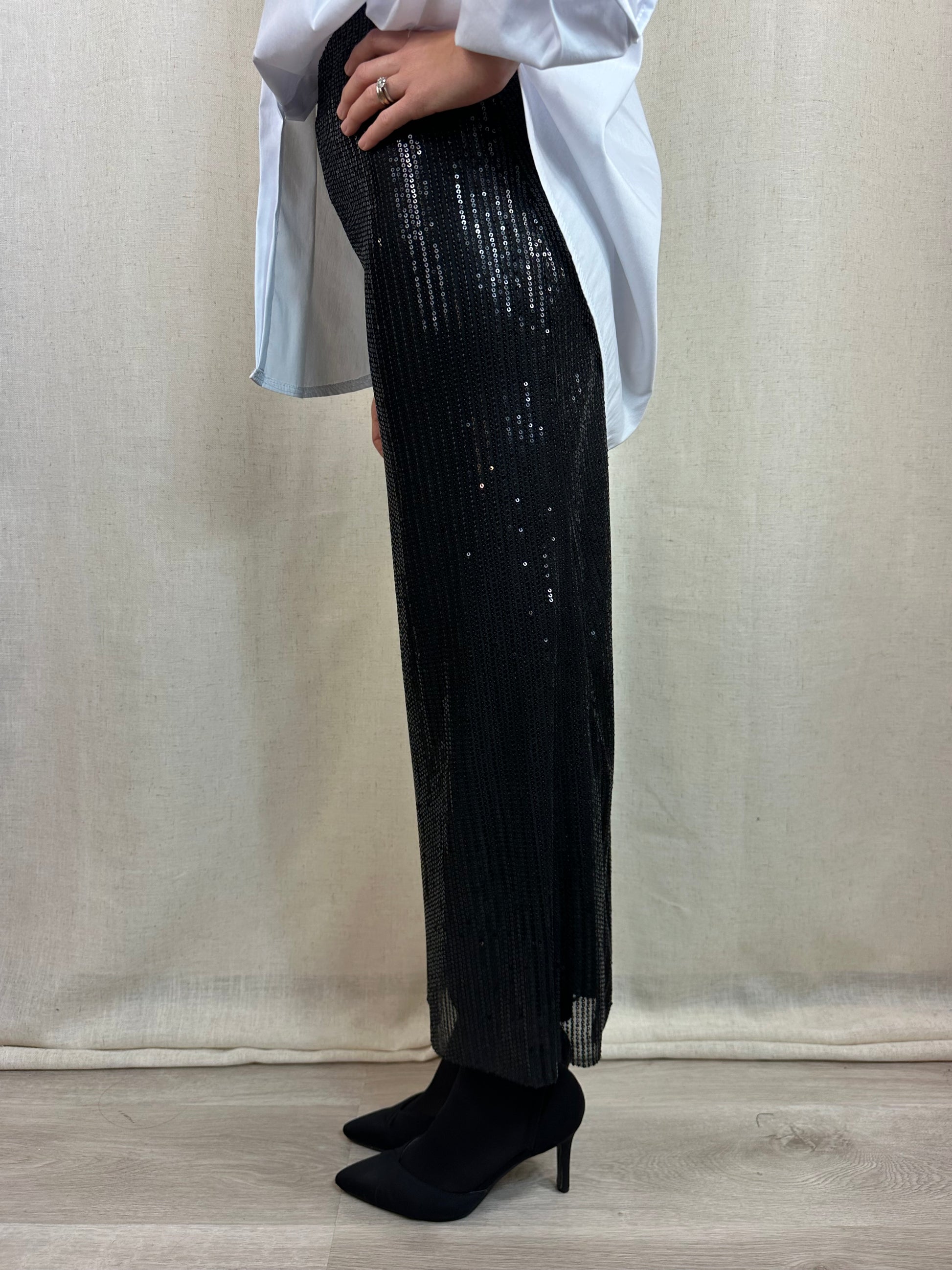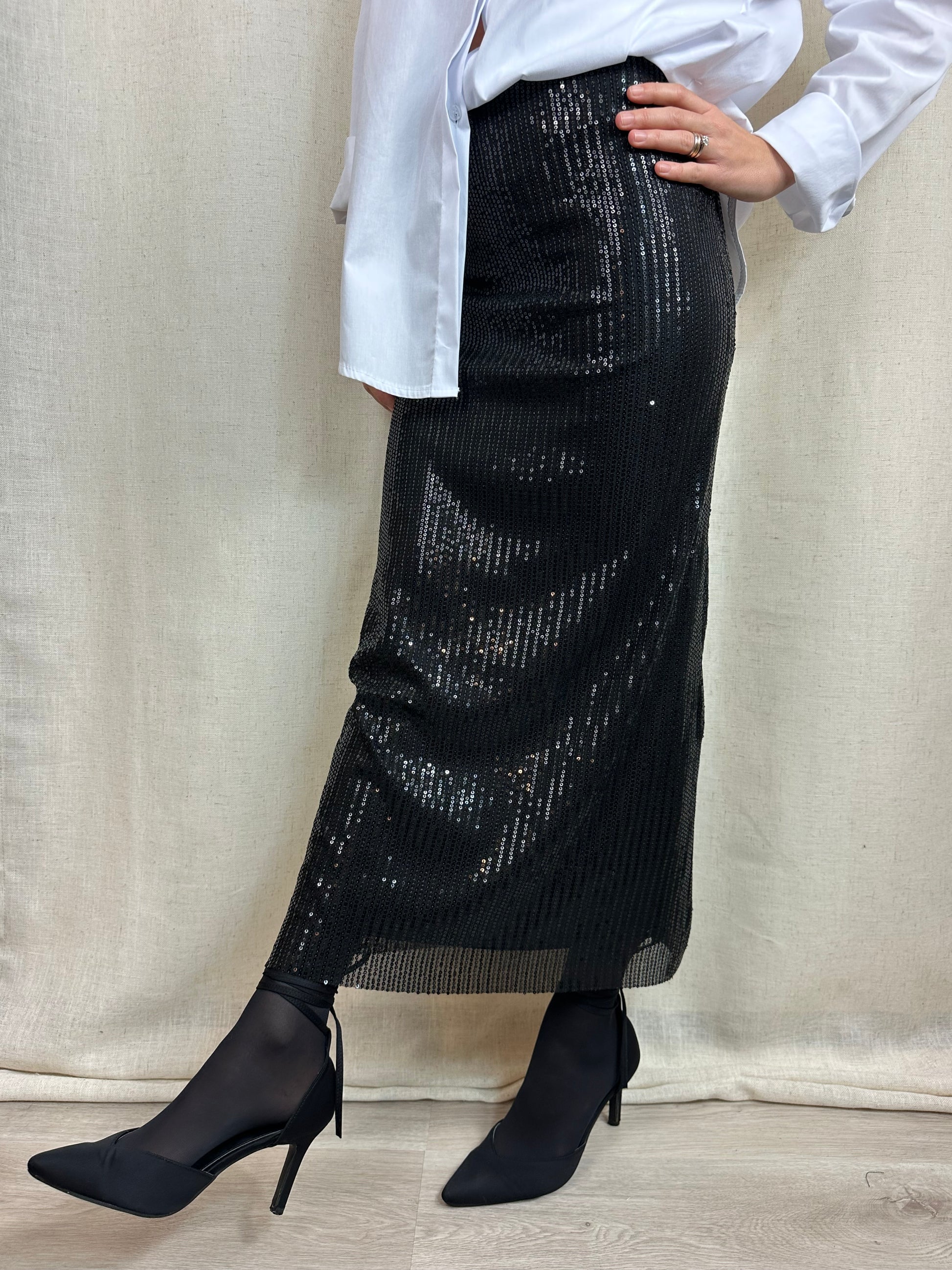 Gonna a tubino lunga fino alla caviglia color nero in paillettes. Elasticizzata e con elastico in vita. E' presente una fodera che accompagna tutta la lunghezza della gonna. 95% poliestere 5%elastan.
