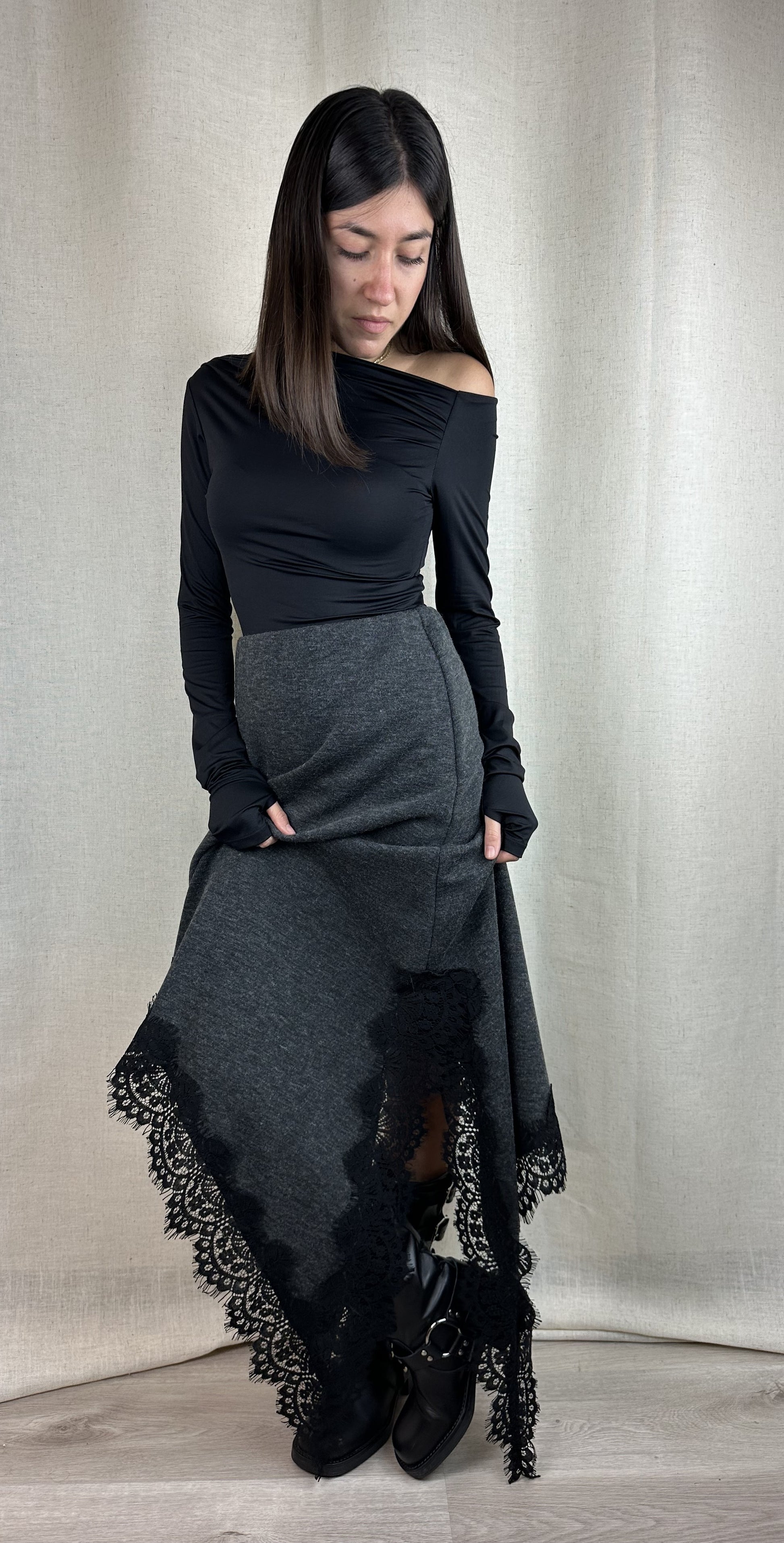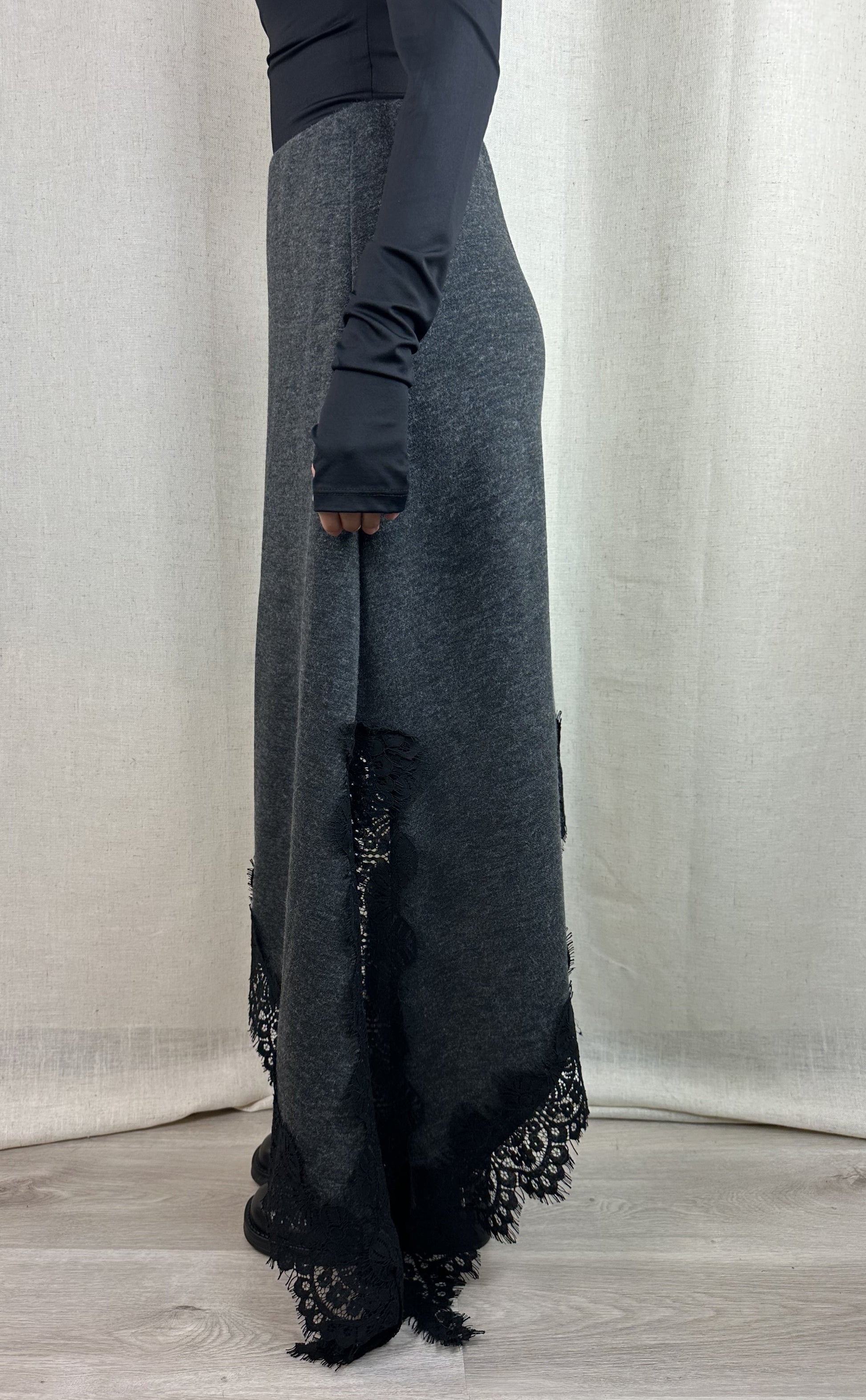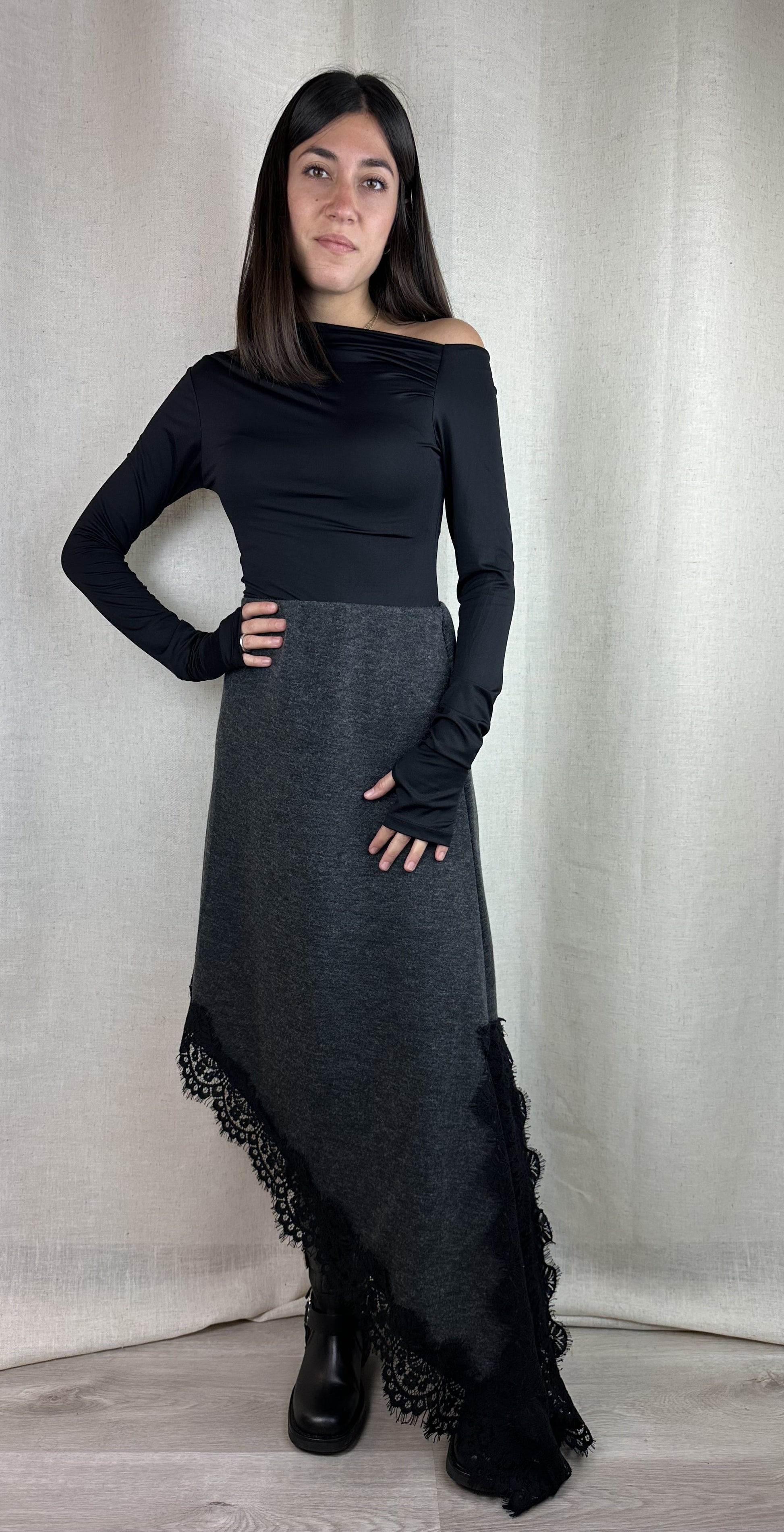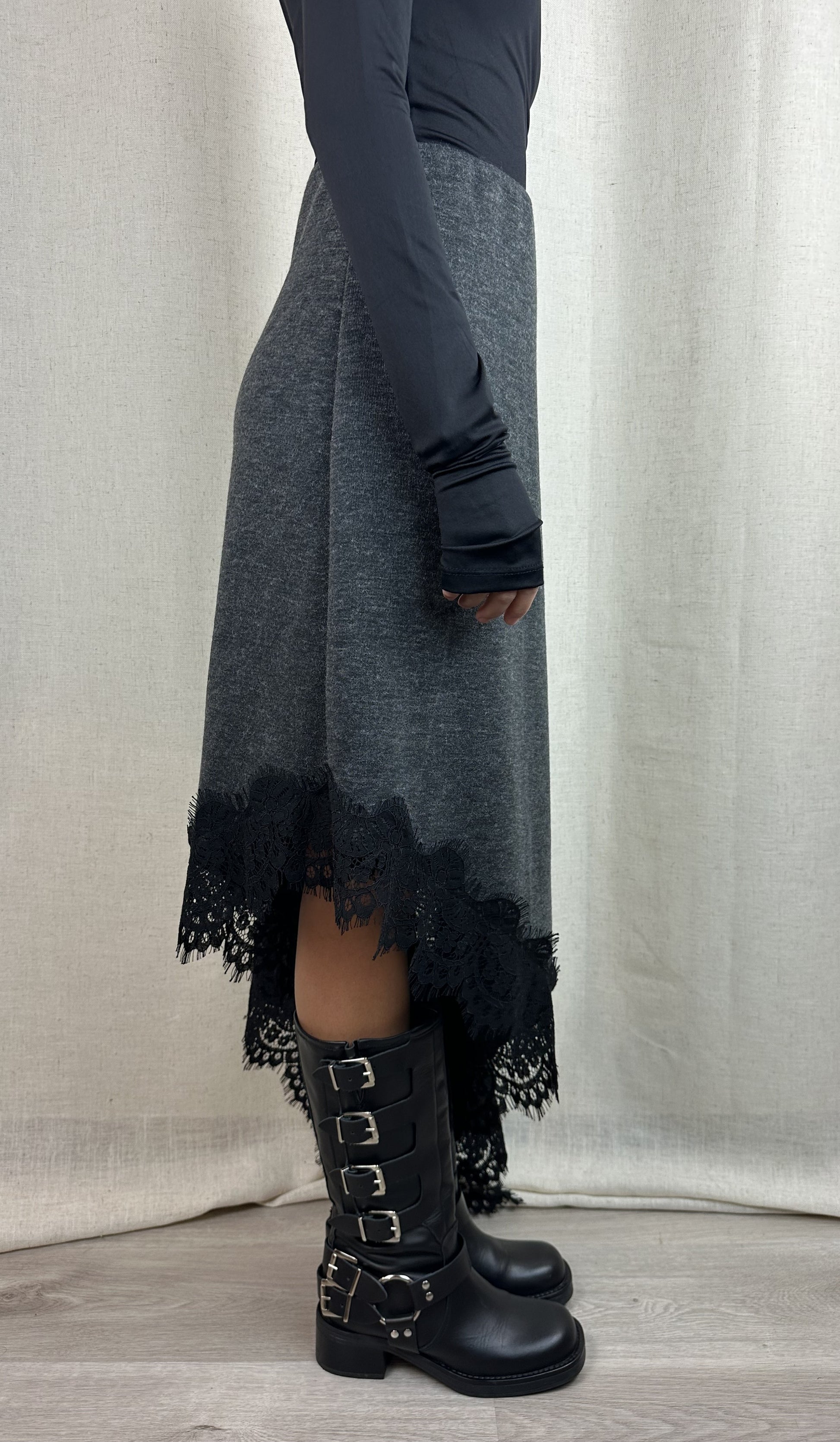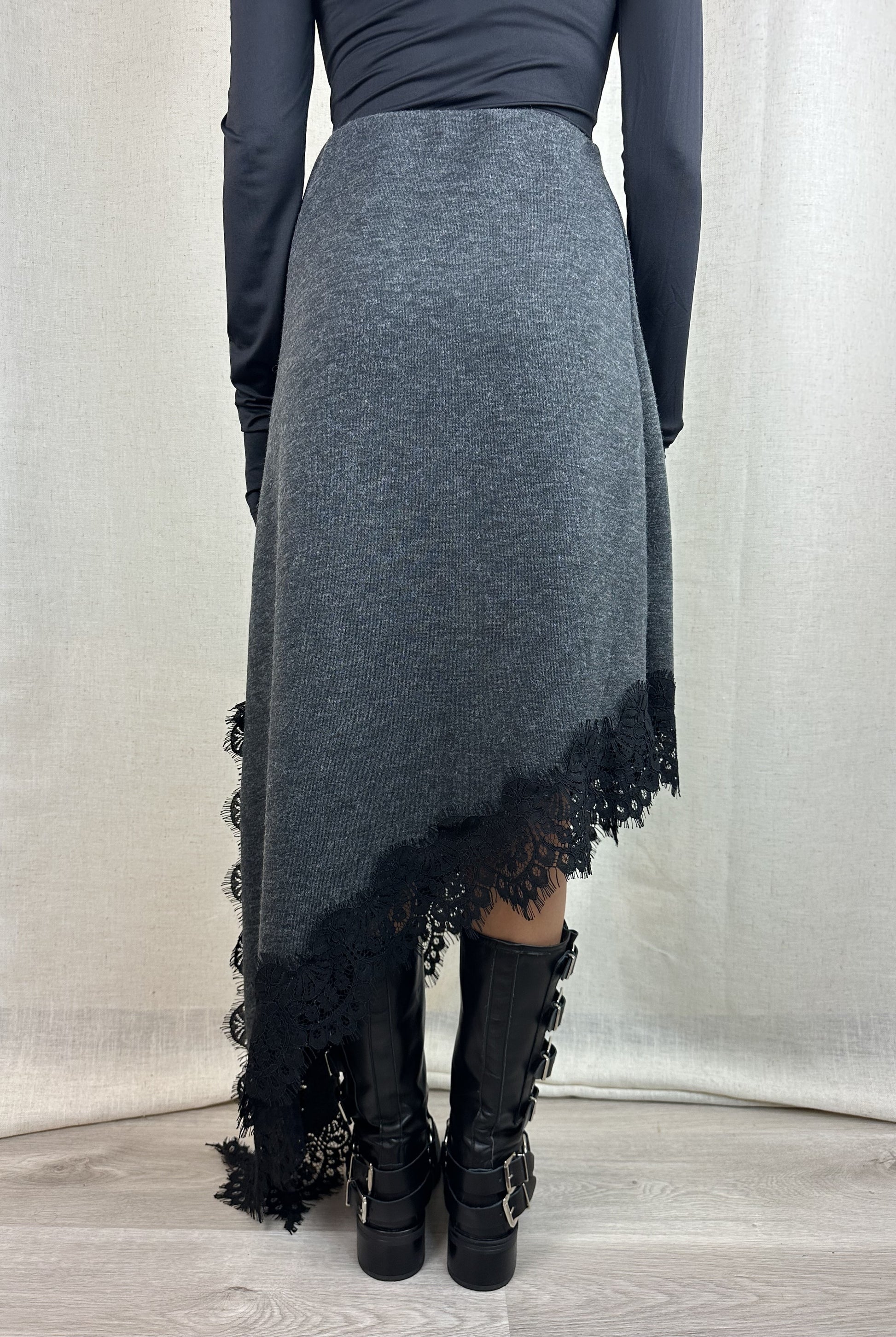 Gonna in maglina grigia con pizzo nero, elastico in vita e forma asimmetrica. 89% poliestere 11% viscosa.