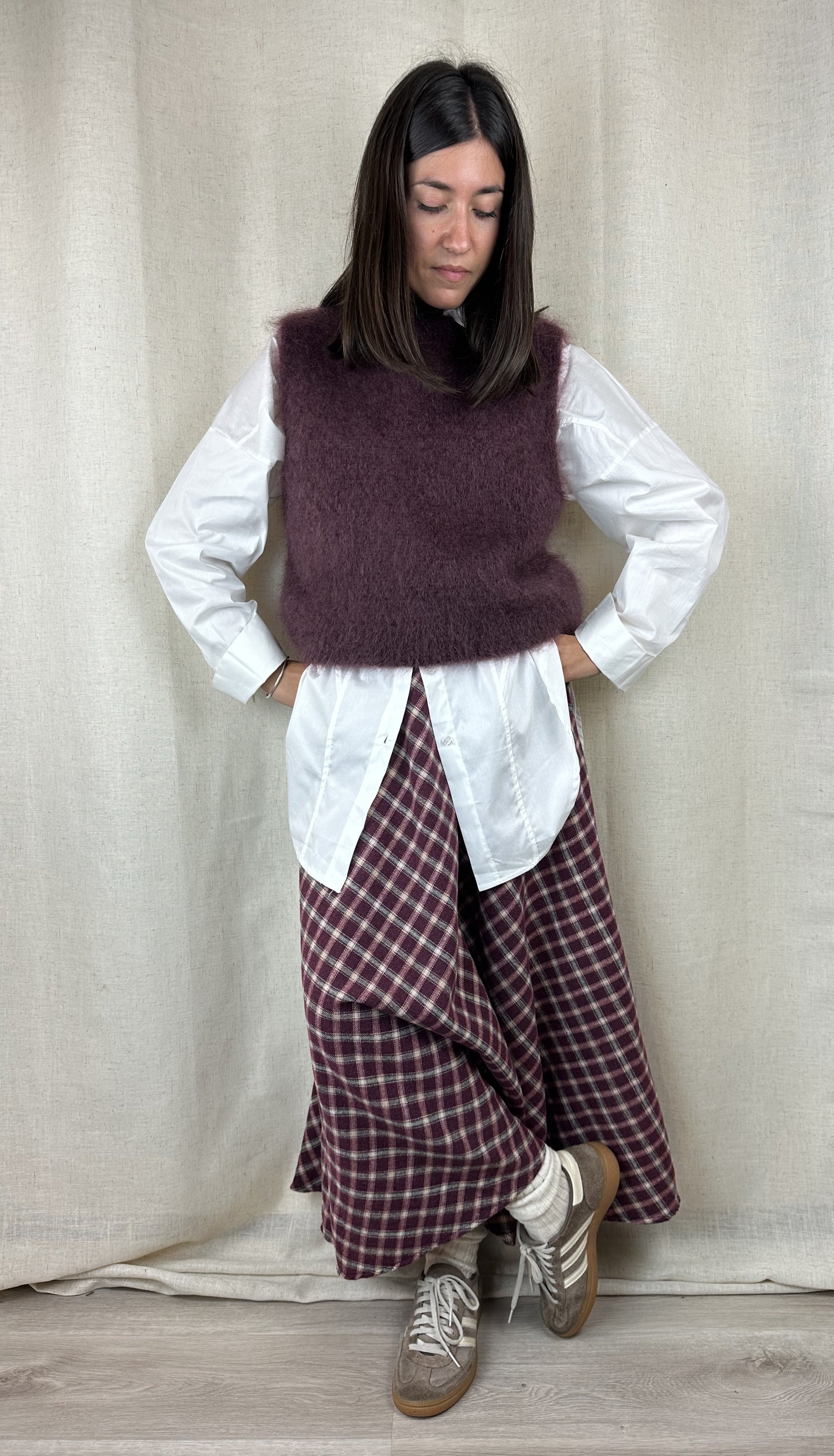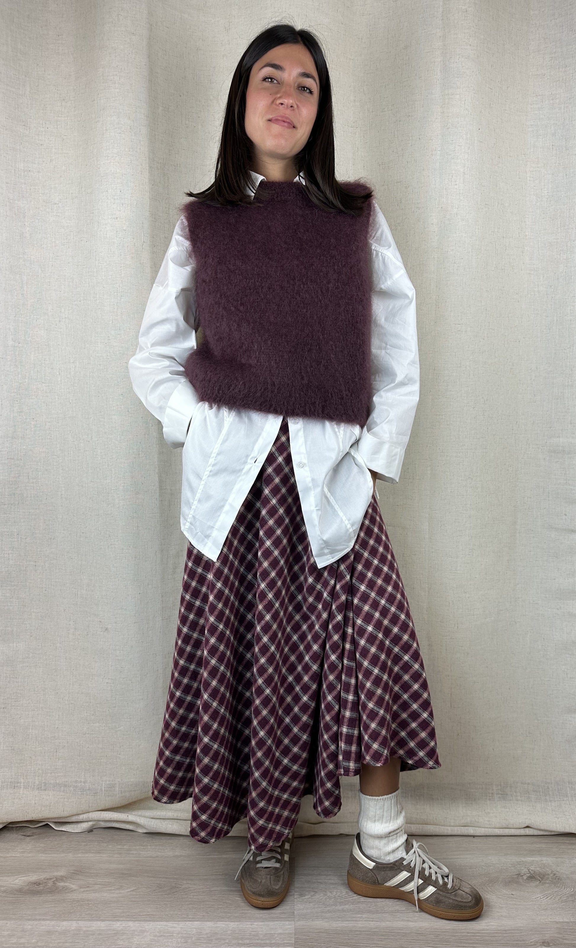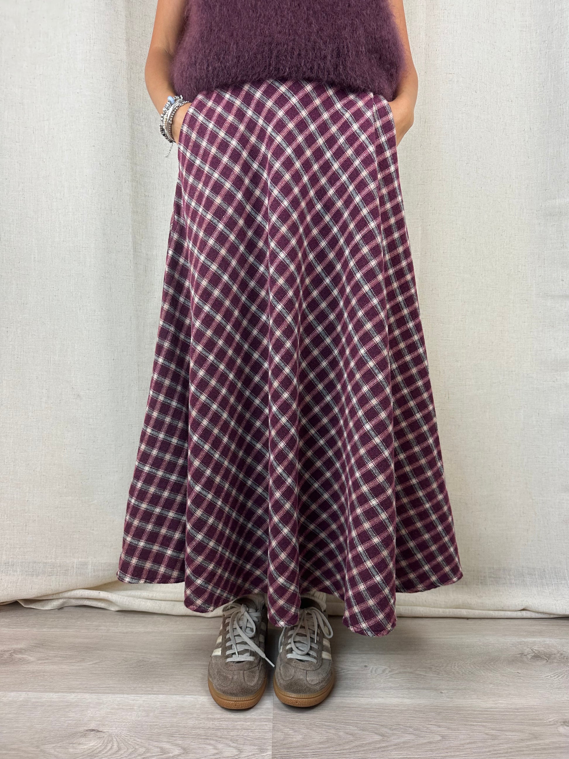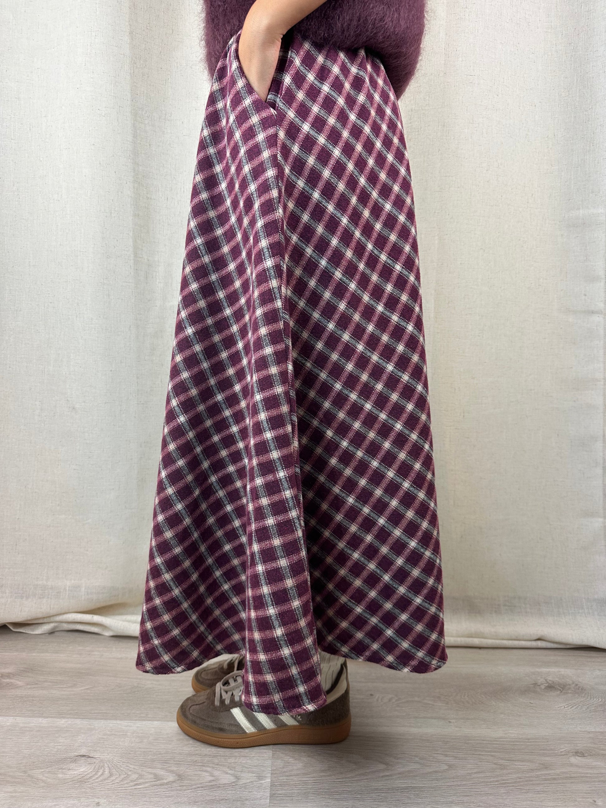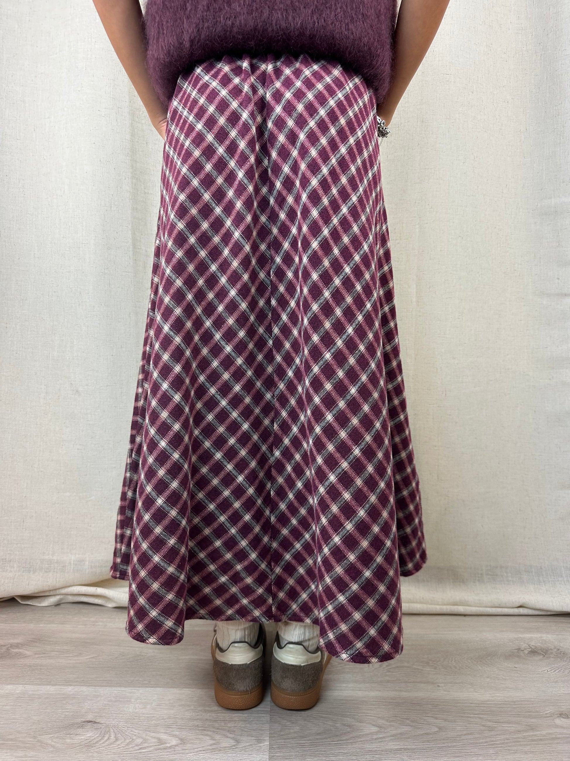 Gonna a quadri tipo flanella, colore burgundy, panna e grigio chiaro. 80% cotone 20% poliestere.