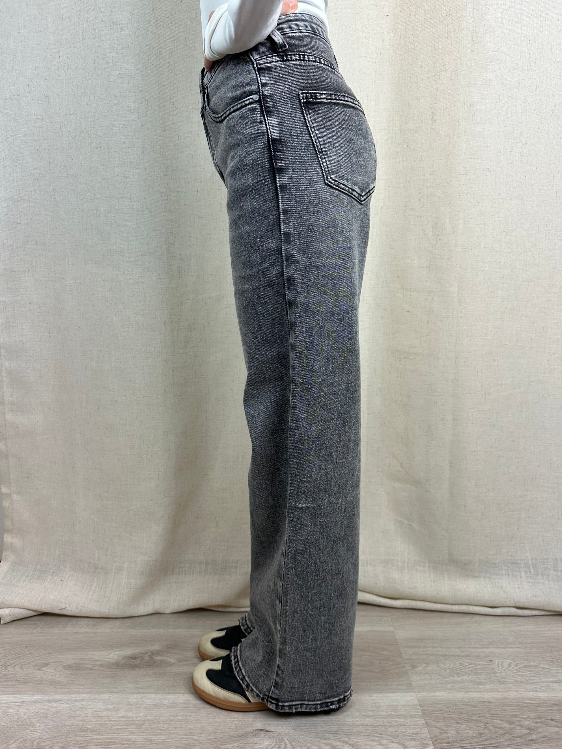 Jeans taglio straight , color grigio slavato. 65,5% cotone 23% poliestere 11% viscosa 0,5% elastan.