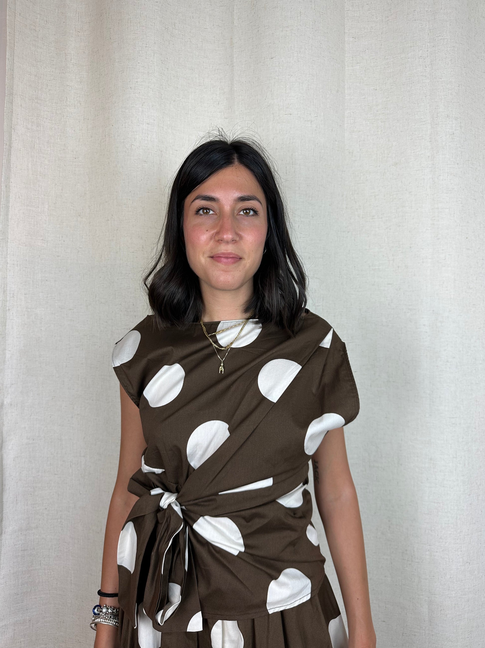 Maglia pois 97% cotone 3% elastano, color marrone con pois color panna.