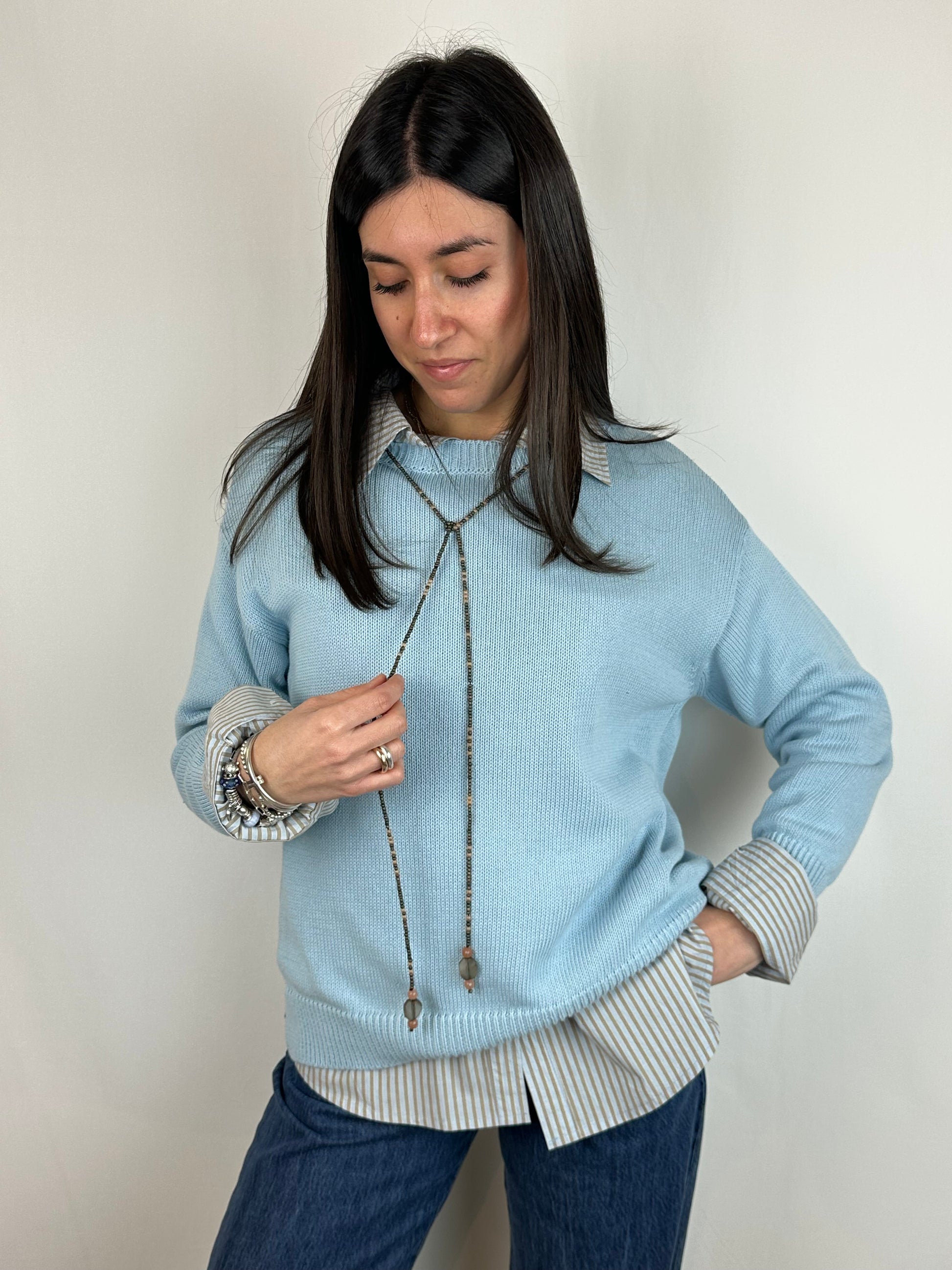 Vestibilità regolare taglio morbido (non aderisce), leggermente più lungo dietro rispetto al davanti. I polsini, il bordo del girocollo e il bordo finale sono a costine.