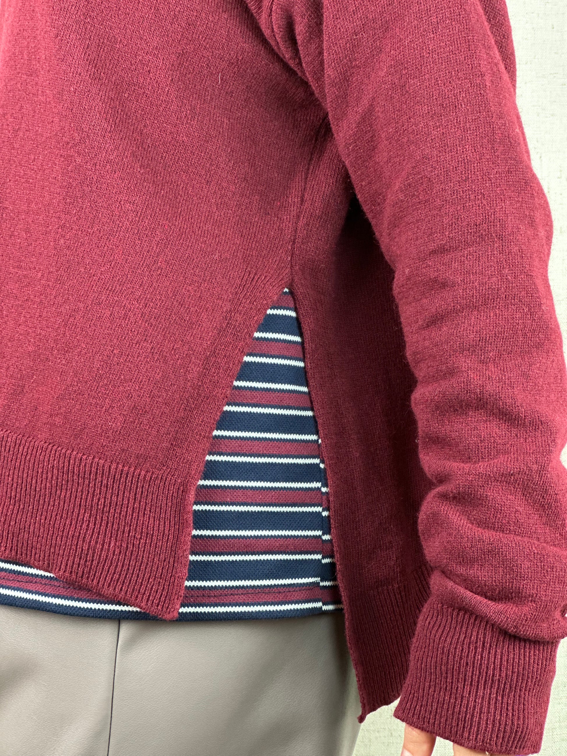 Maglioncino sottile in misto lana color bordeaux, 40% lana 30% viscosa 20% poliestere 10% cashmere.