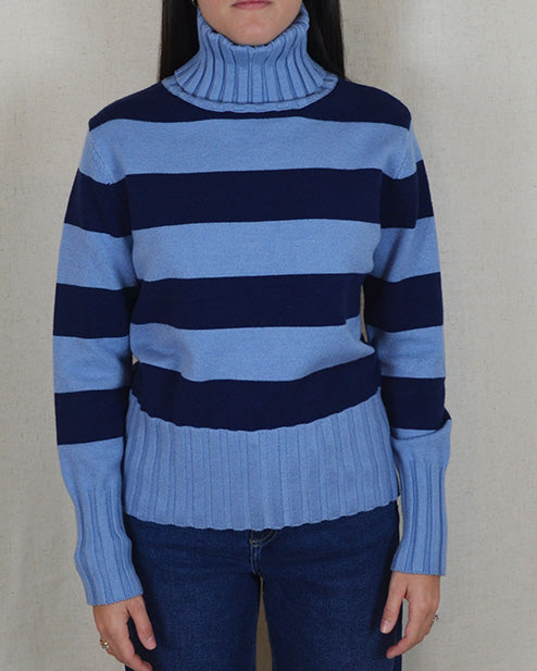 maglioncino dolcevita a righe , taglia unica, vestibilità regolare, lunghezza regolare, 50% viscosa 20% poliestere 22% poliamide, colore blu e carta da zucchero.