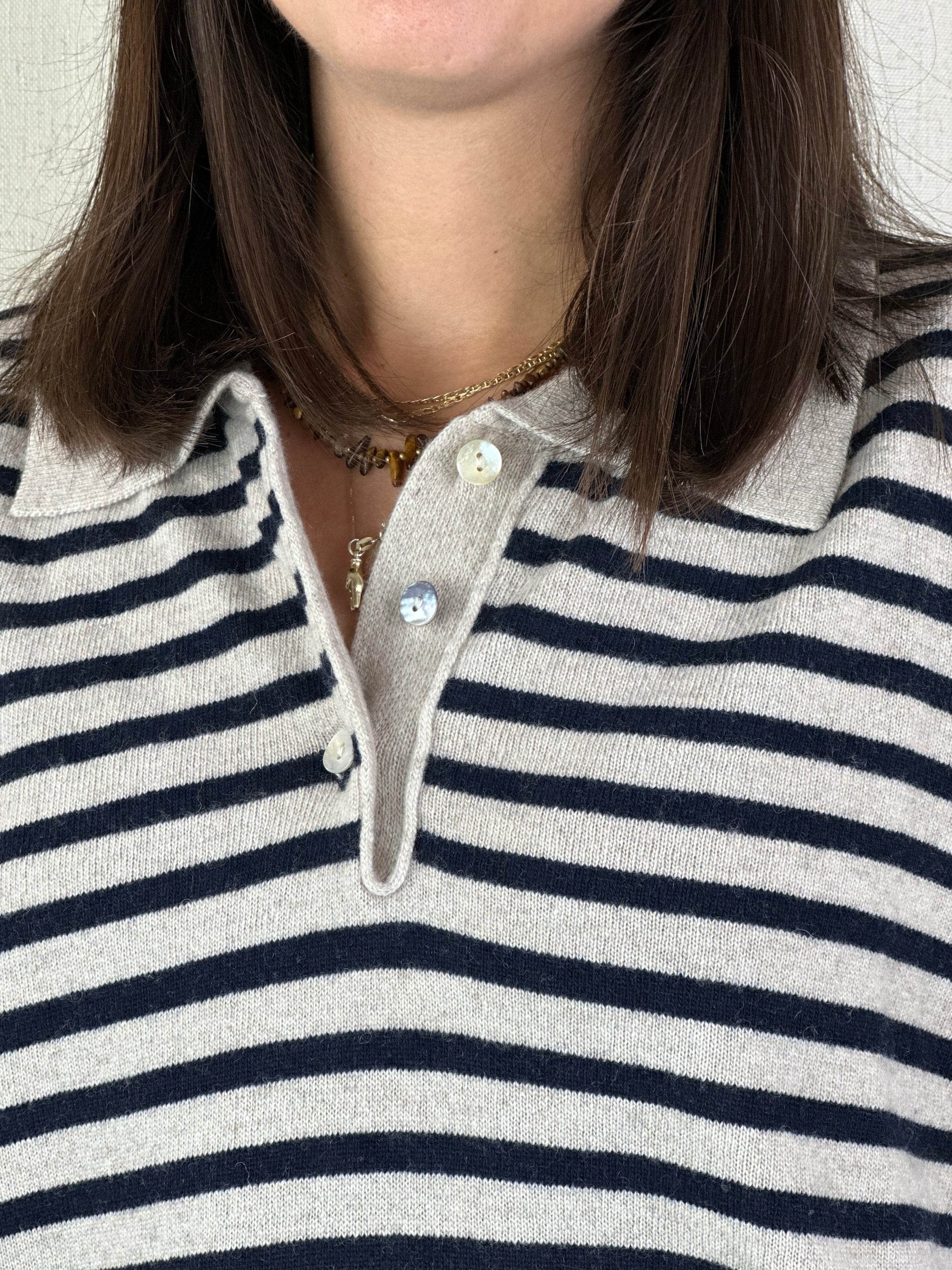 Maglioncino a righe color blu scuro e beige melange con scollo come una polo con i bottoncini. 30% lana 30% poliamidica 30% viscosa 10% cashmere.