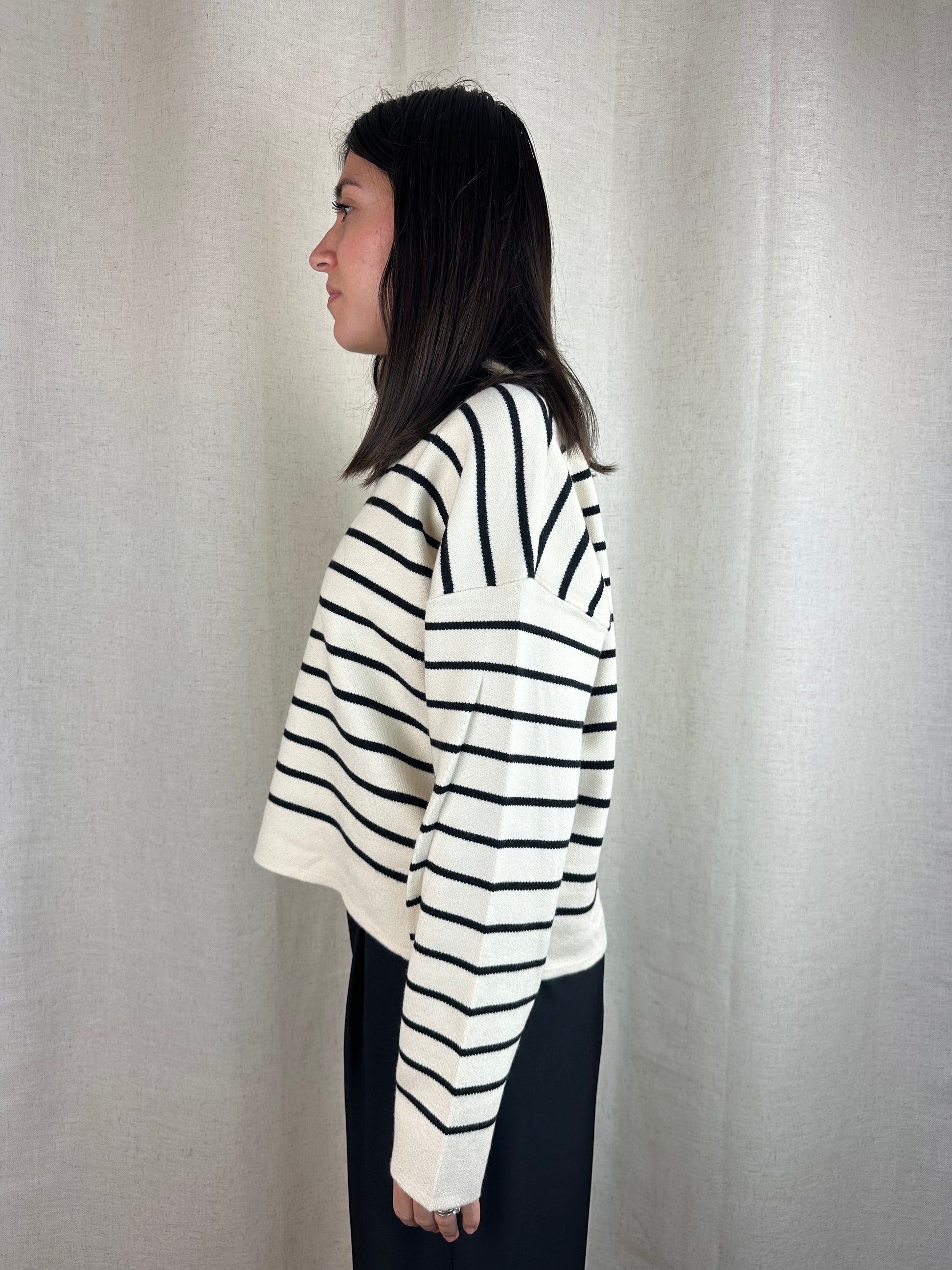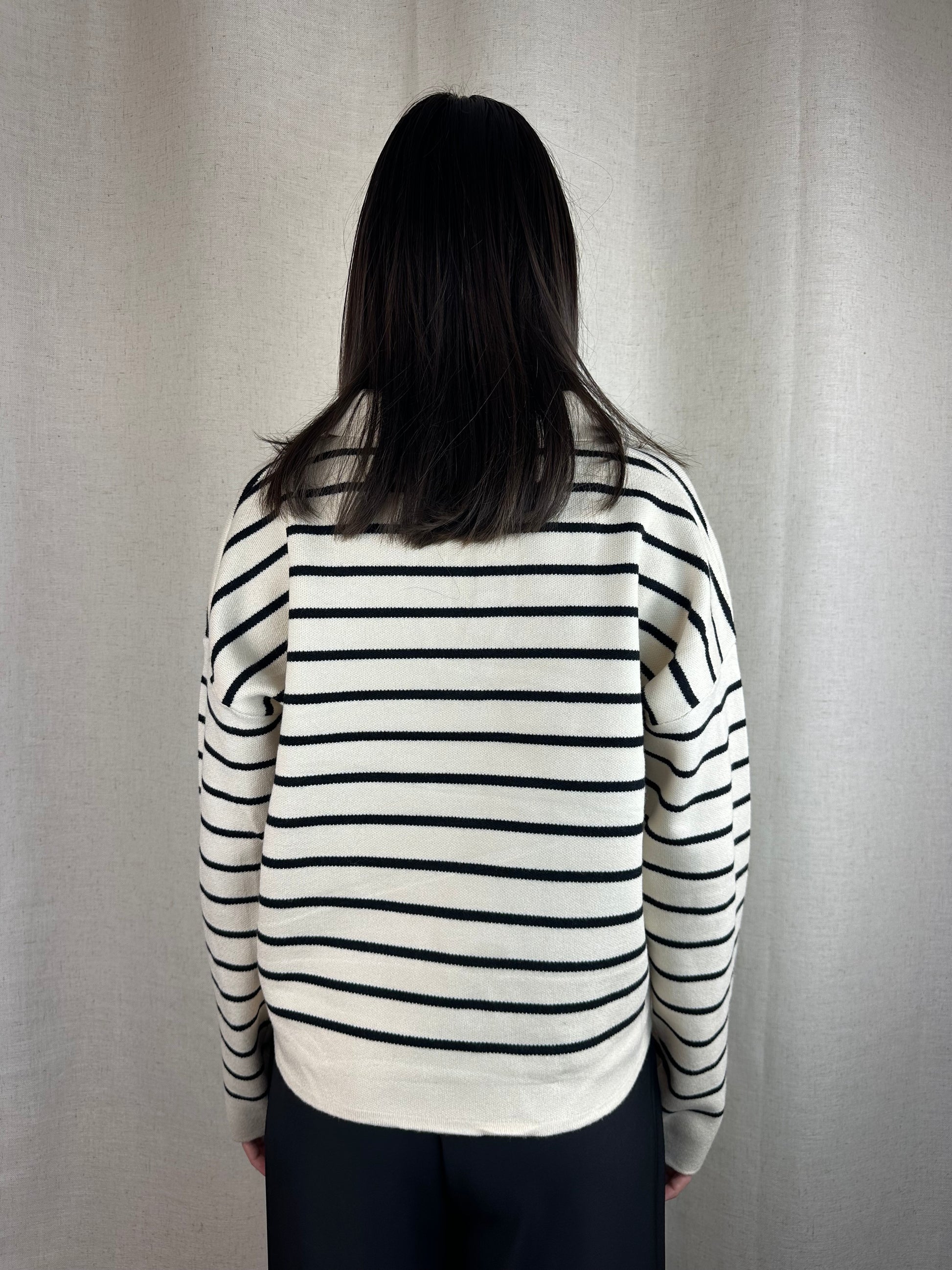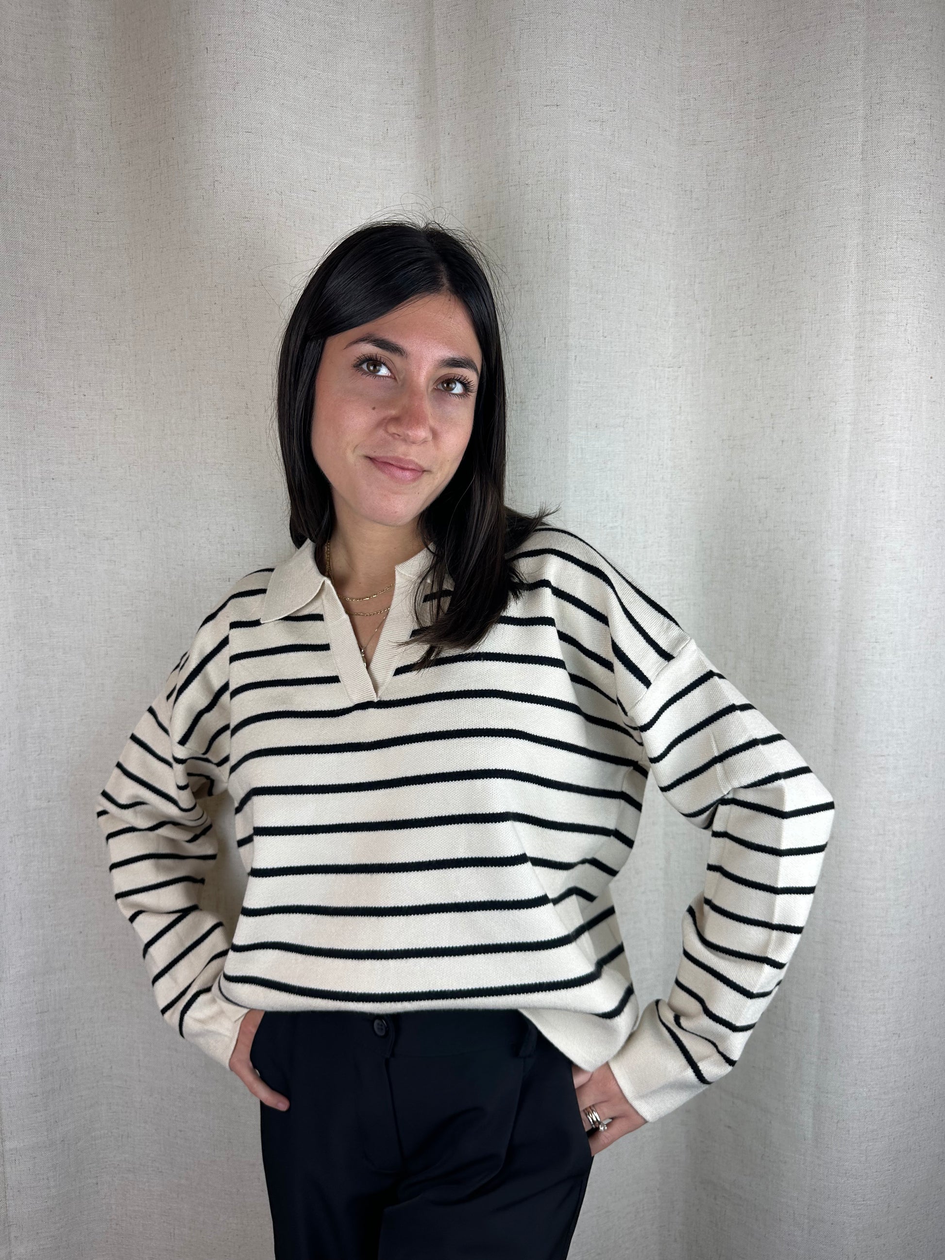 Maglioncino a righe panna e nero con scollo a polo, 50% viscosa 25% poliestere 22% nylon.