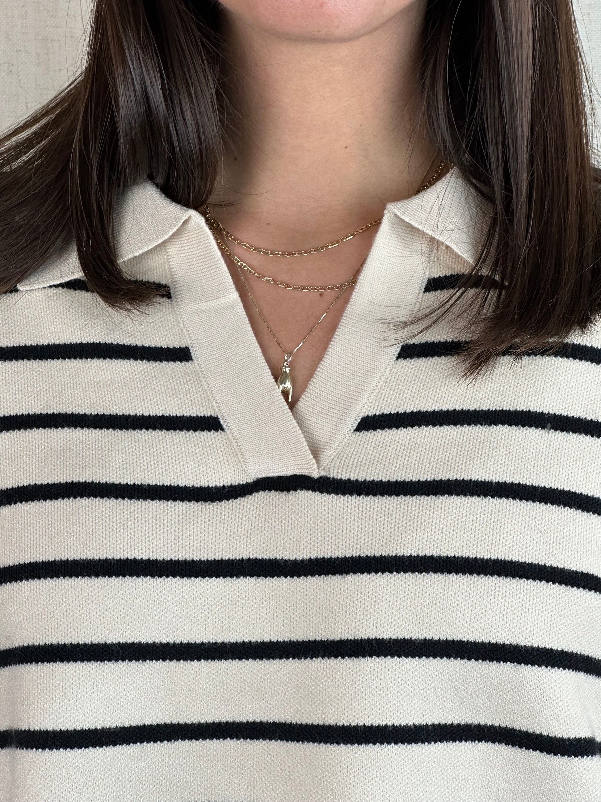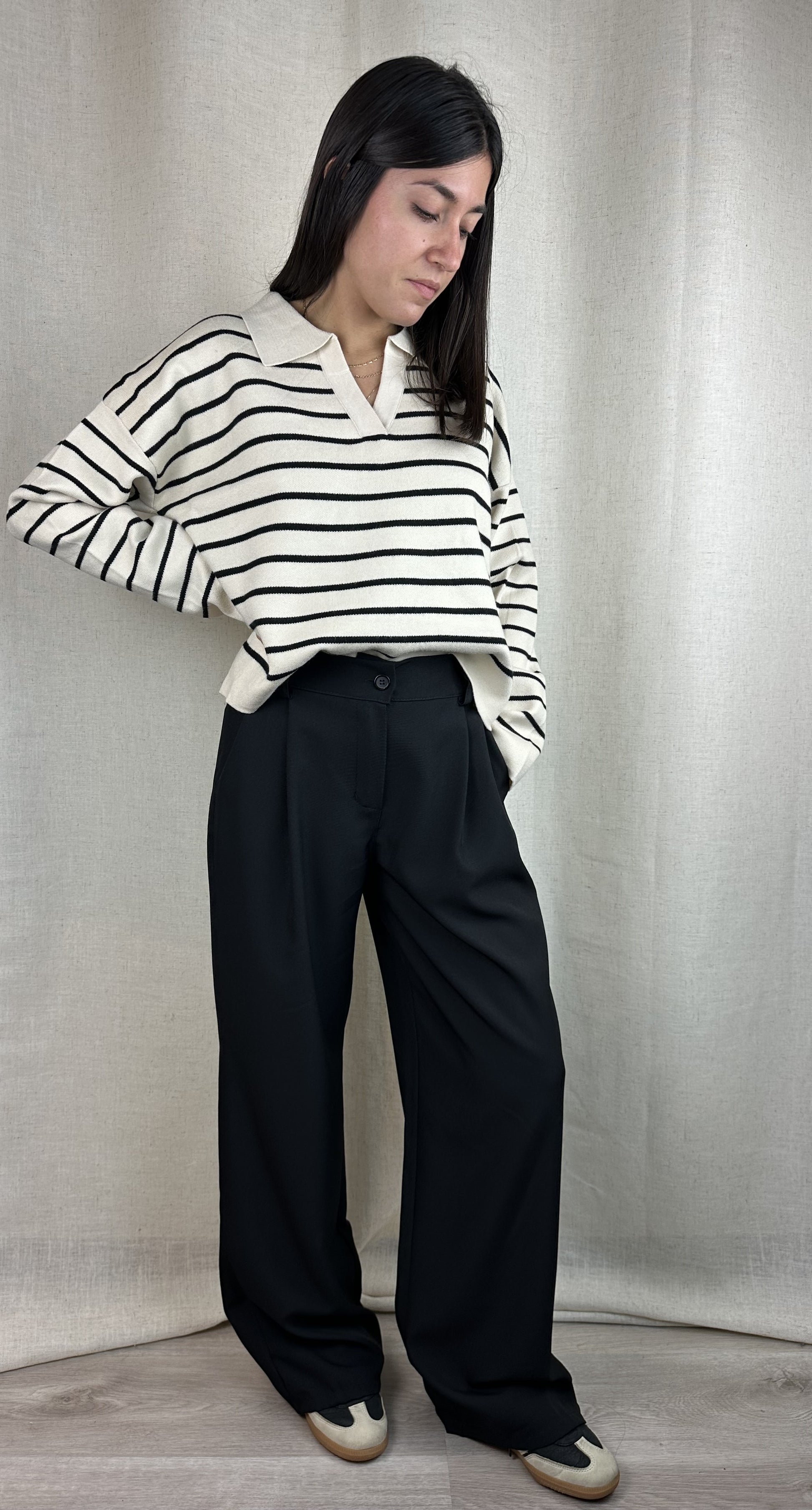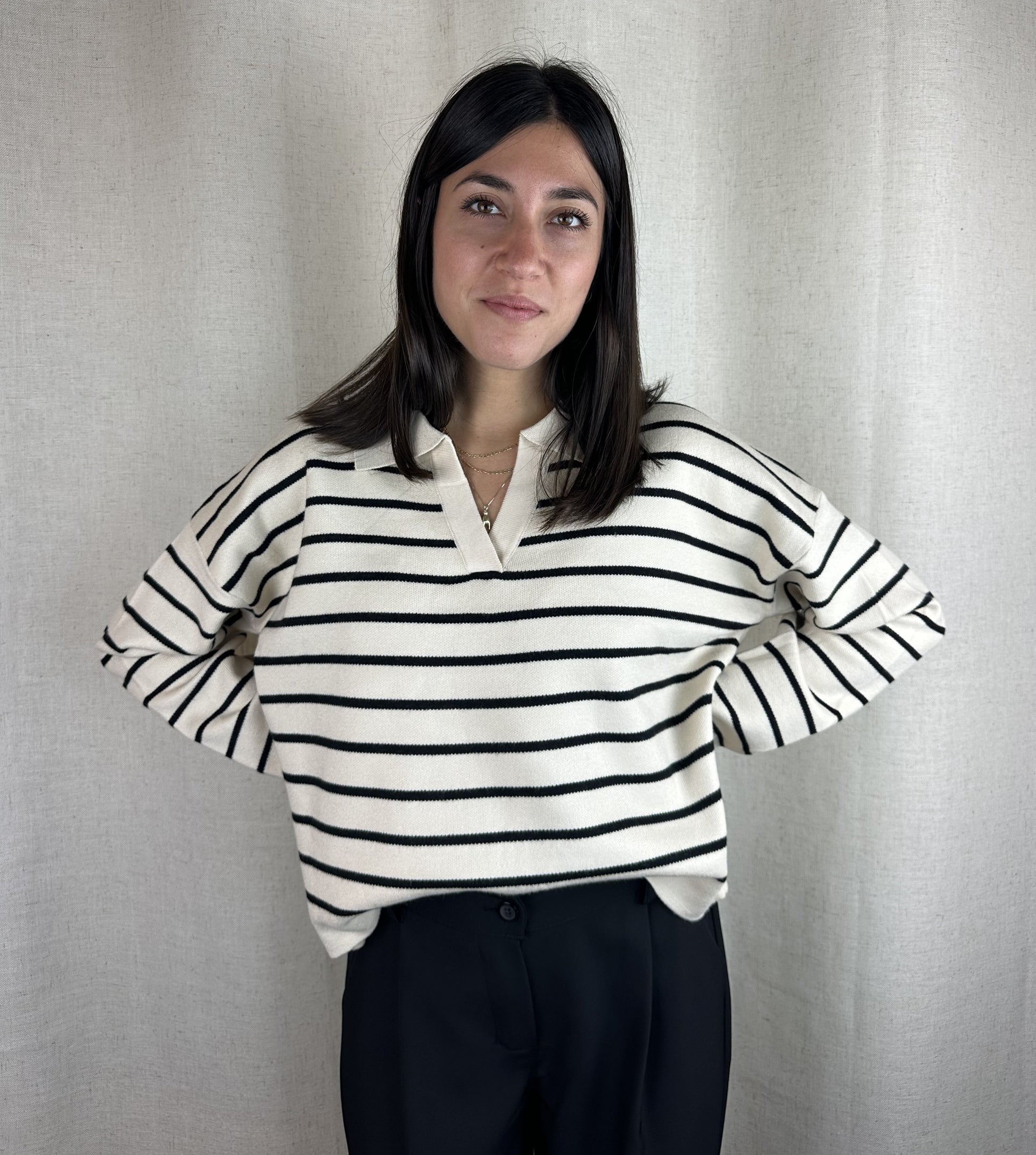 Maglioncino a righe panna e nero con scollo a polo, 50% viscosa 25% poliestere 22% nylon.