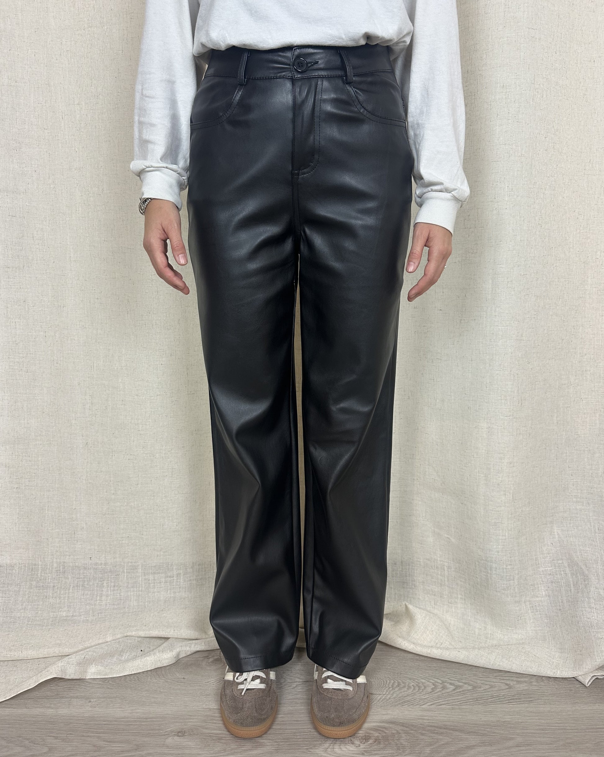 pantalone lungo in ecopelle a palazzo, vita alta, chiusura con bottone, vestibilità precisa (potete prendere anche una taglia in più), 60% poliuretano 40% poliestere, colore nero.