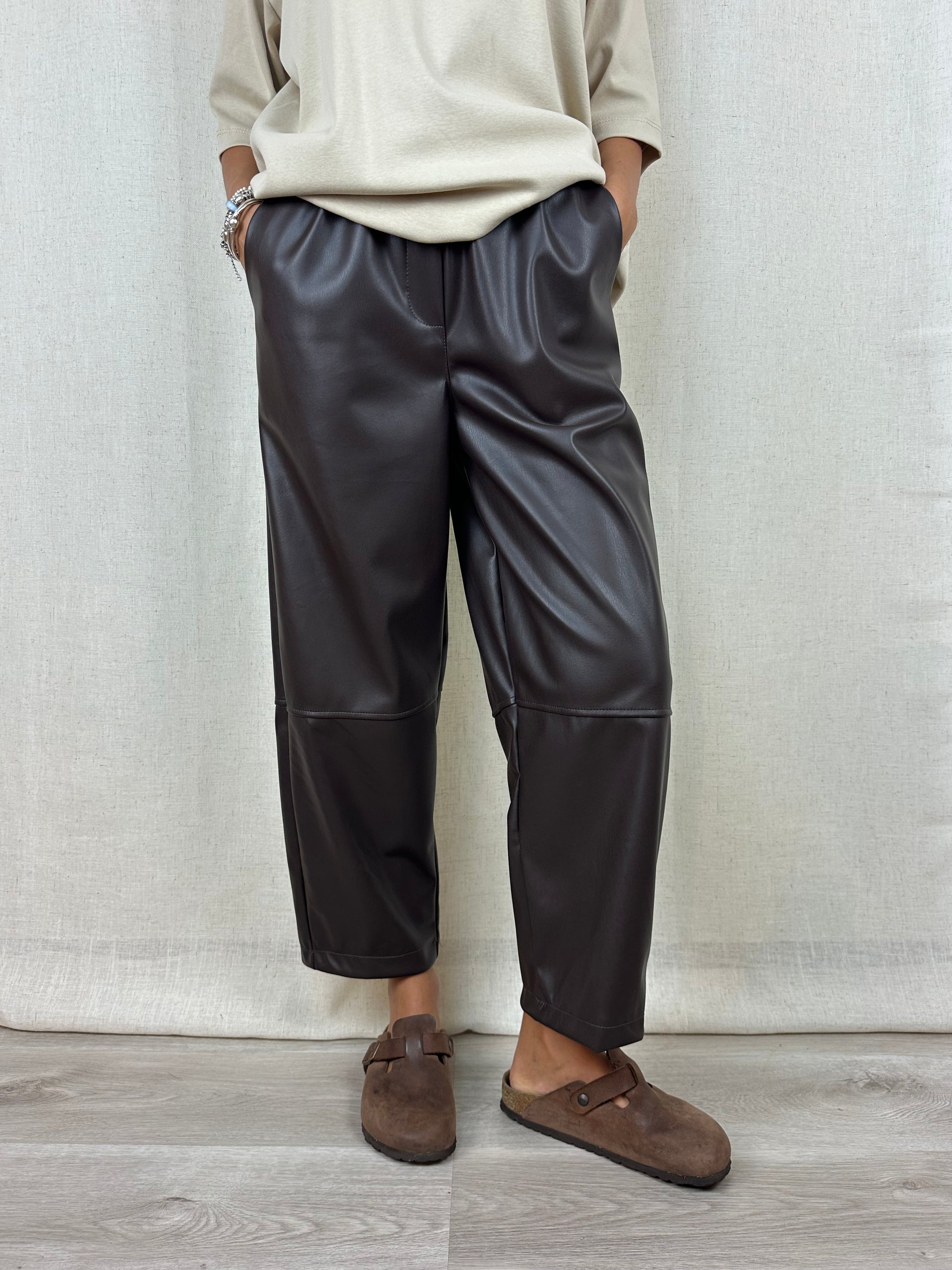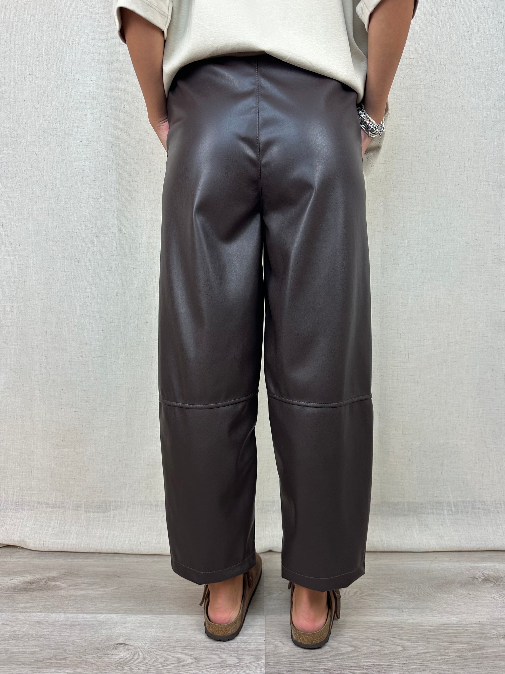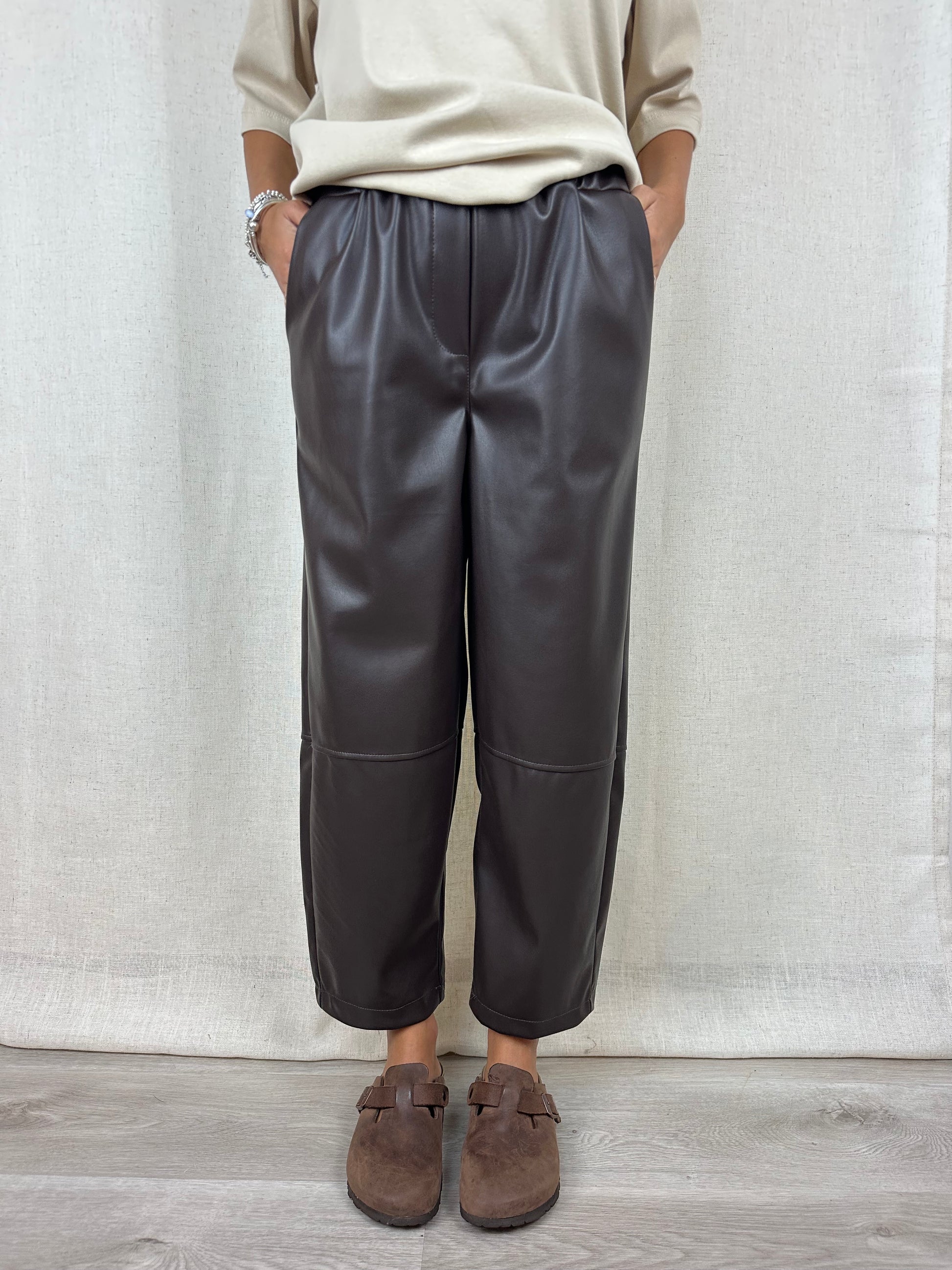 Pantalone in ecopelle marrone, gamba dritta, lunghezza caviglia, elastico in vita e tasche.
