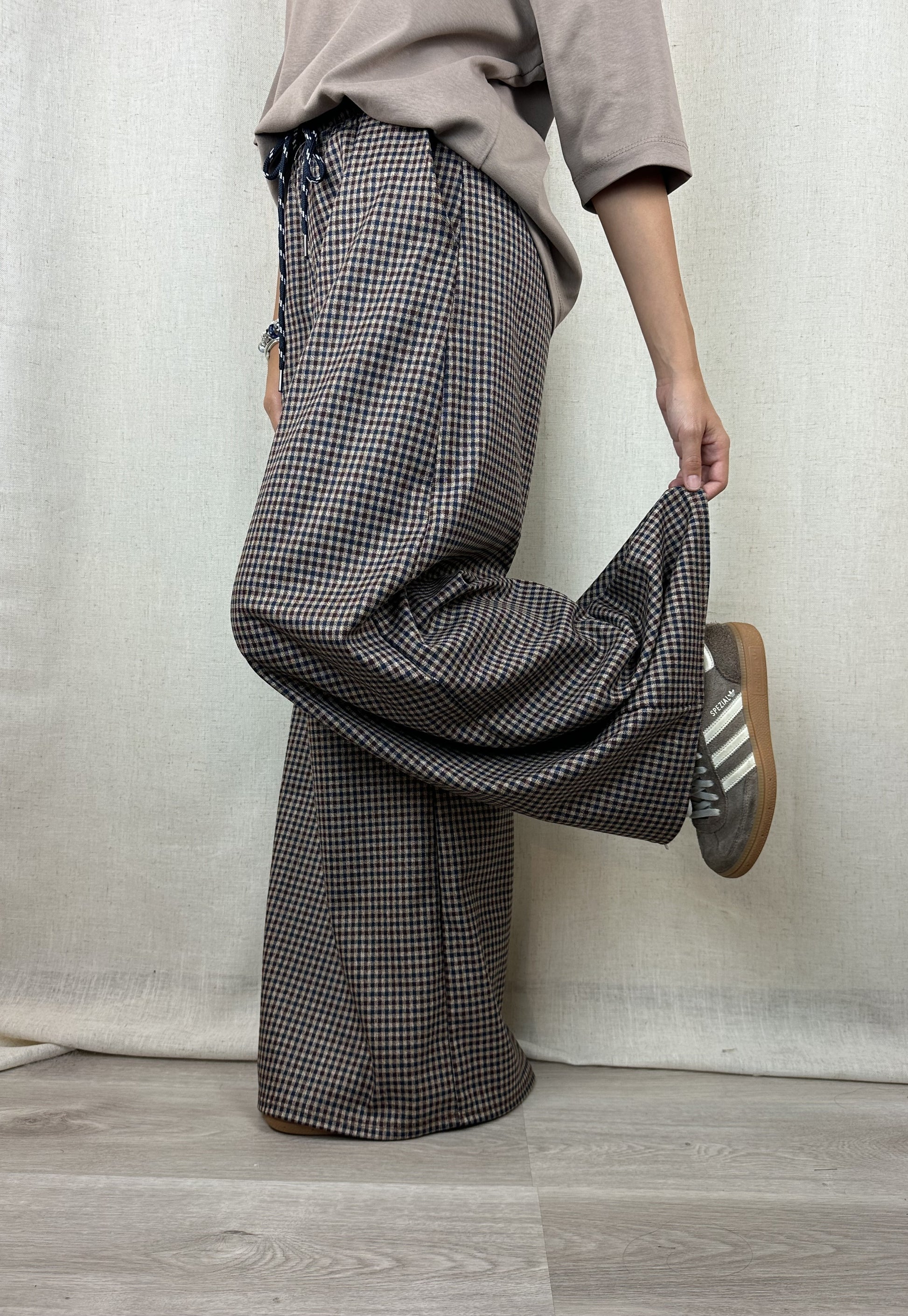 Pantaloni fantasia principe di galles, a palazzo con elastico e coulisse in vita.