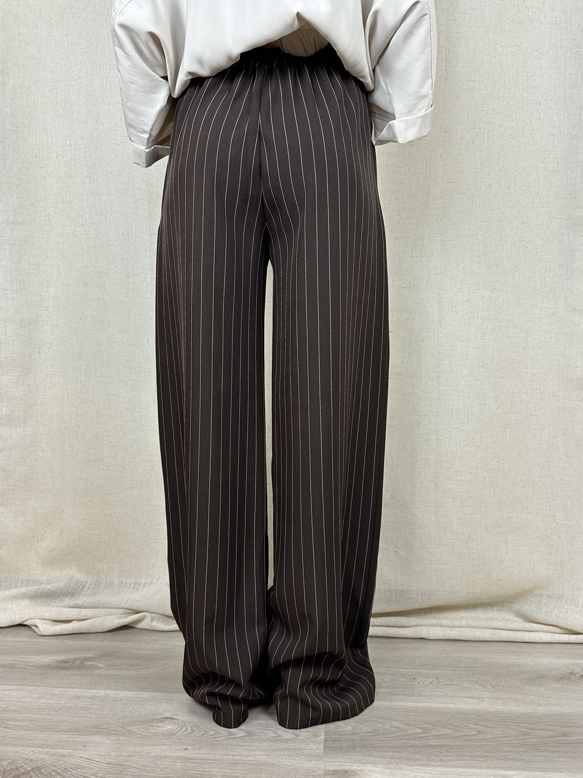 Pantaloni marrone gessati 95% poliestere 5% elastan, tasche ed elastico in vita della parte dietro, chiusura con bottone e zip.