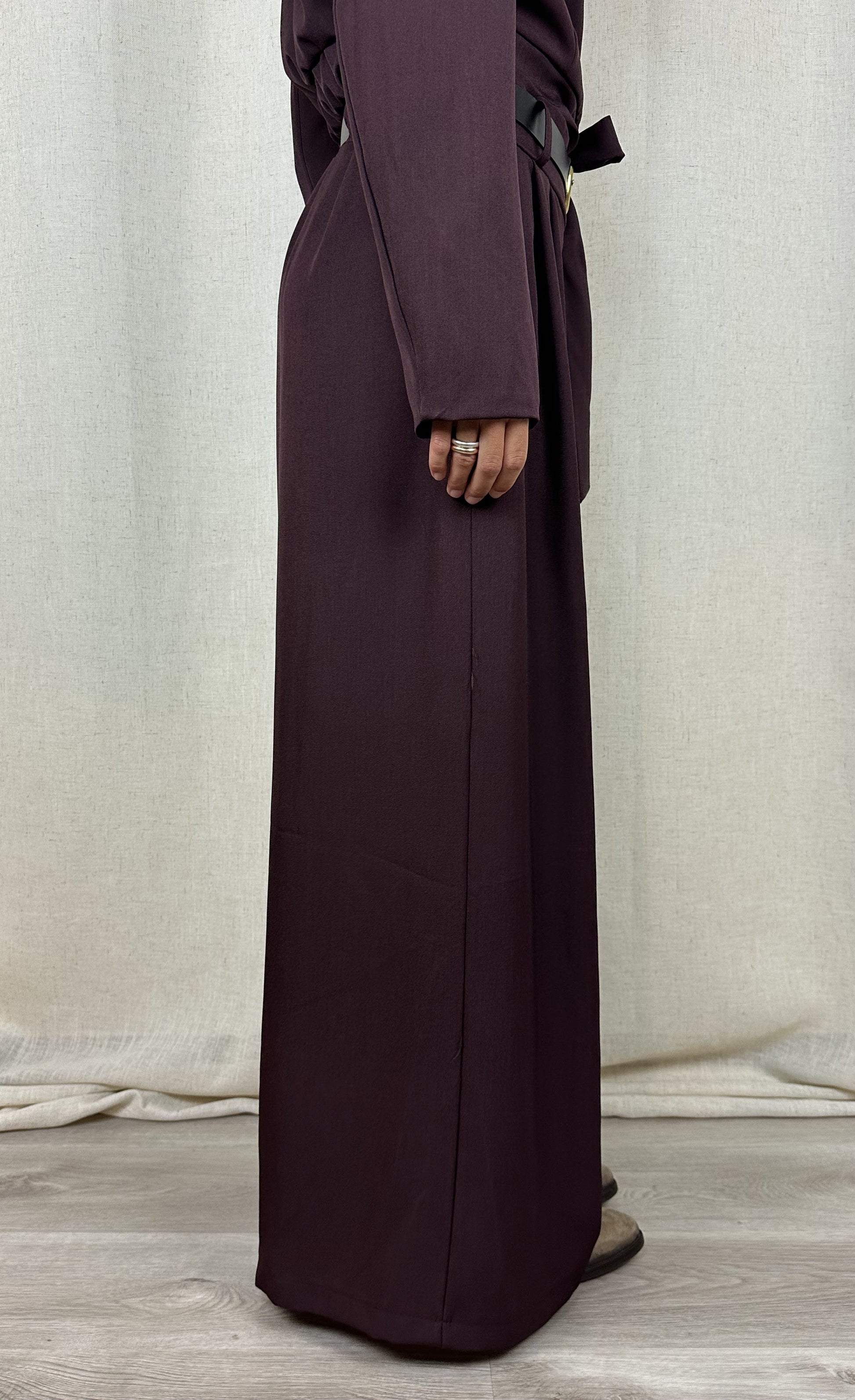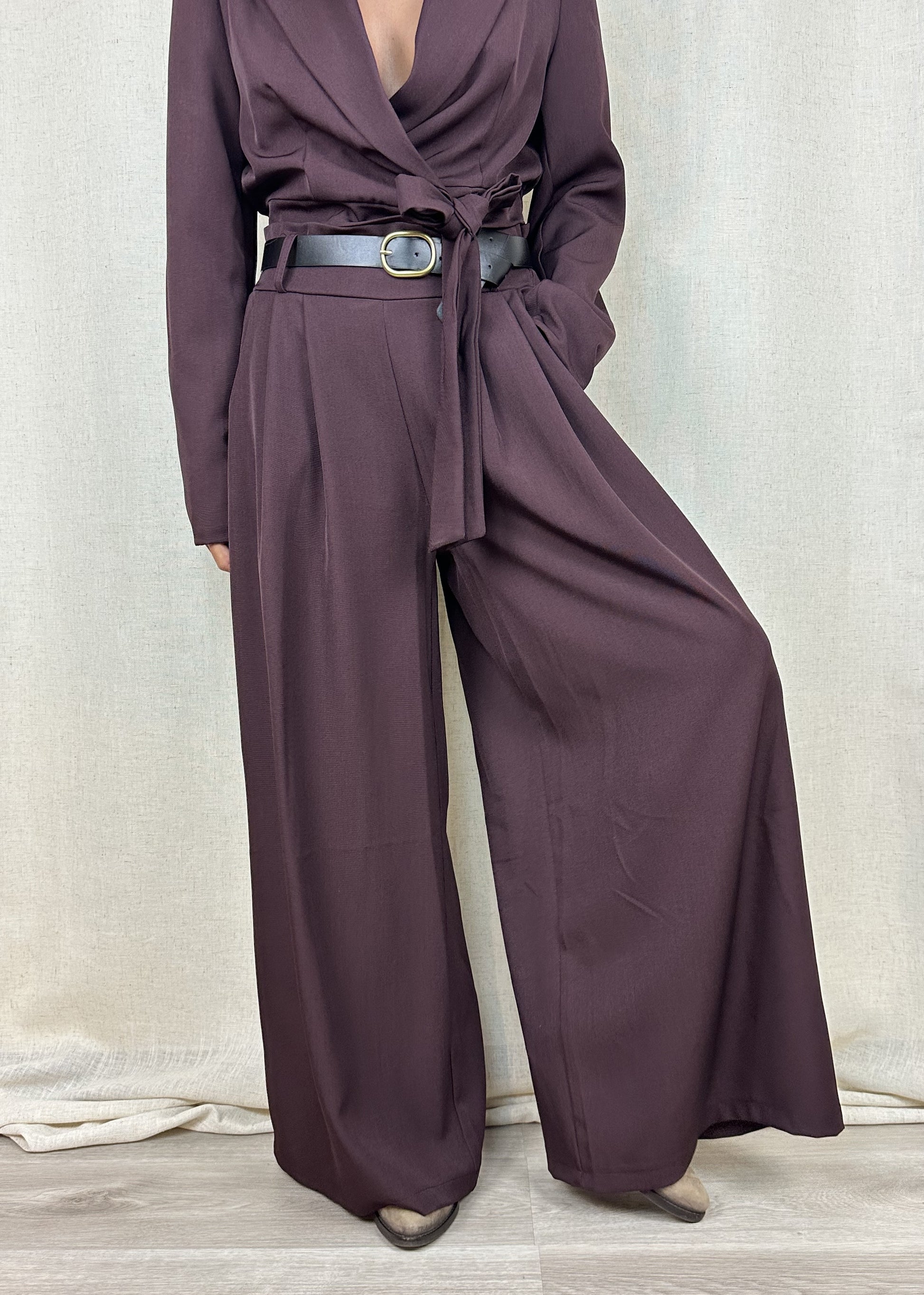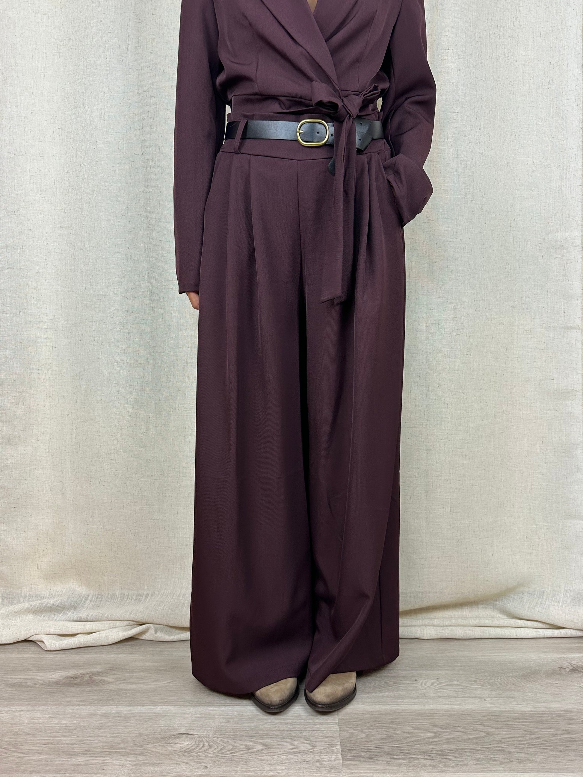 Pantaloni color vinaccia a palazzo (effetto gonna), 95% poliestere 5% elastan.