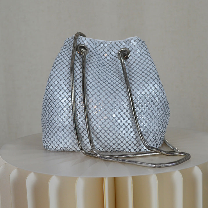 mini secchiello in piastrine di metallo, chiusura con bottone automatico, tracolla in metallo color argento scorrevole da portarla sia a tracolla che a spalla, colore bianco.
