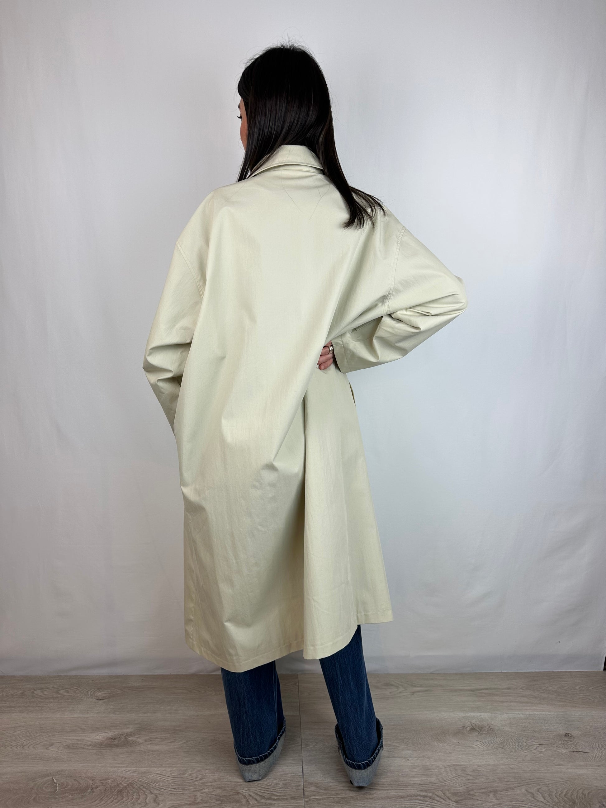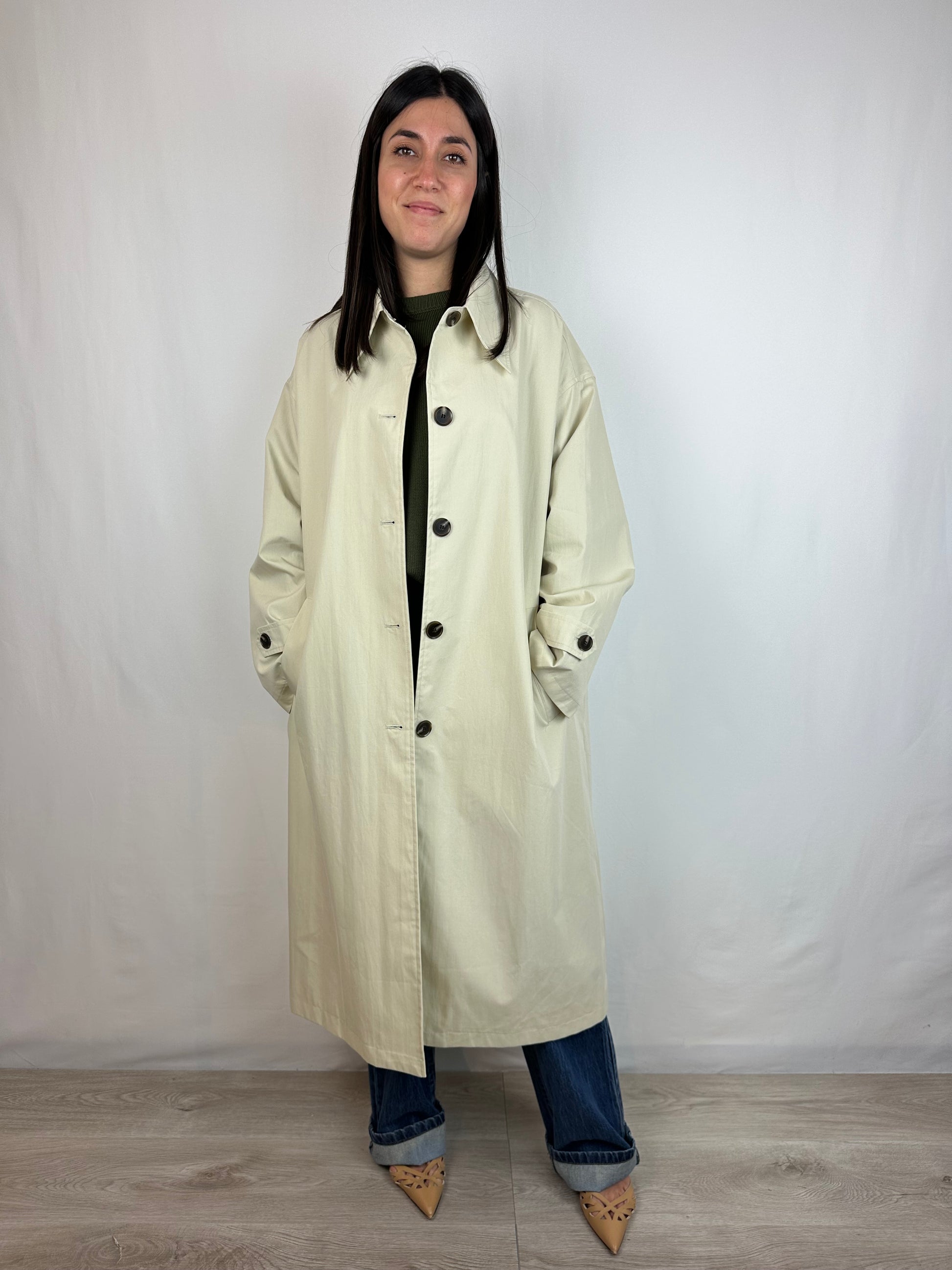 Lunghezza 3/4 , tasche e chiusura con bottoni.