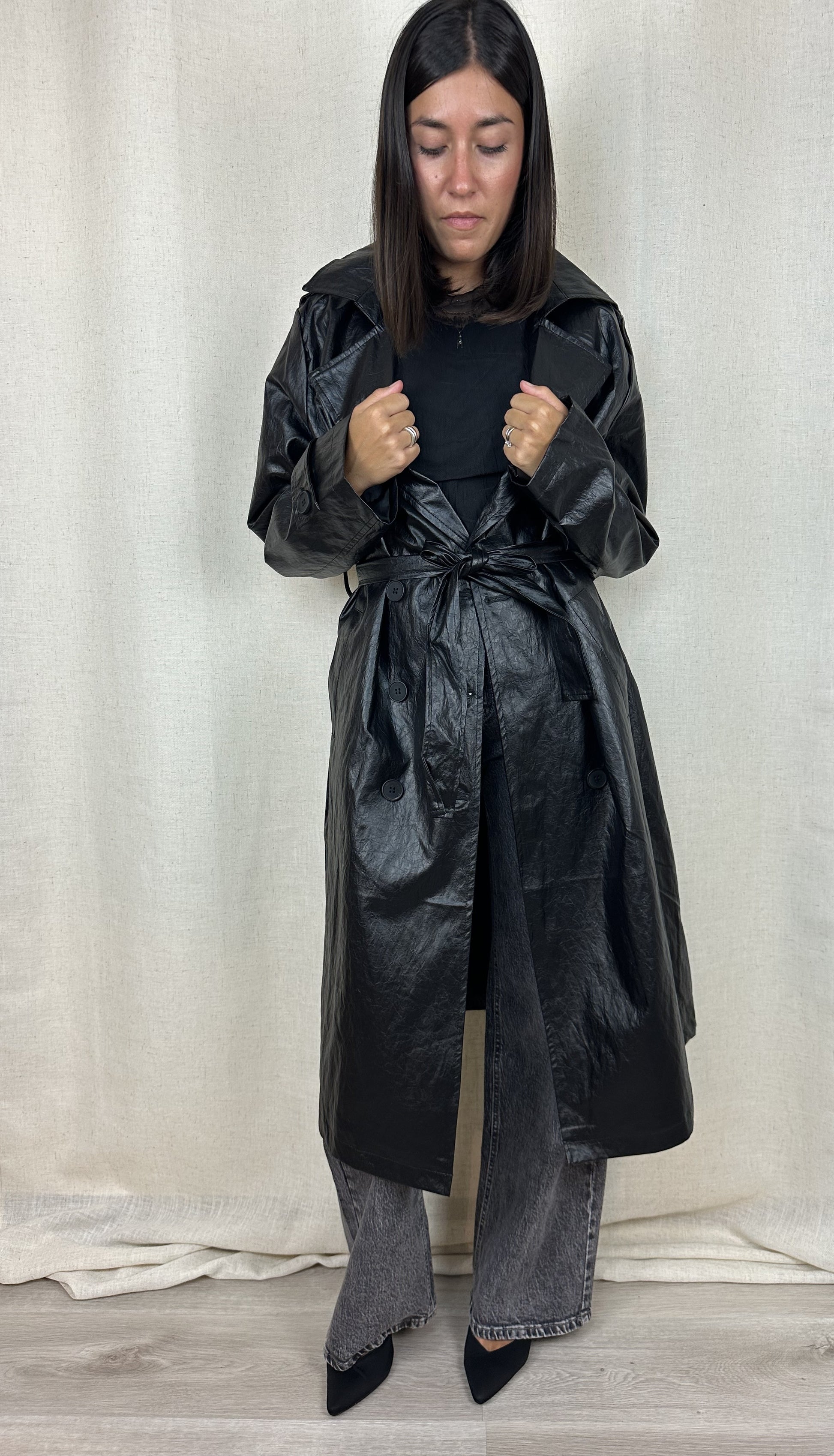 Trench nero in ecopelle effetto invecchiato, con fodera interna, 55% poliestere 45% poliuretano.